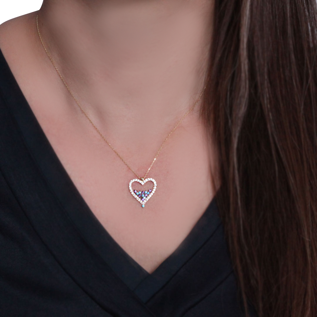 Mavi, mor ve beyaz enerji dolu zirkon taş kombinasyonu ile oldukça şık ve havalı bir duruşa sahip kalpli altın kolyeyle günlük stiline ışıltı katmaya hazır mısın? Sevdiklerinize armağan edeceğiniz harika bir tasarım! Model boyutu 2 Cm'dir, 14 ayar altın kendinden zincirli kolyemiz 2.05 gram ağırlığındadır.