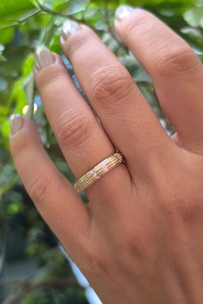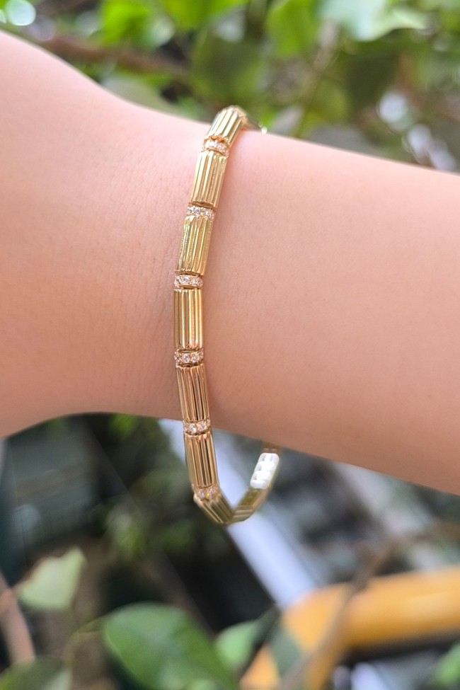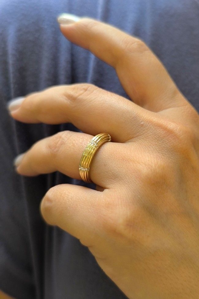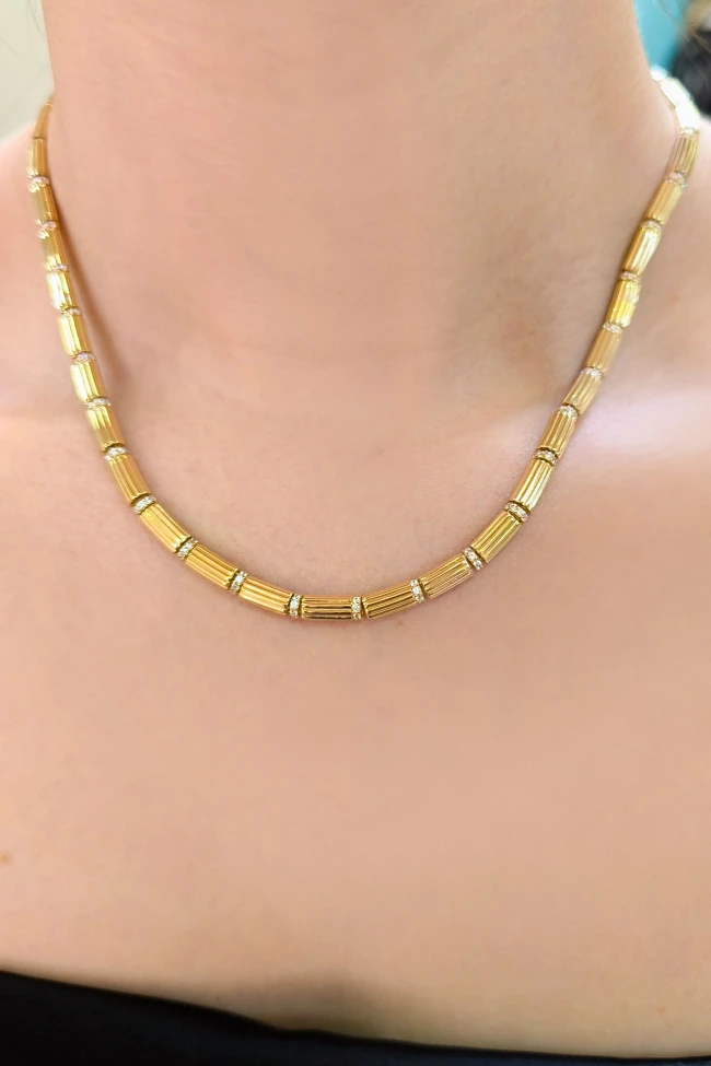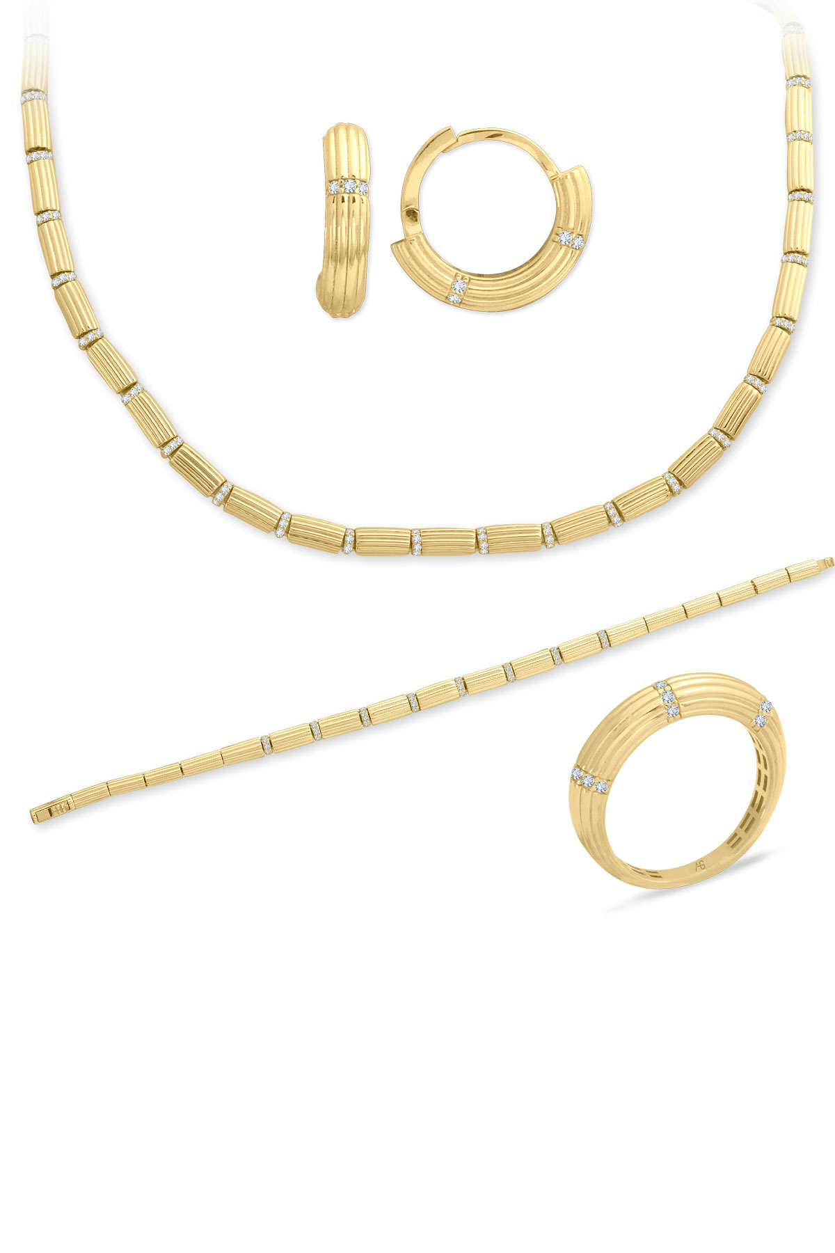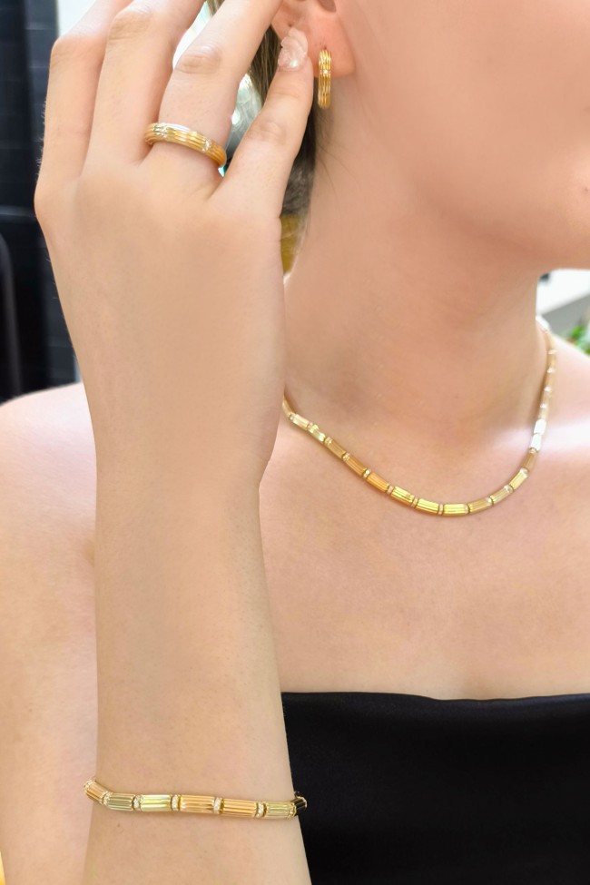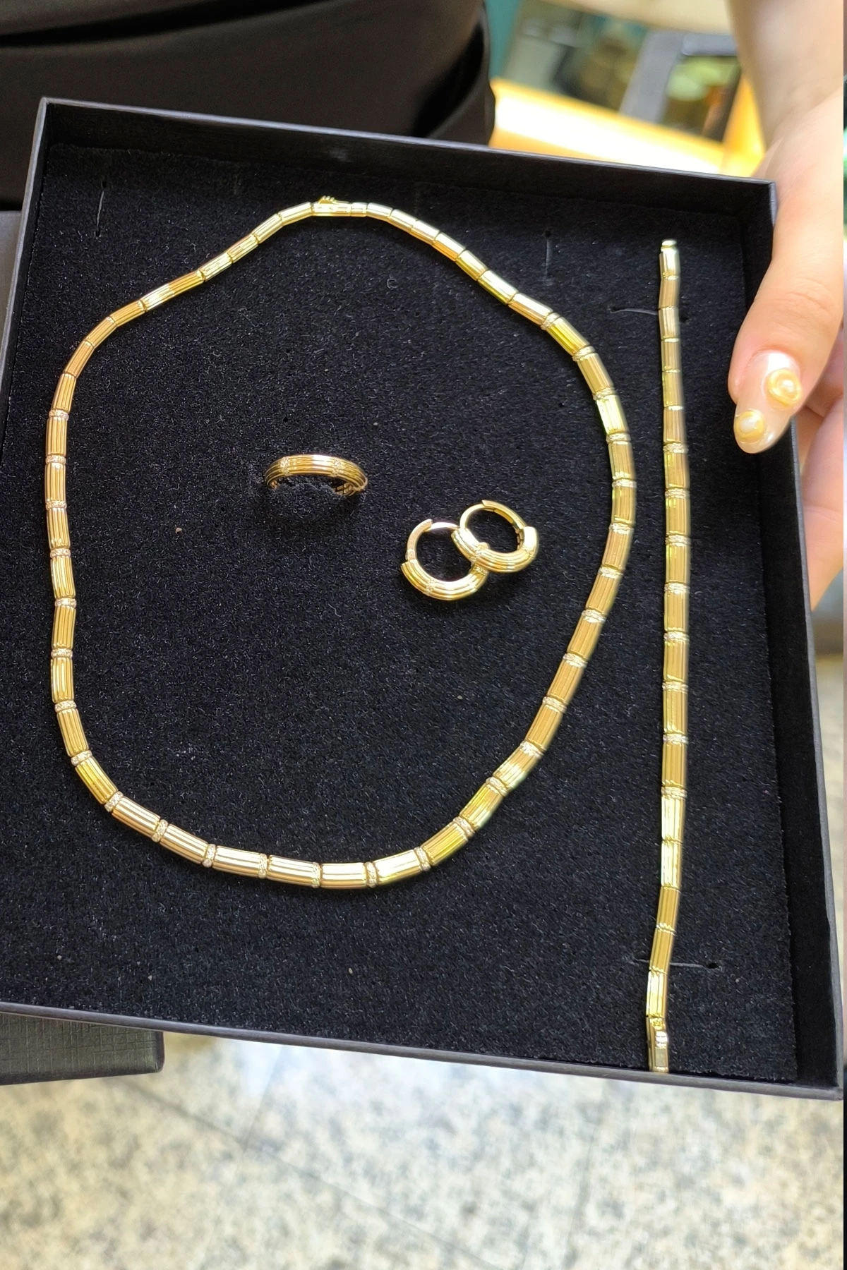 14 Ayar şık ve modern tasarım günlük kullanıma uygun taşsız ışıl ışıl geometrik sade tasarım 41.50 gram ağırlığında altın gerdanlık, bileklik, küpe ve yüzükten oluşan dört parçalı düğün nişan takı seti.