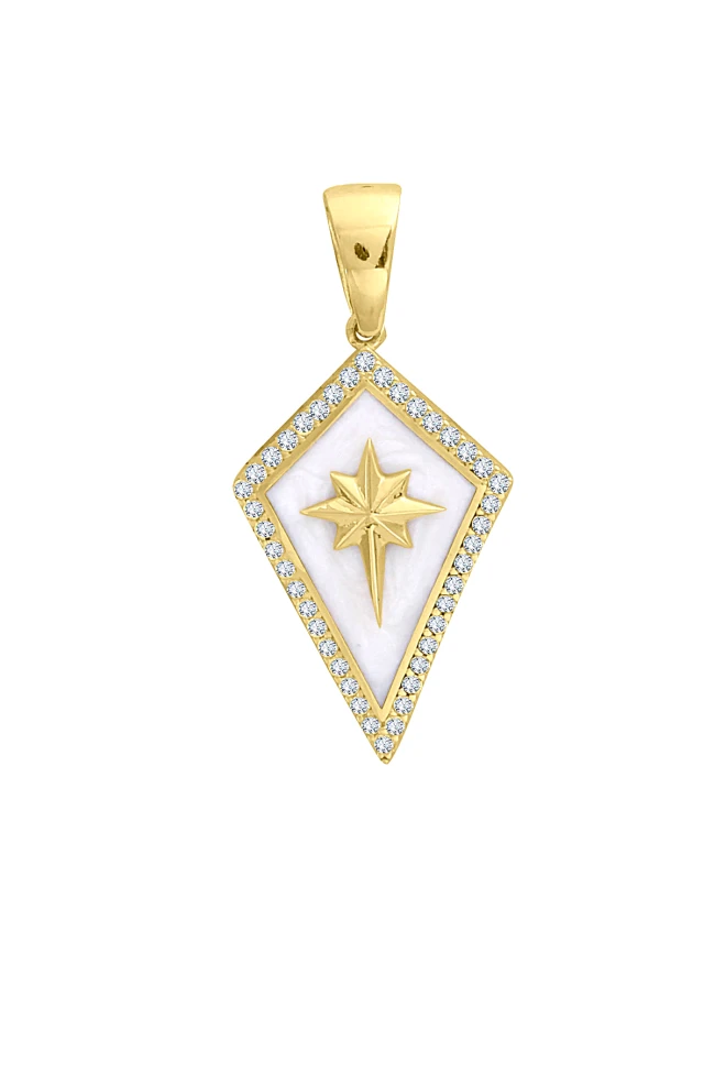 14 Ayar altın 3.70 gram ağırlığında şık ve gündelik kullanıma uygun 3.5 cm boyunda zirkon taşlı beyaz mineli kuzey yıldızı kolye ucu.