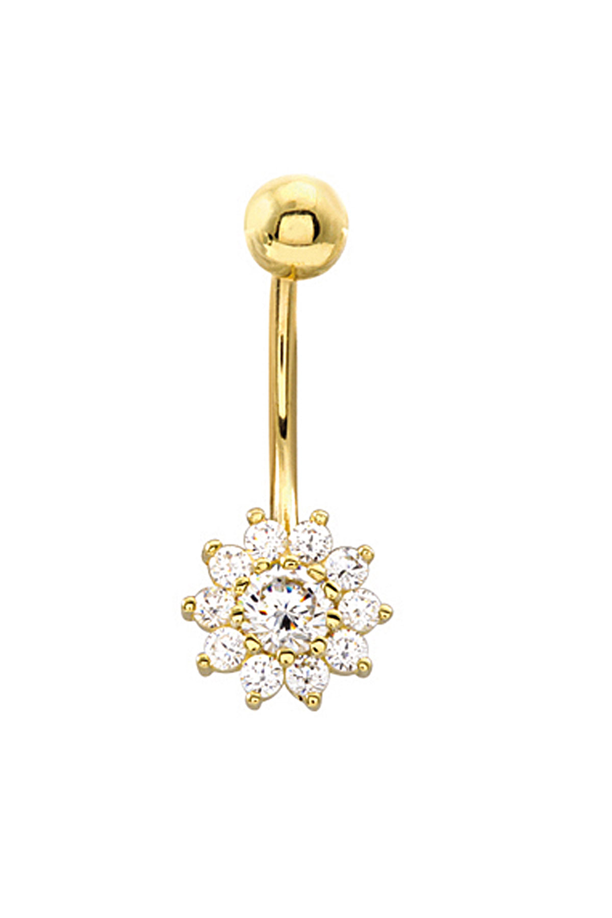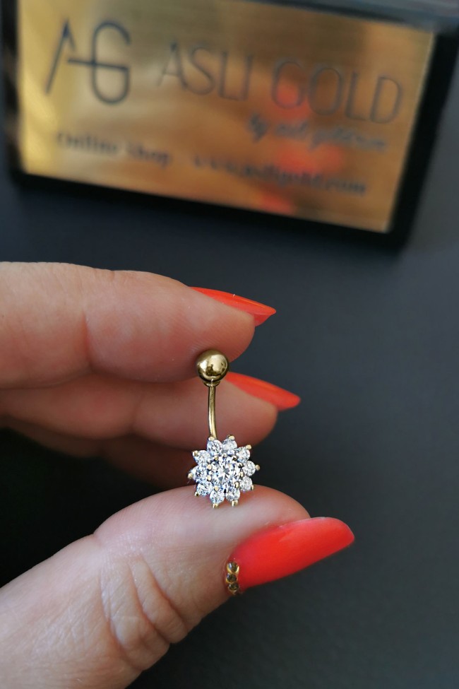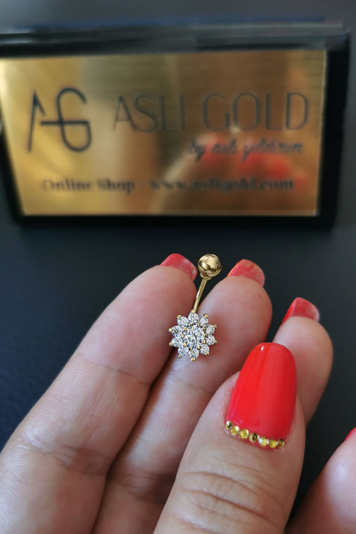 Zirkon Taşlı Işıl Işıl Modern Duruşlu Çiçek Model 14 Ayar Altın Göbek Piercingi.