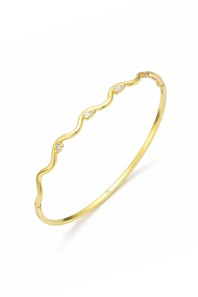 Bazen en zarif detaylar, en unutulmaz anlara eşlik eder… Bu ince 14 ayar altın taşlı bilezik, dalga formundaki modern tasarımı ve ışıltılı taşlarıyla her harekette ışığı yakalayarak göz kamaştırır. Minimal ama etkileyici duruşu sayesinde ister günlük kombinlerde ister özel davetlerde stilinizi tamamlayan ince bir dokunuş olur.