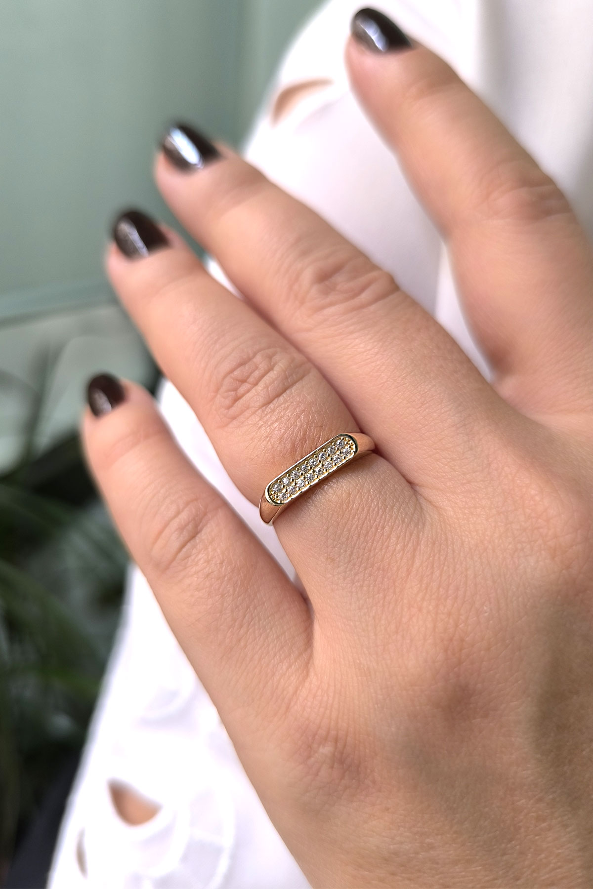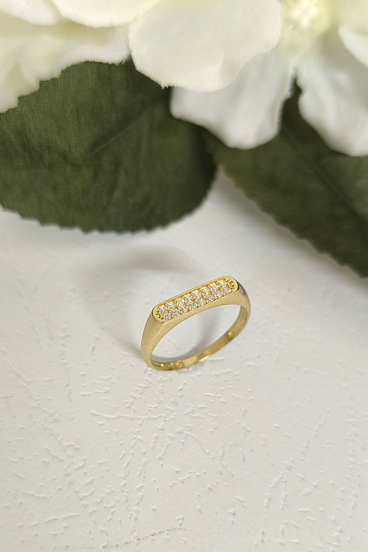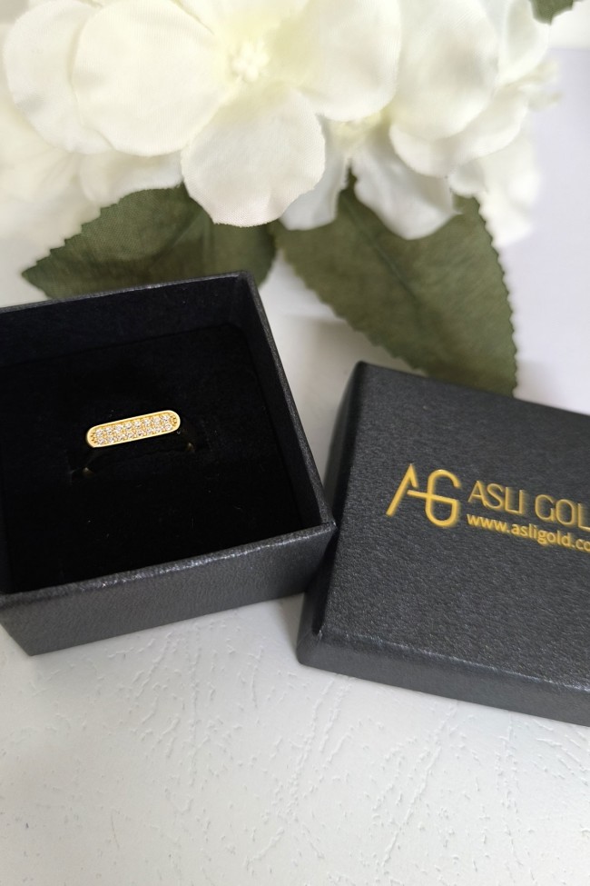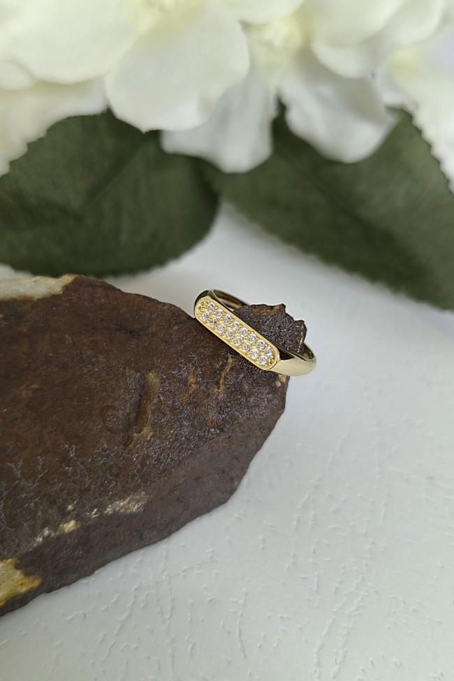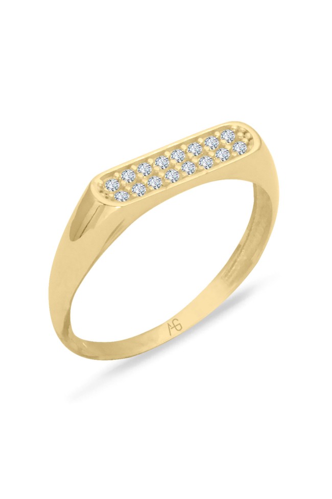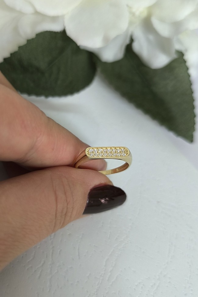 14 ayar sarı altın taşlı çubuk tasarımıyla günlük kullanıma uygun 1.65 gram ağırlığında zirkon taşlı tasarım altın kadın kombin yüzük.
