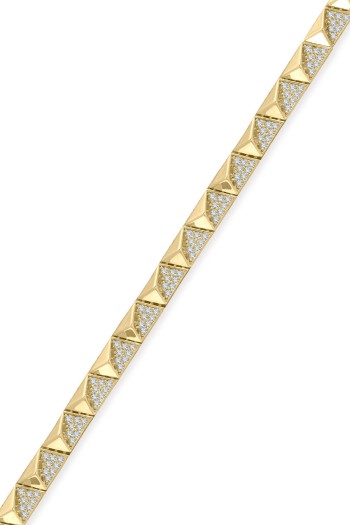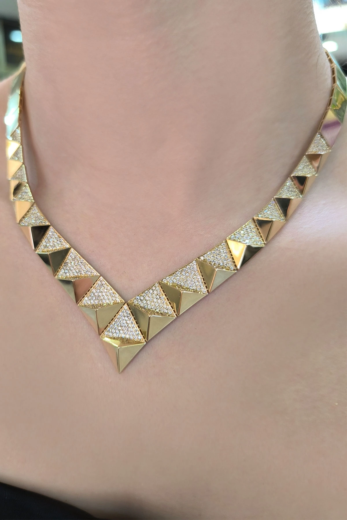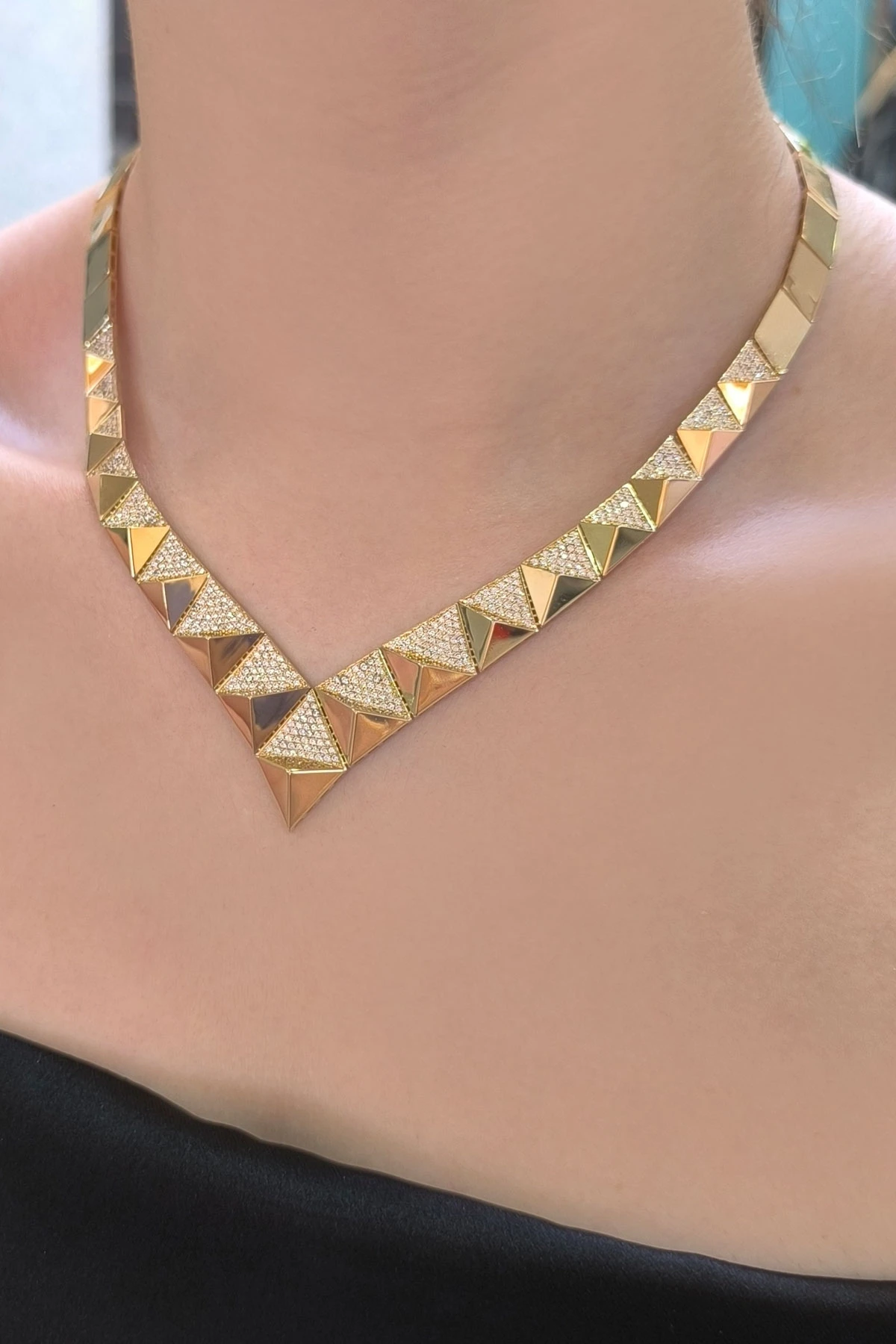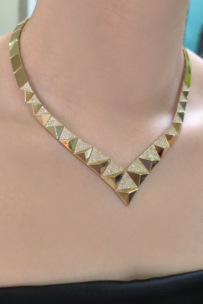 14 Ayar şık ve modern tasarım günlük kullanıma uygun taşlı ışıl ışıl özel piramit tasarım 30.90 gram ağırlığında altın gerdanlık kolye.