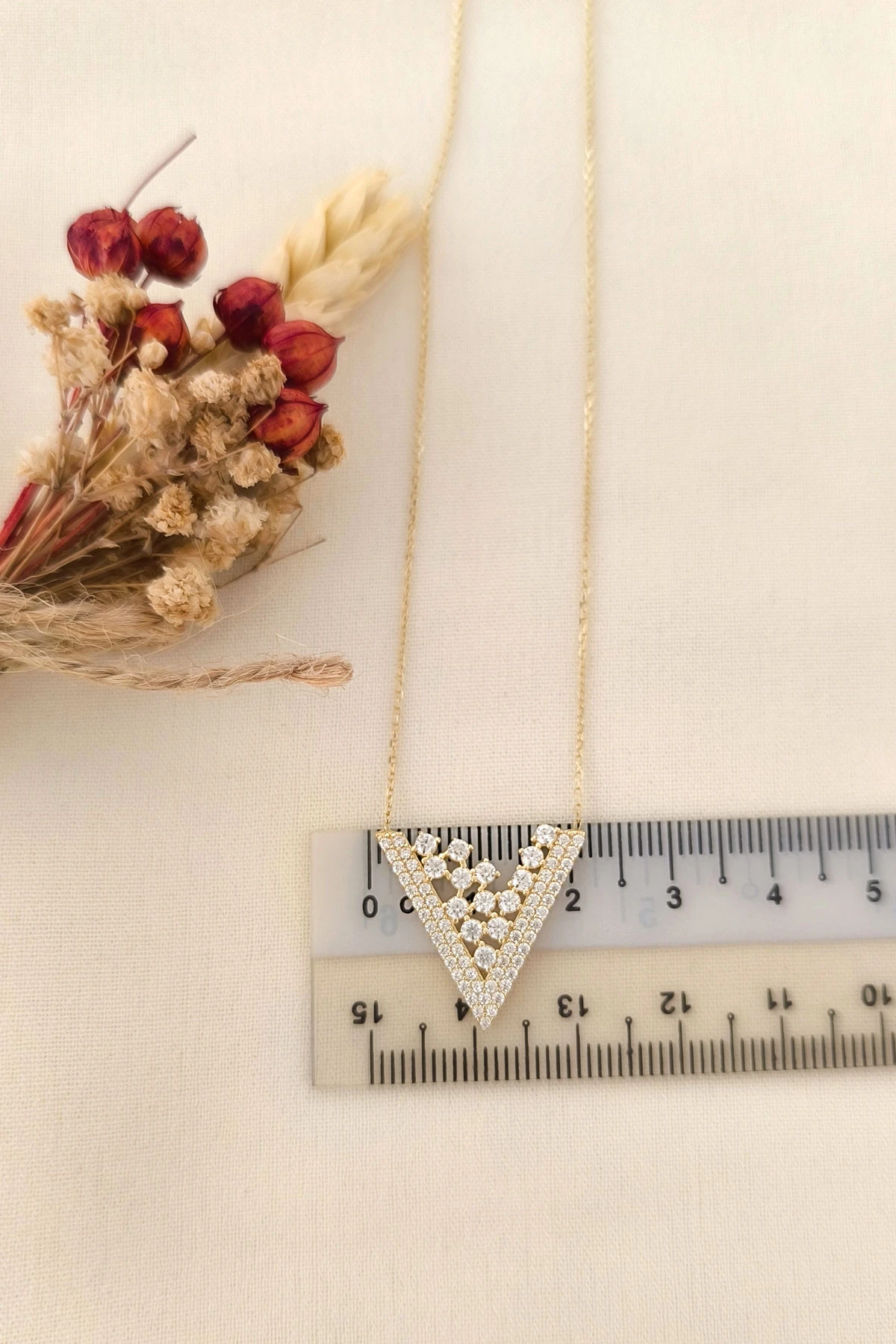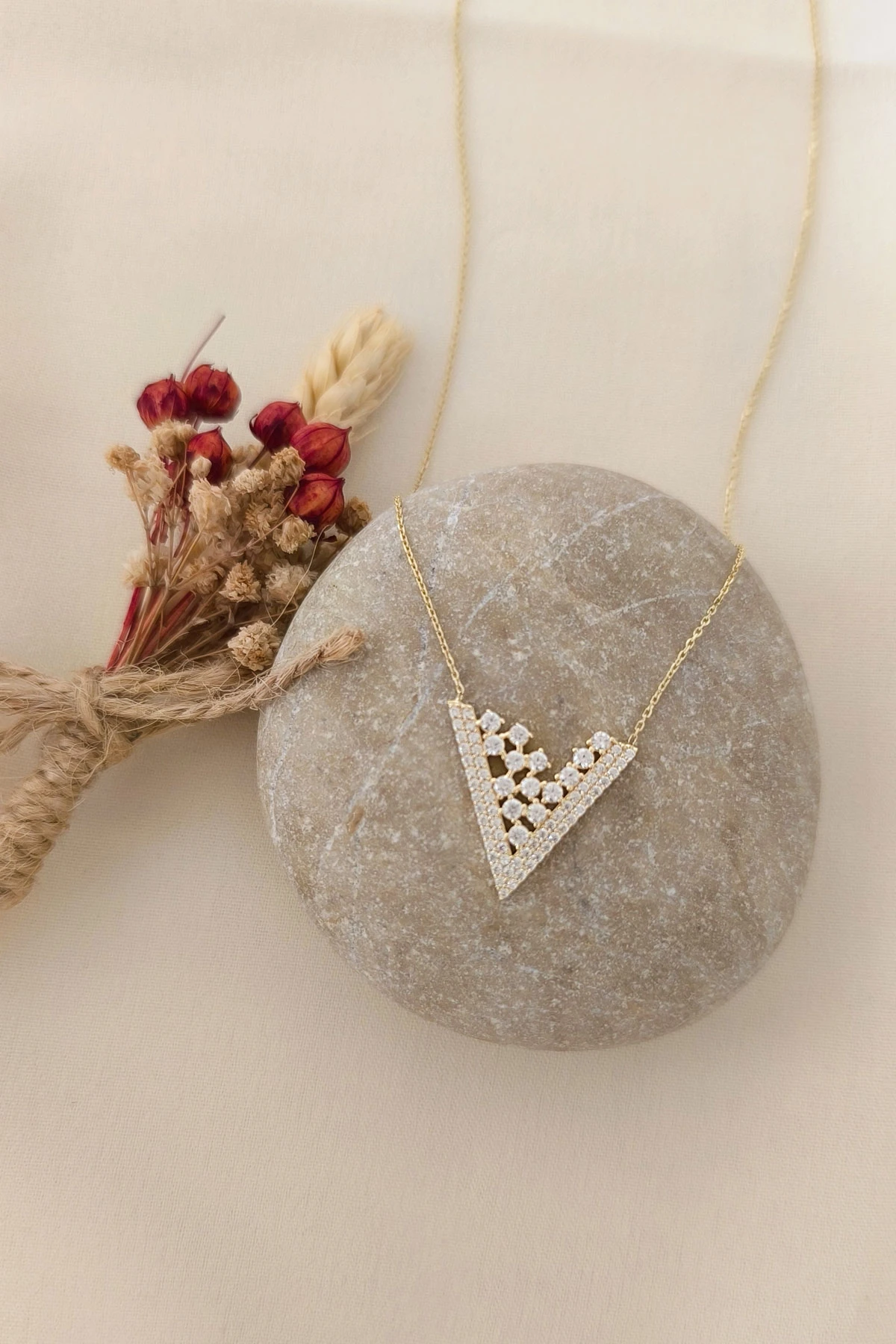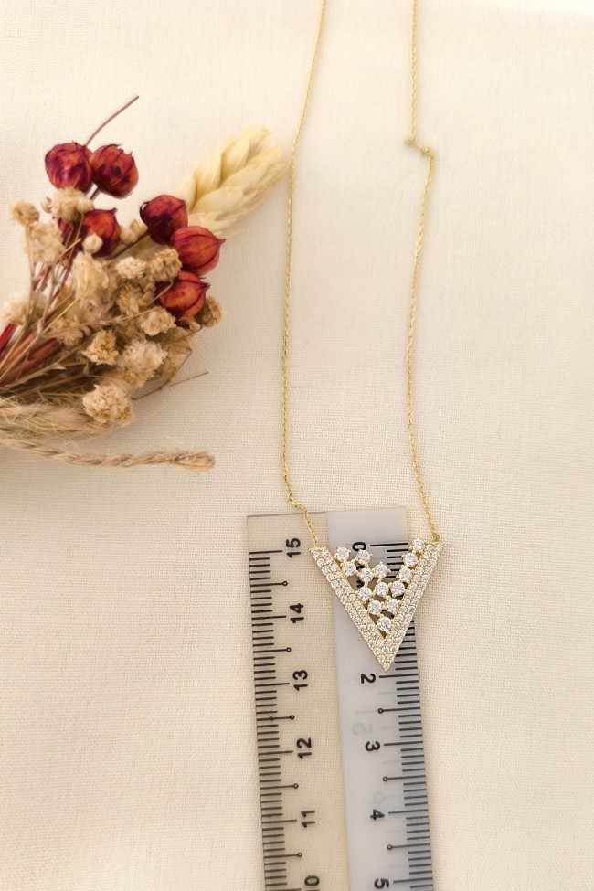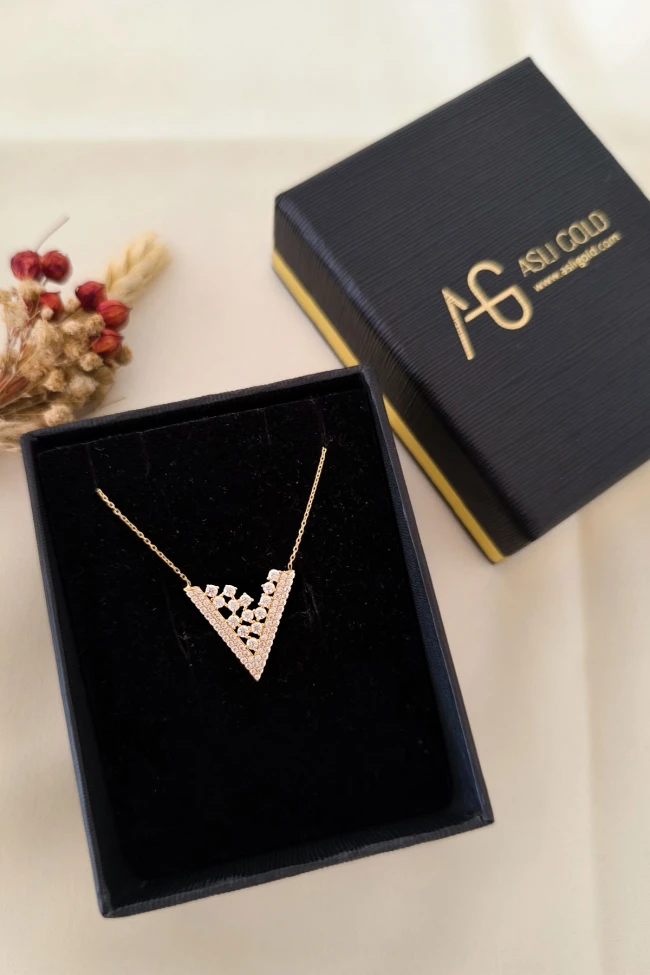 45 Cm zincirli 3.15 gr. 2 cm boyutunda zirkon taş detaylı günlük kullanıma uygun 14 ayar altın V tasarım kolye.
