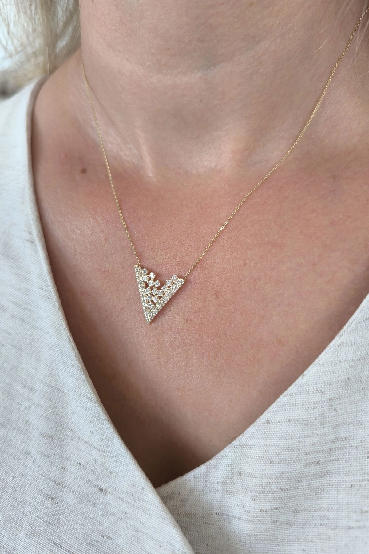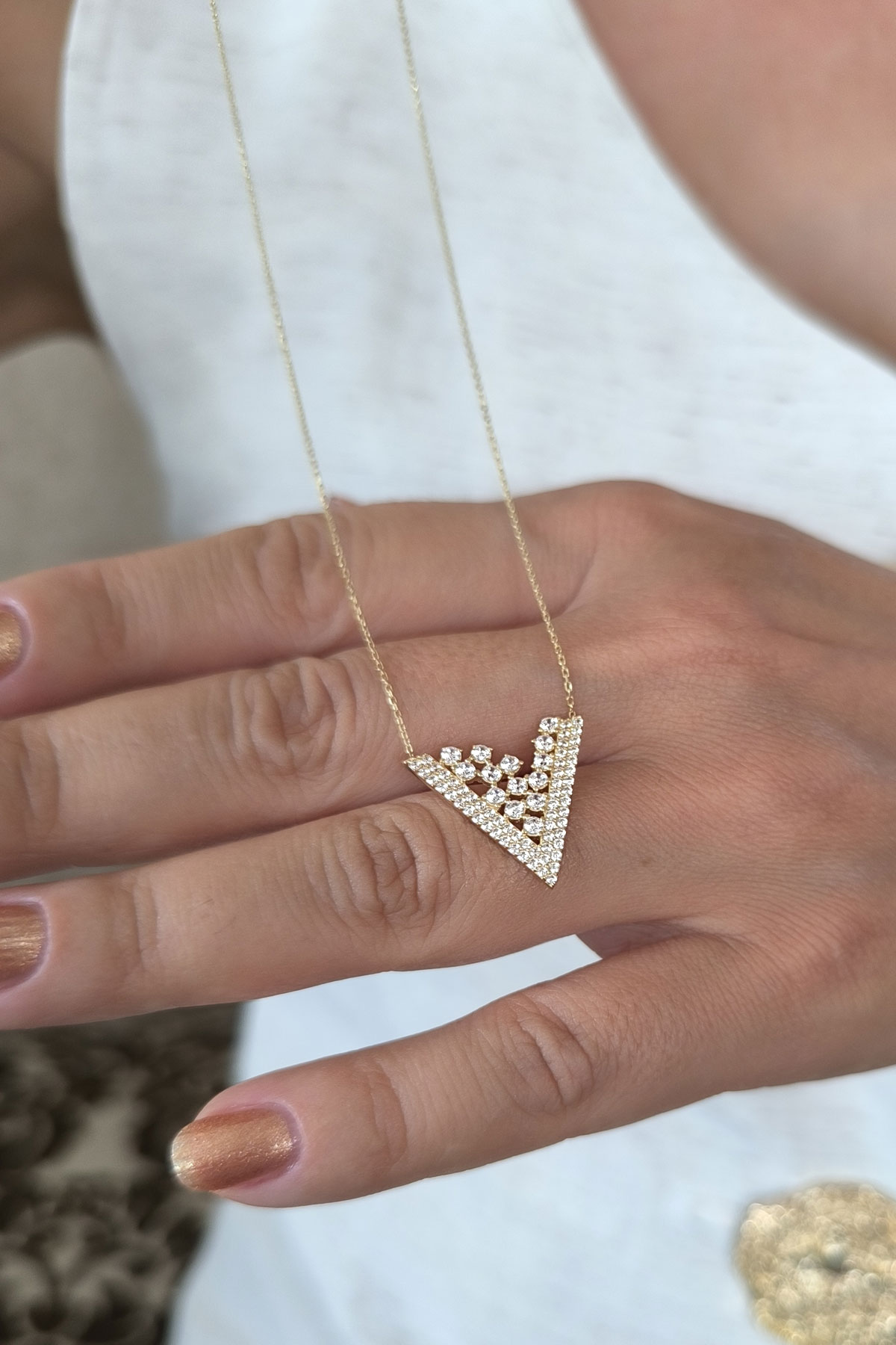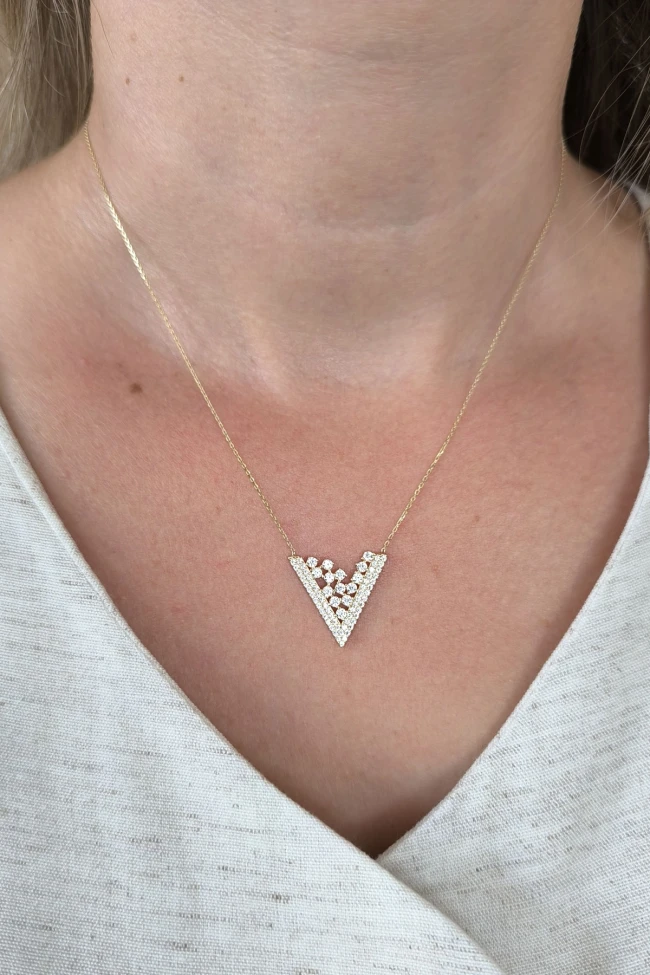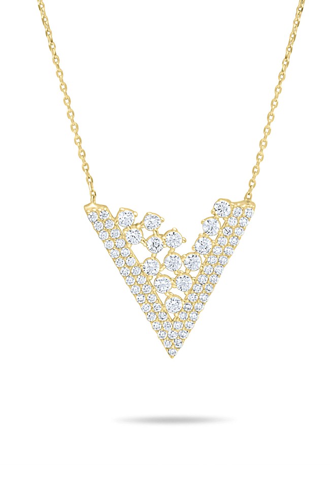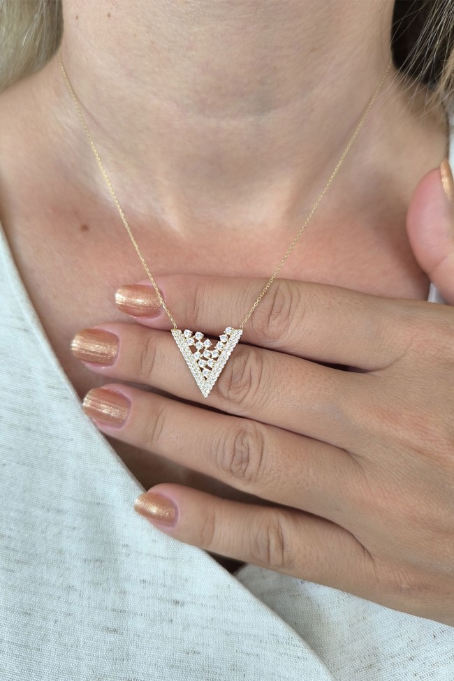 45 Cm zincirli 3.15 gr. 2 cm boyutunda zirkon taş detaylı günlük kullanıma uygun 14 ayar altın V tasarım kolye.