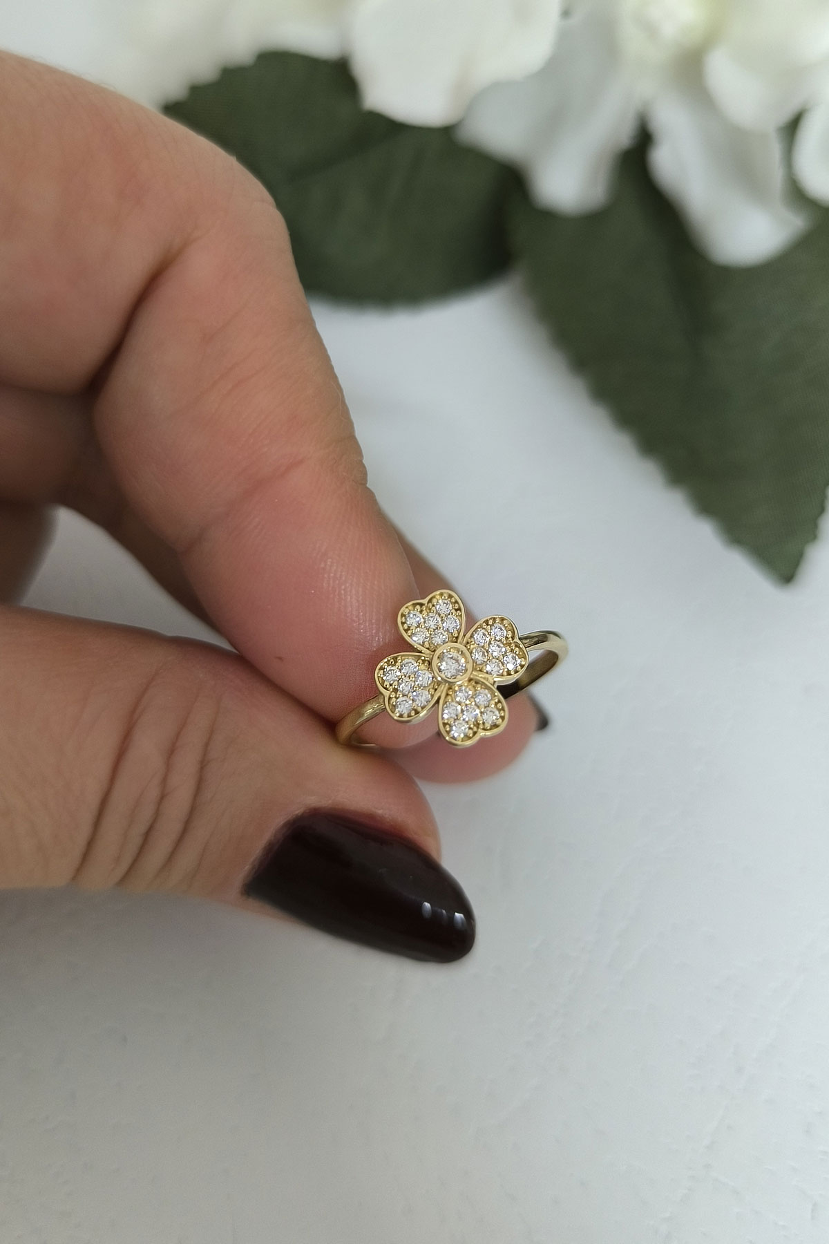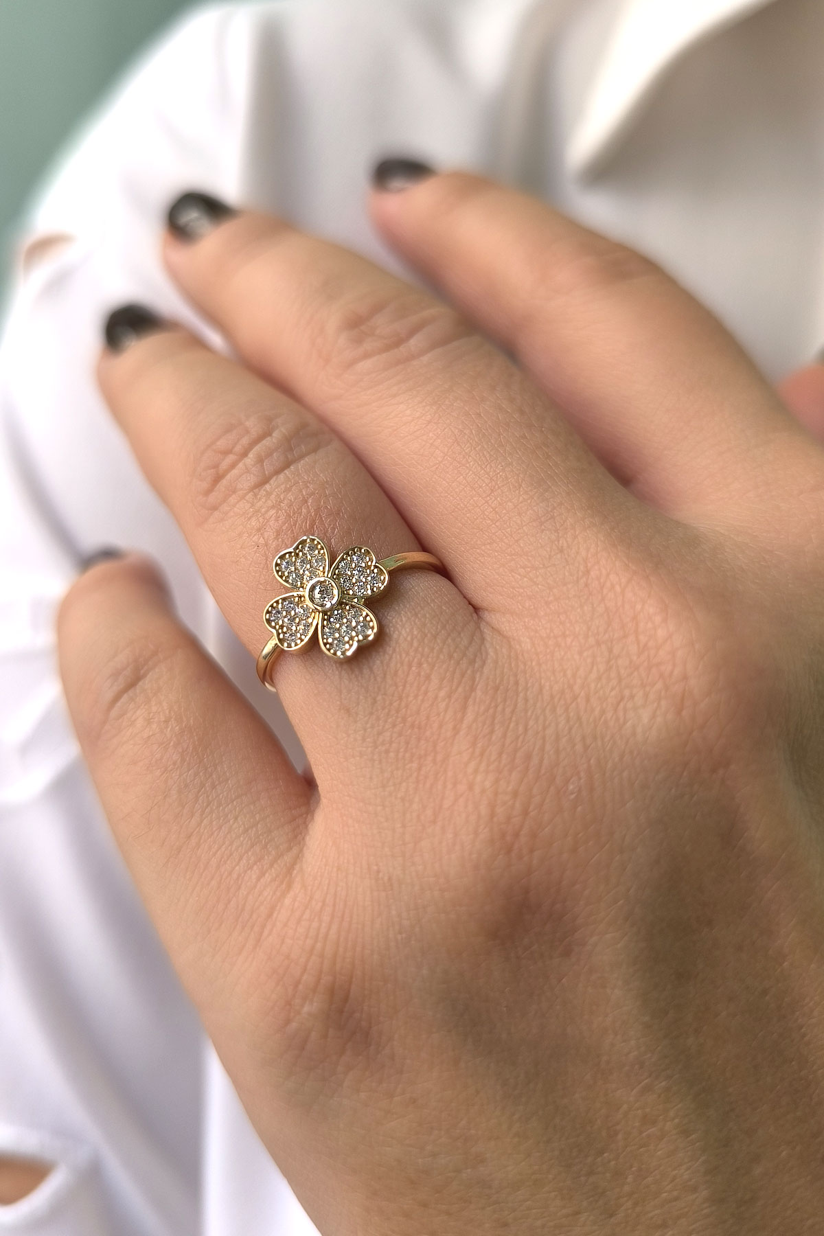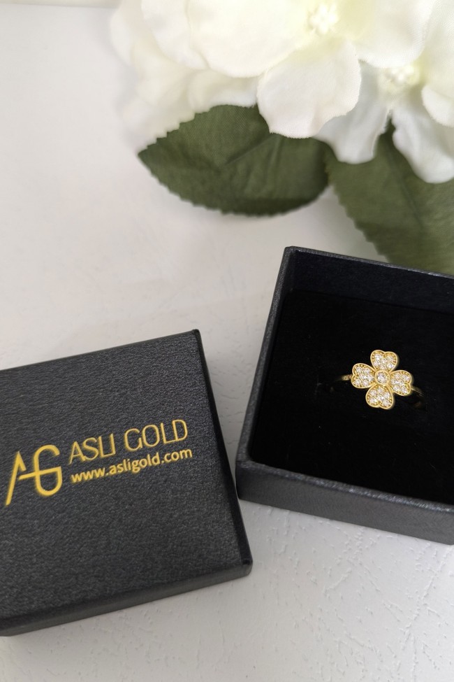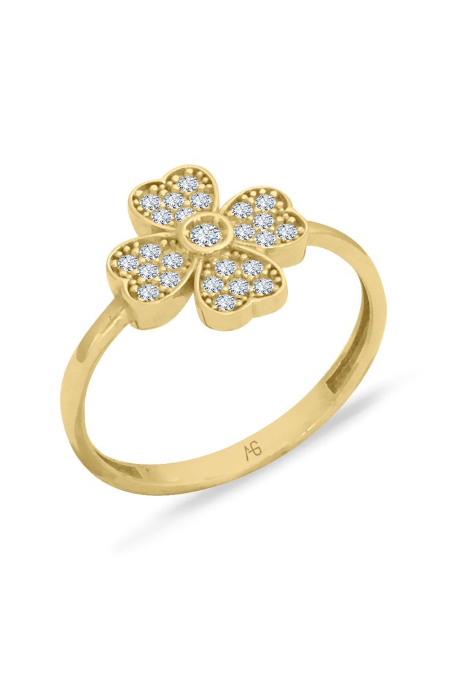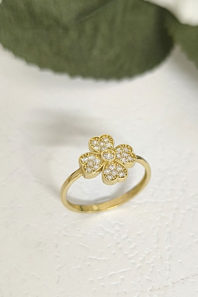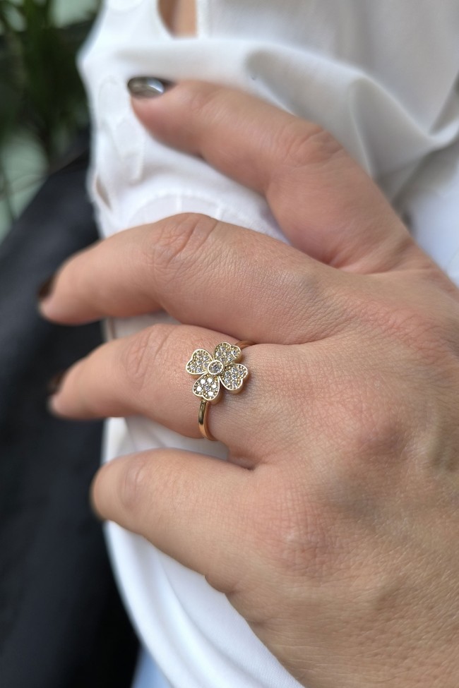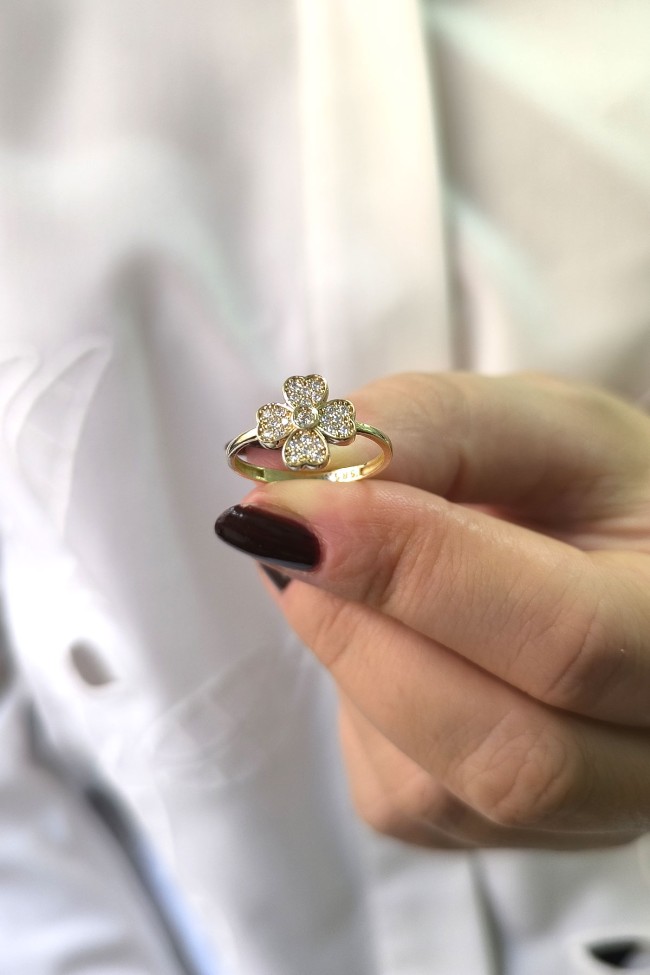 14 ayar sarı altın spor tasarımıyla günlük kullanıma uygun 1.70 gram ağırlığında altın spor taşlı yonca yüzük.