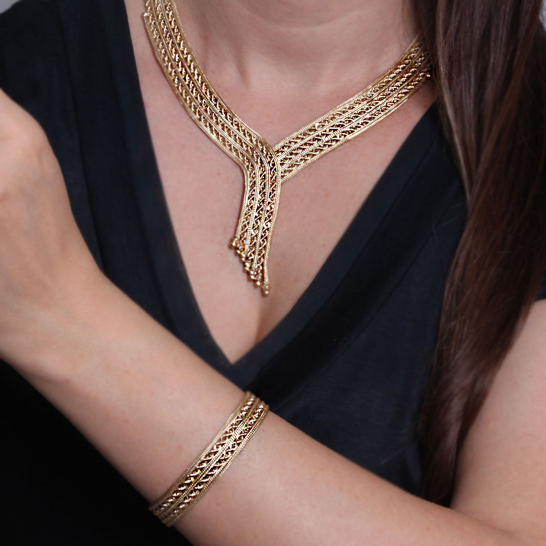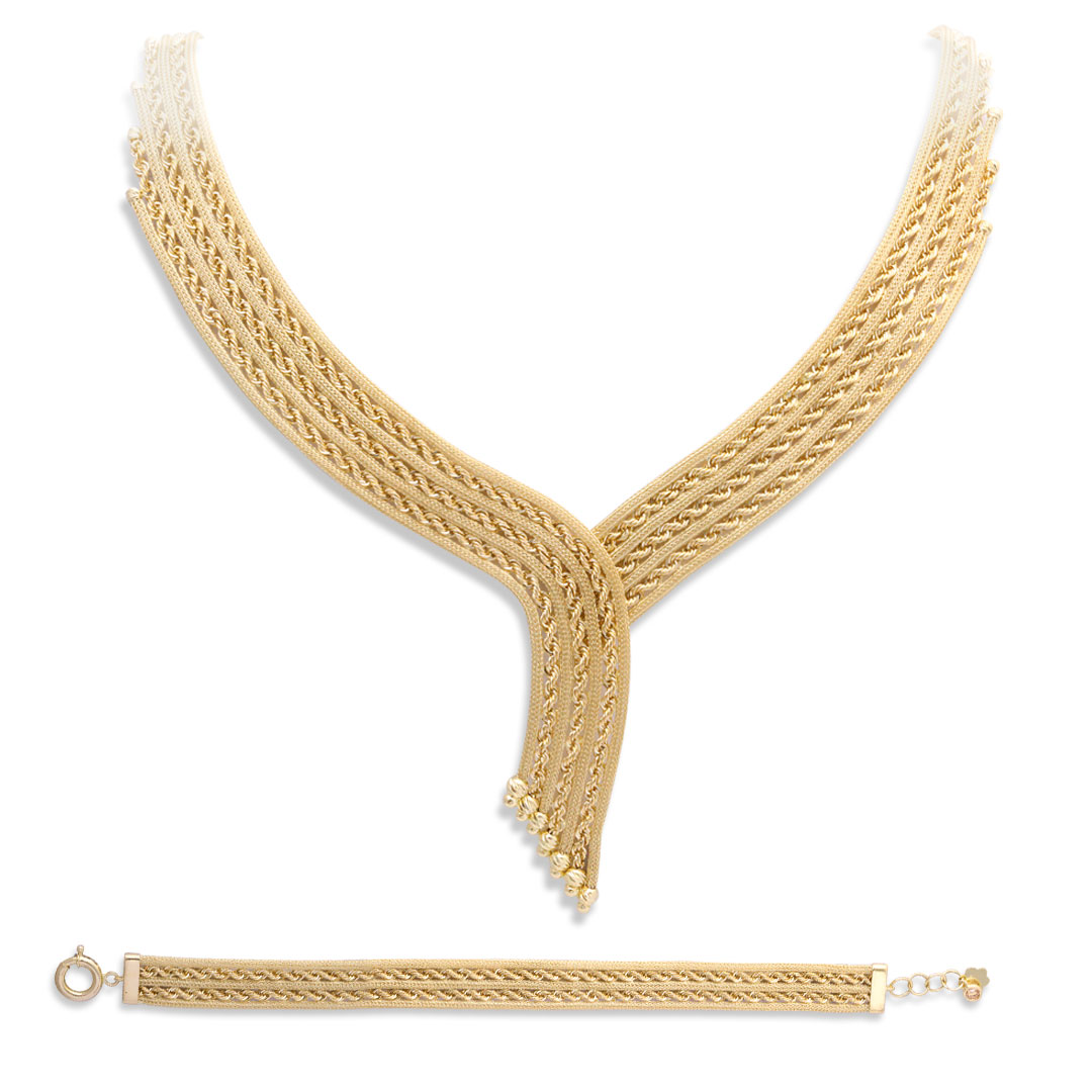 14 Ayar Kalze ve Halat Zincir Kombinasyonu İle Tasarlanmış Taşsız Bileklik ve Gerdanlıktan Oluşan Düğün-Nişan Altın Takı Seti.