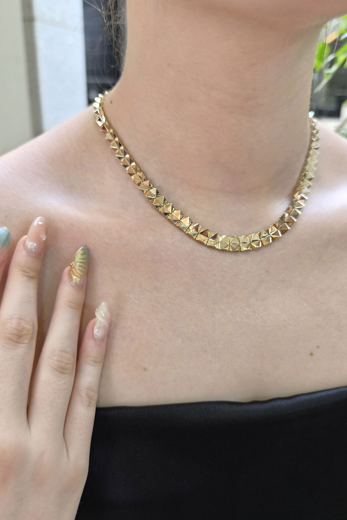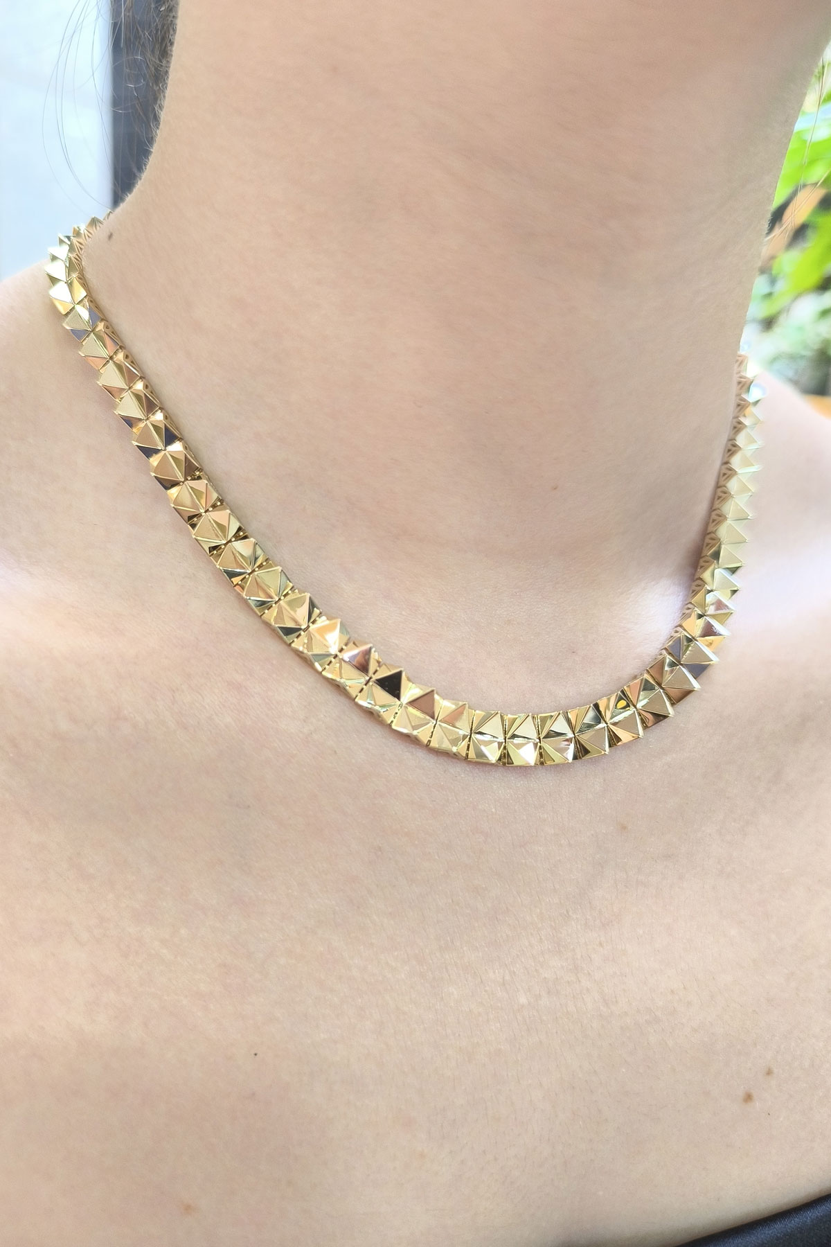 14 Ayar şık ve modern tasarım günlük kullanıma uygun taşsız ışıl ışıl özel piramit sade tasarım 26.30 gram ağırlığında altın gerdanlık kolye.