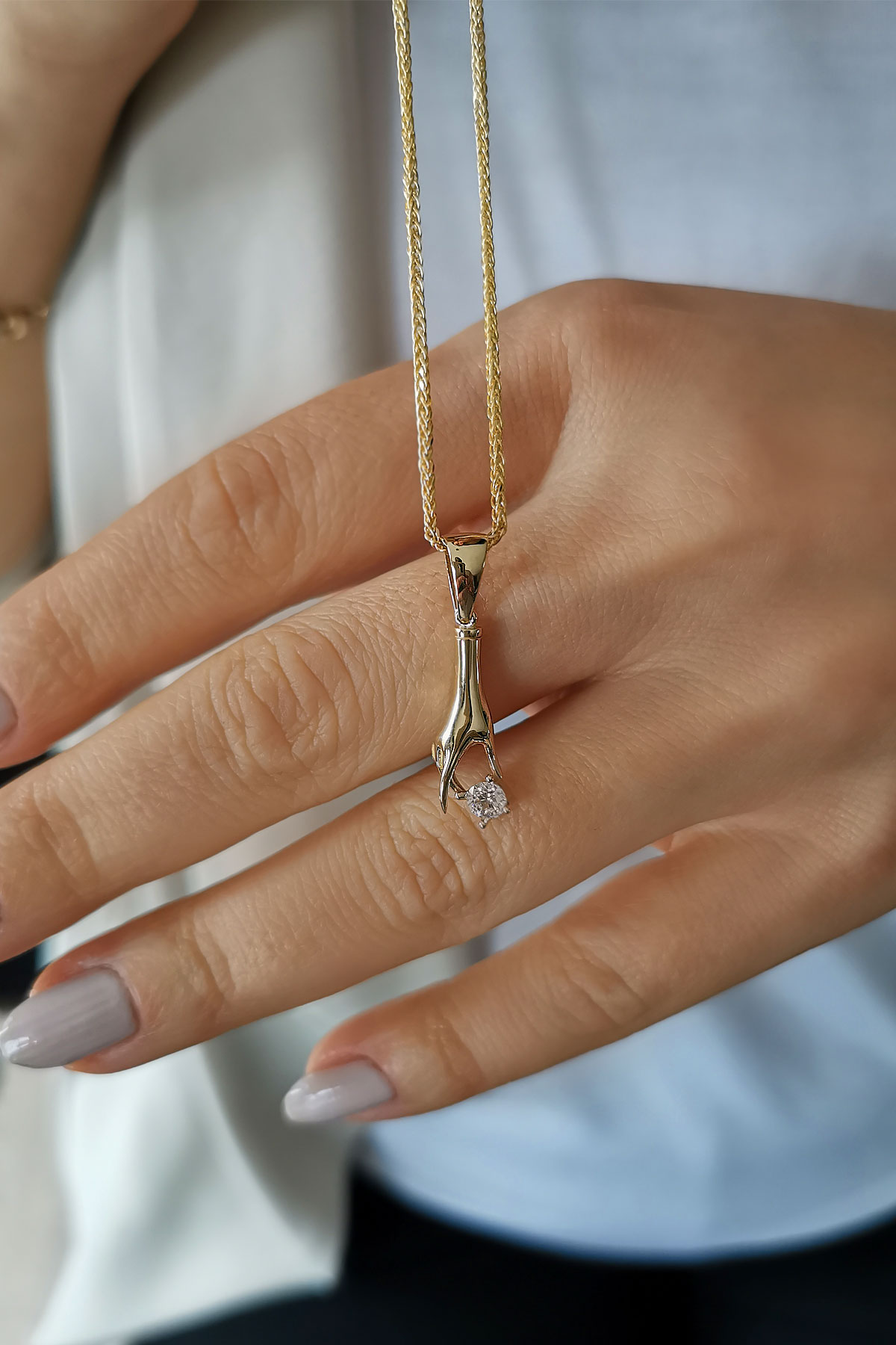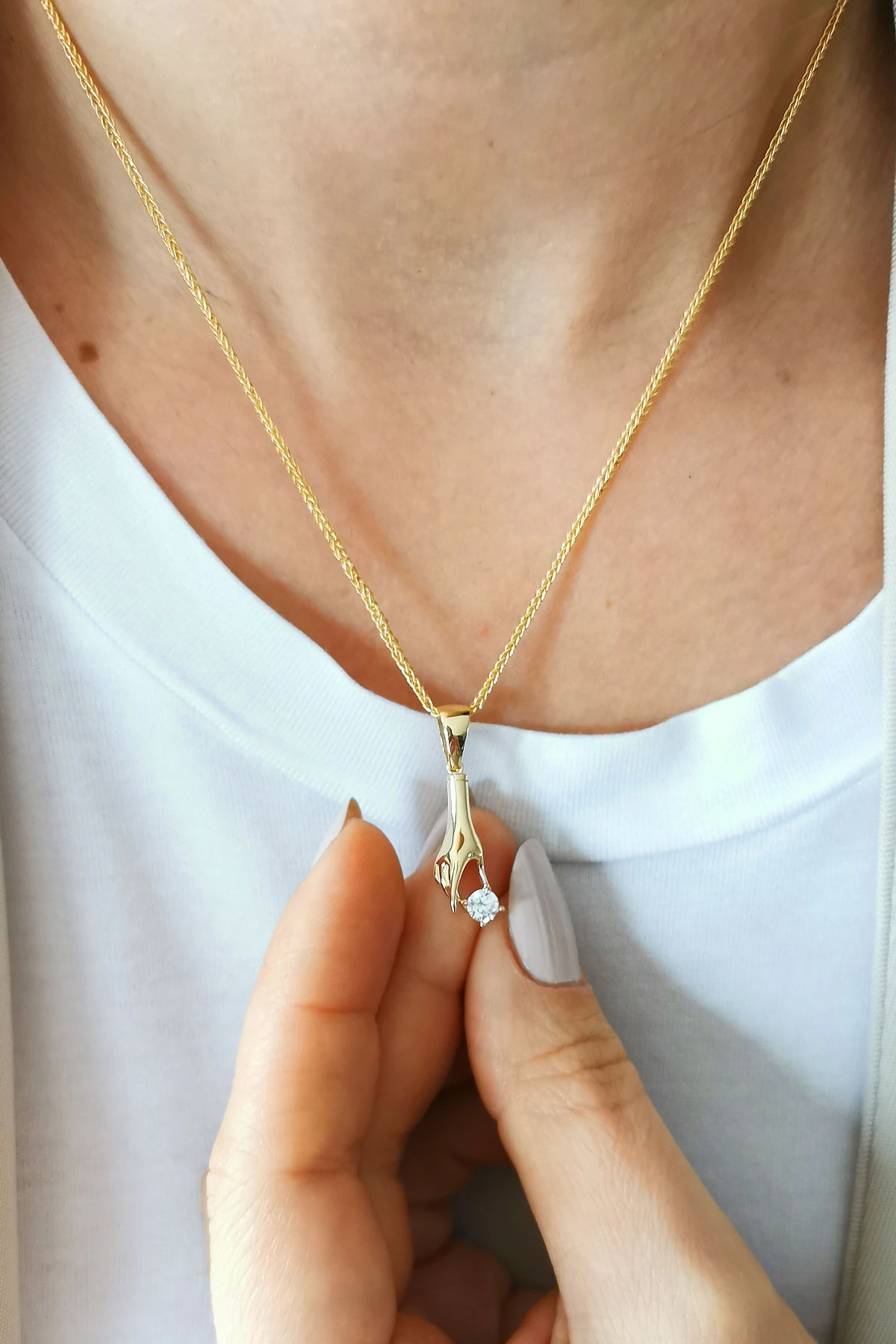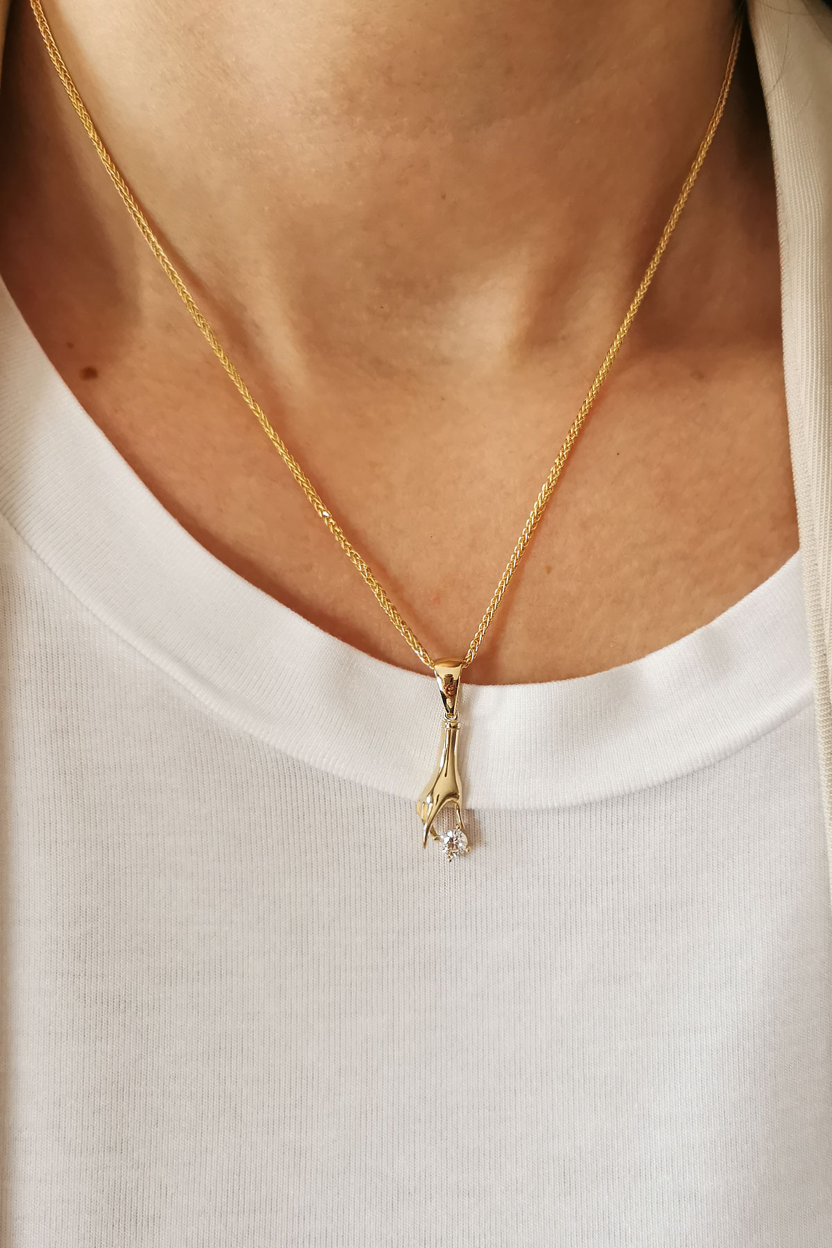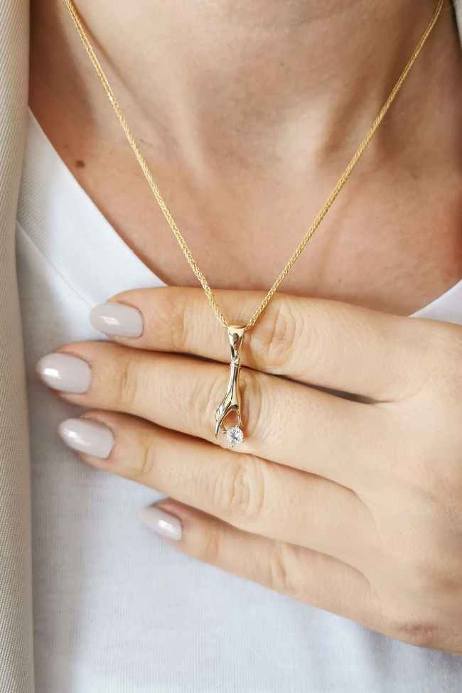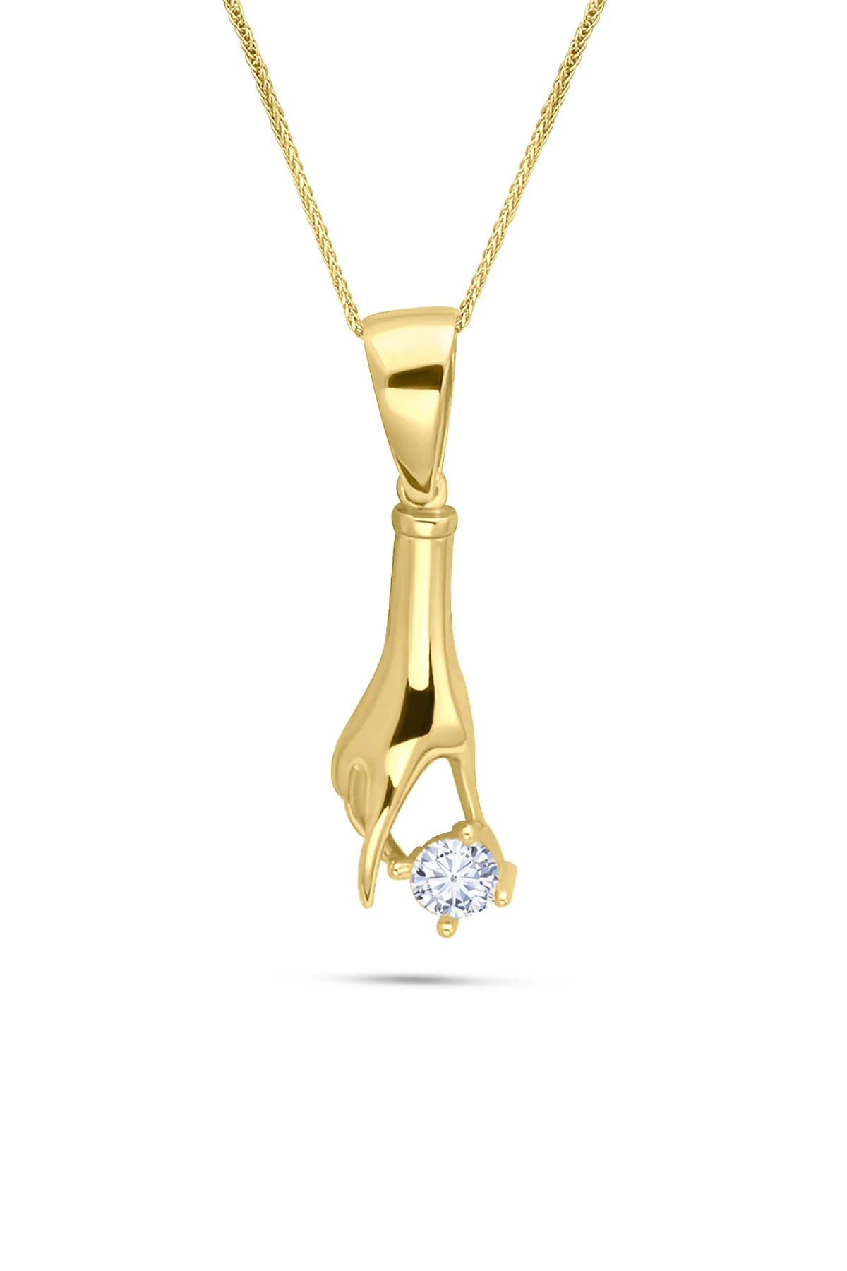 4,20 gr. 2.7 cm boyutunda elinde tektaş tutan model 14 ayar altın kolye.