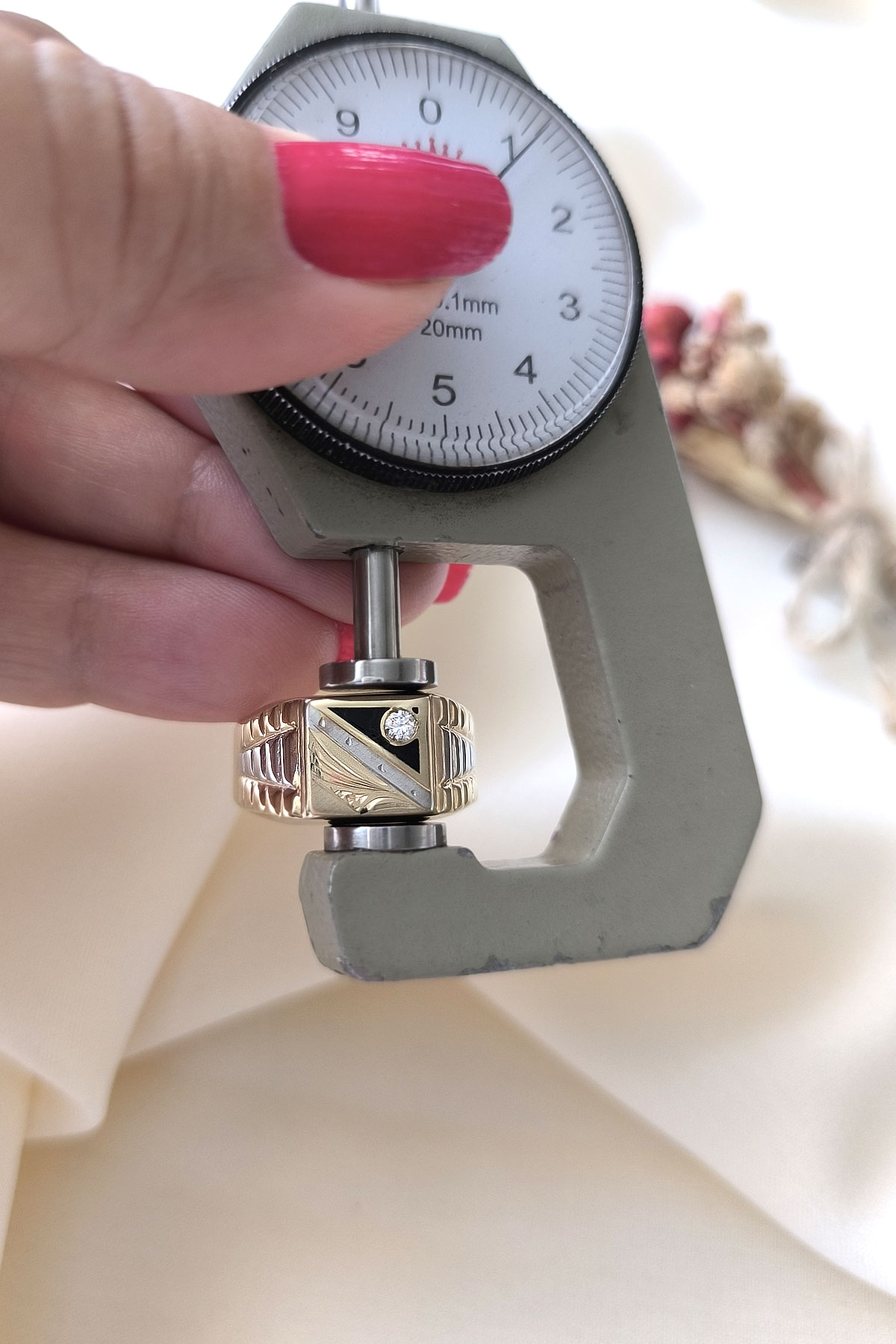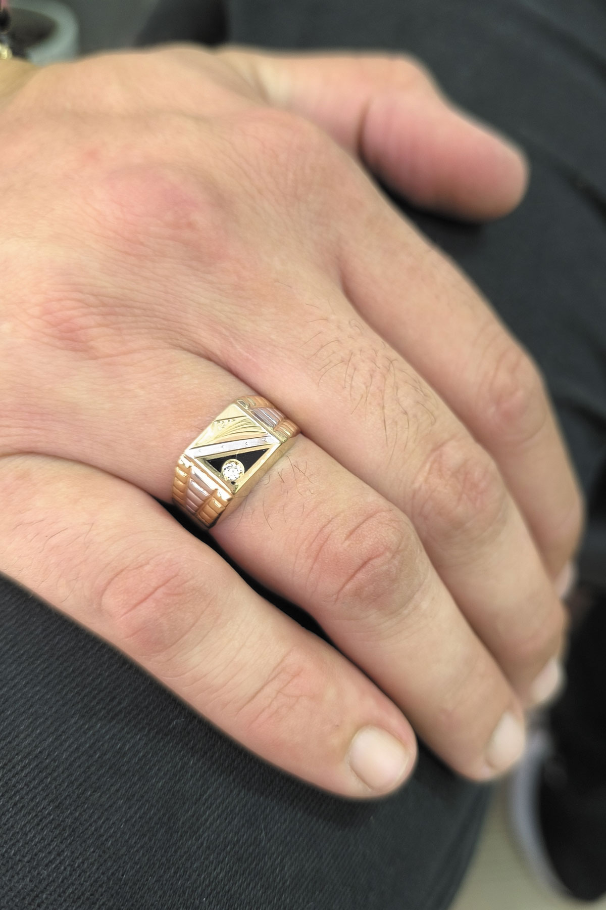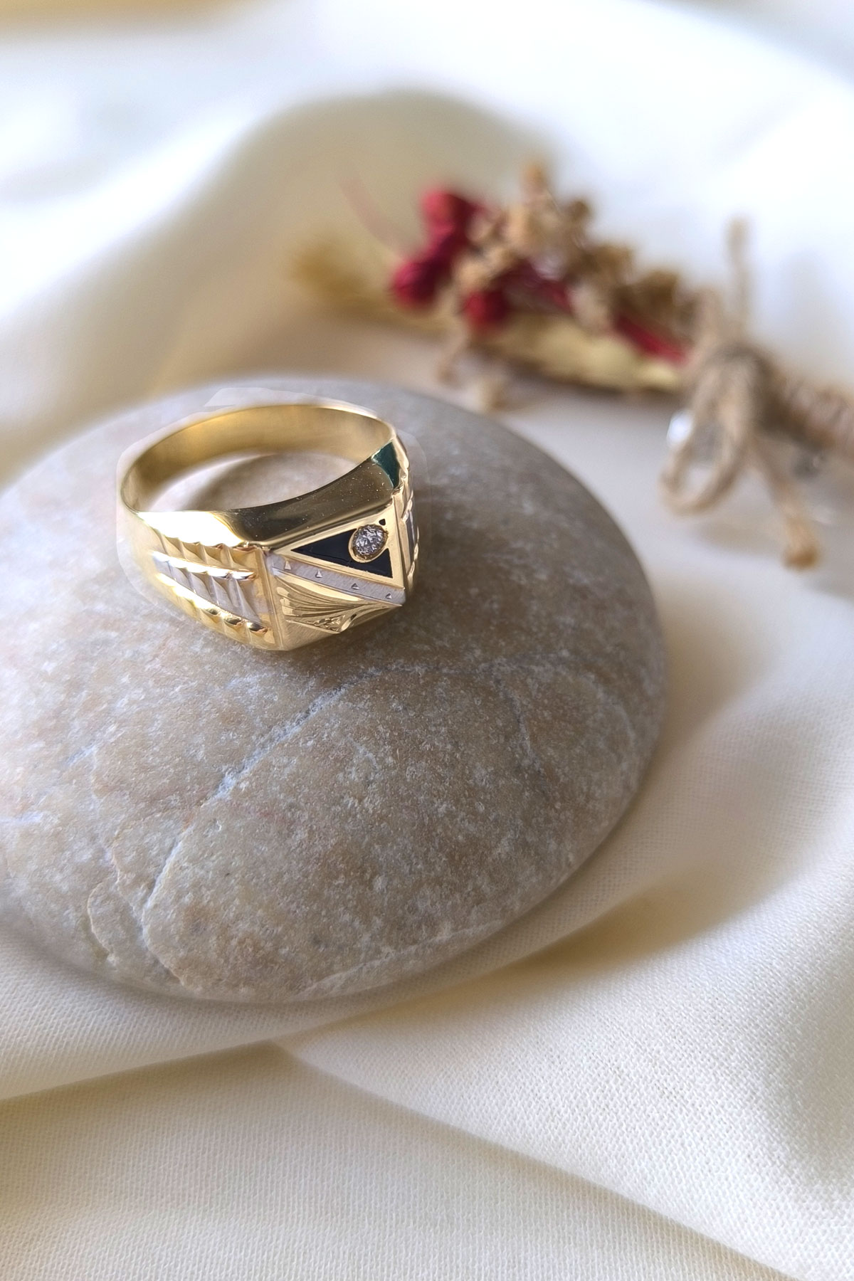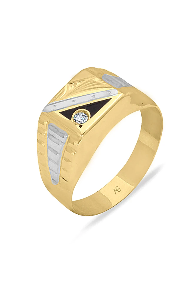 3.70 Gr. ağırlığında sarı altın özel kalem işleme ve siyah şerit detaylı köşegen form dolgun şık bir modele sahip 14 ayar altın erkek yüzük.