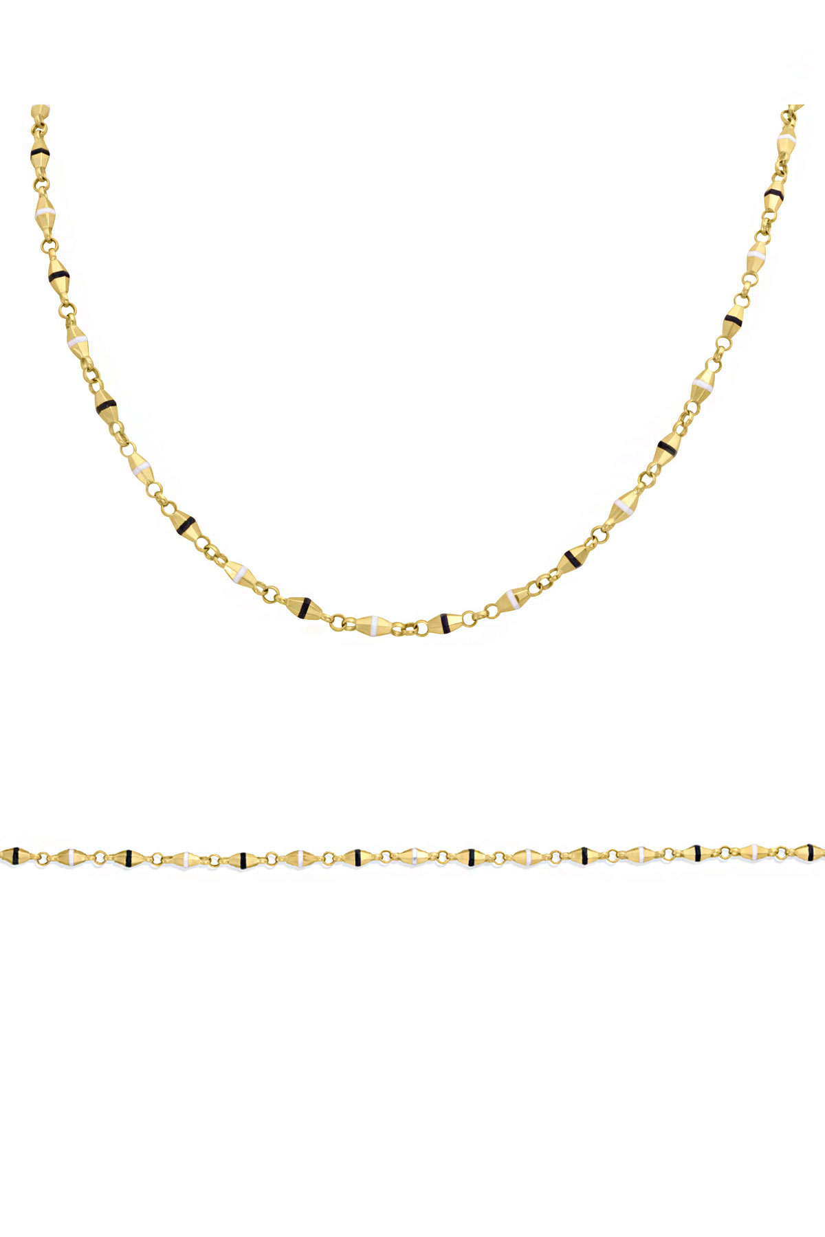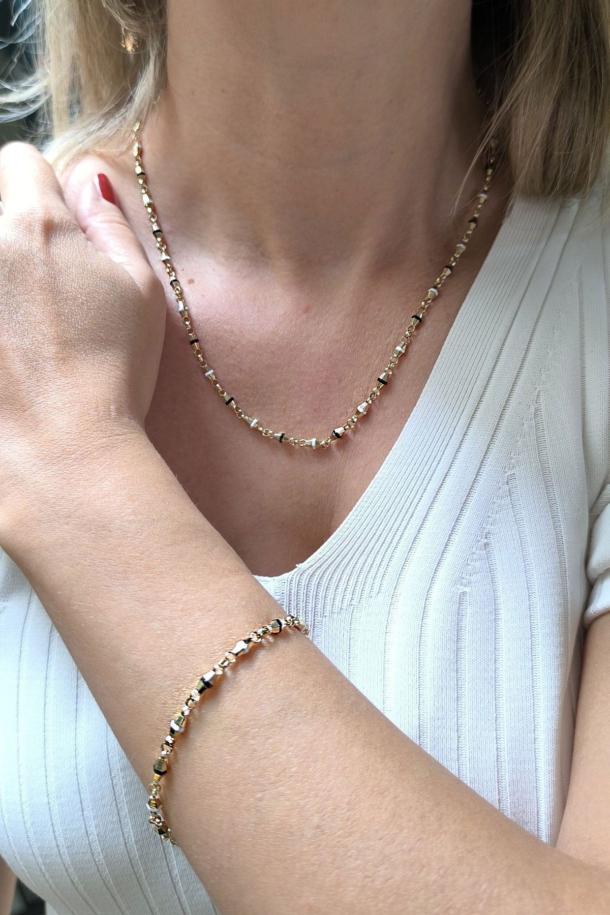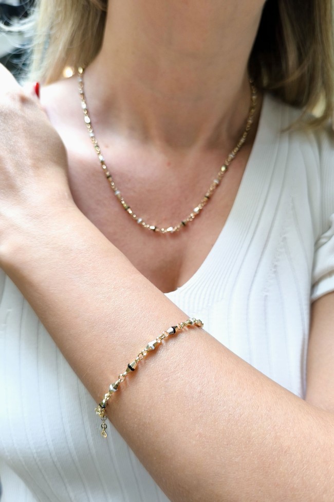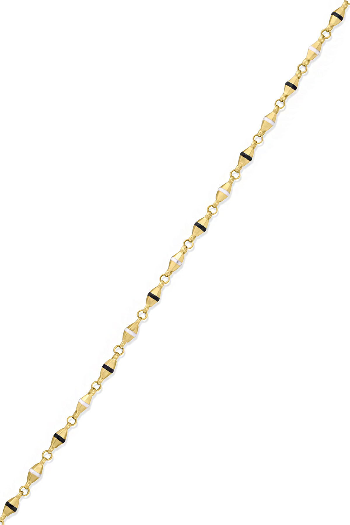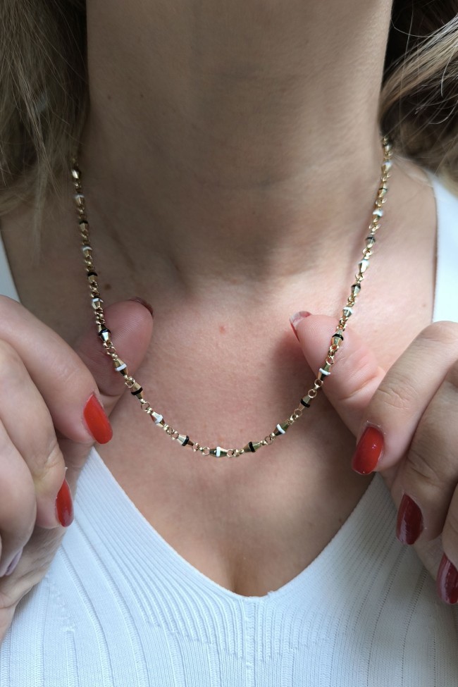Spor tarz 19+2 Cm Boyunda Bileklik, 50+2 Cm Boyunda Kolyesi Olan Model 15.40 Gr. Ağırlığında 14 Ayar Altın Siyah Ve Beyaz Mineli Unisex Bileklik Kolye Set.