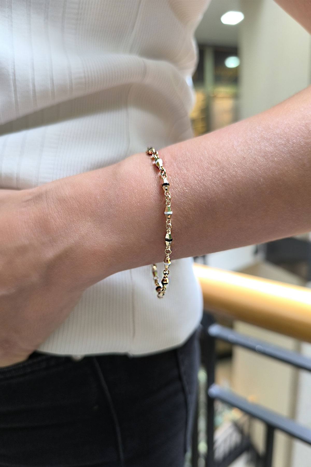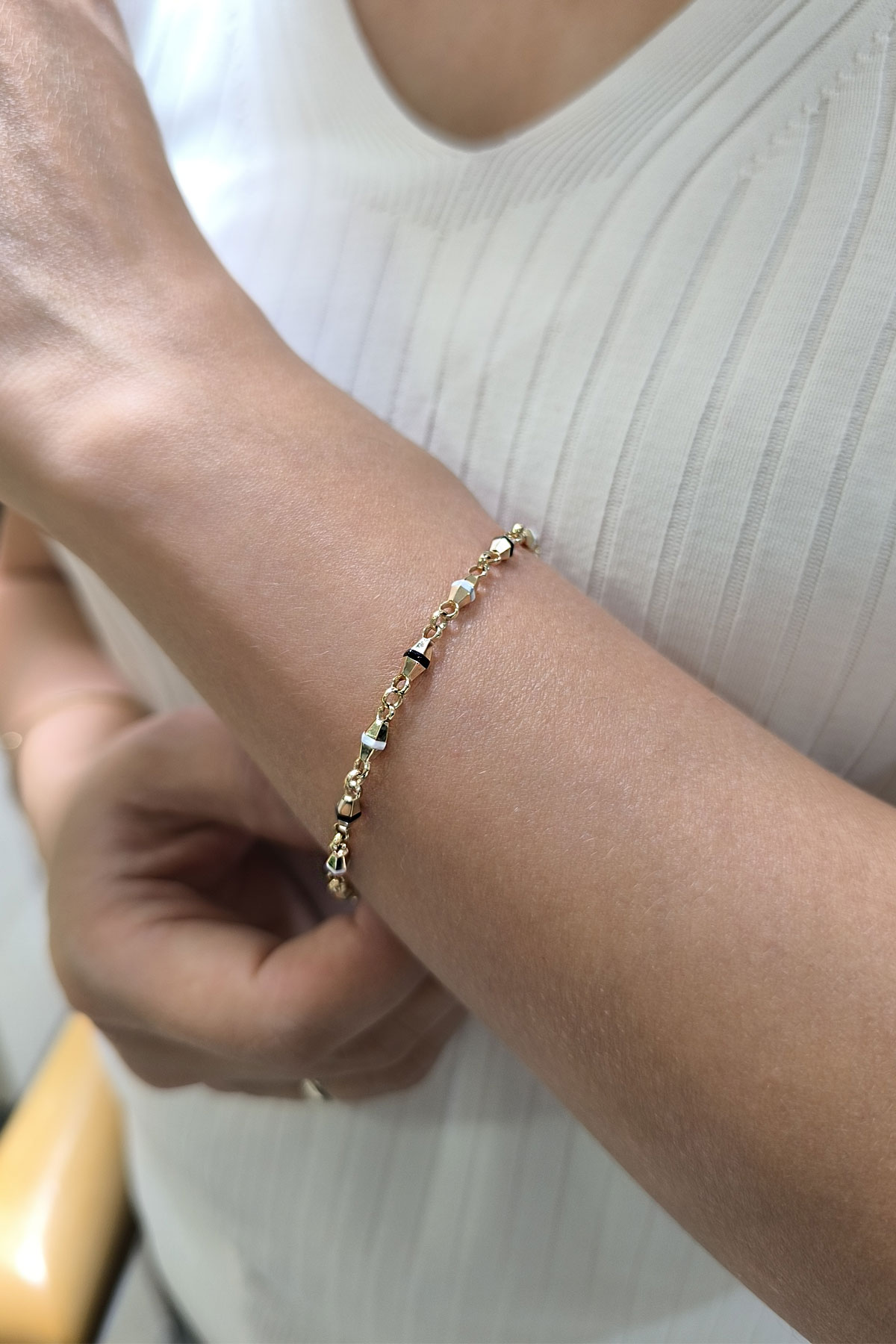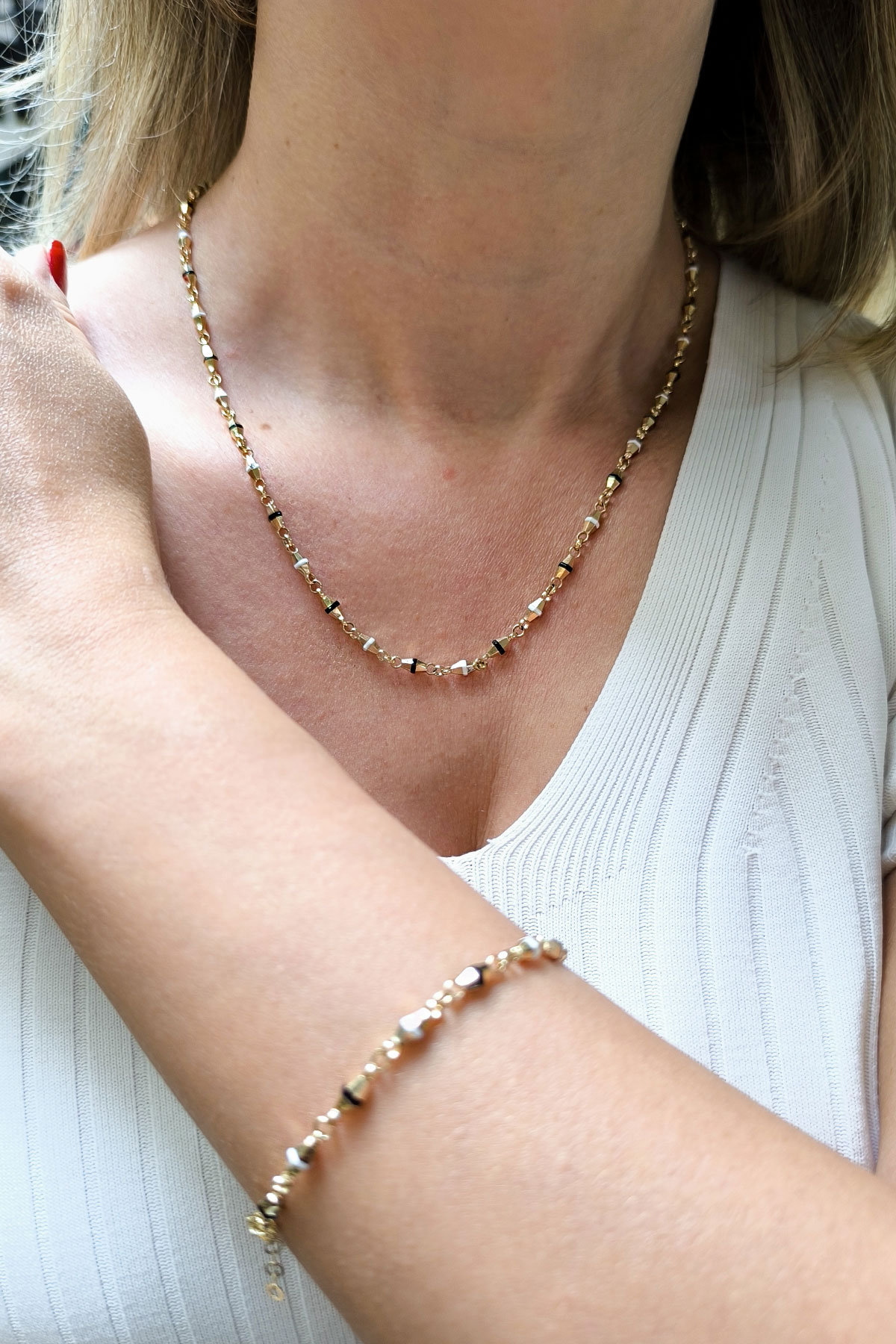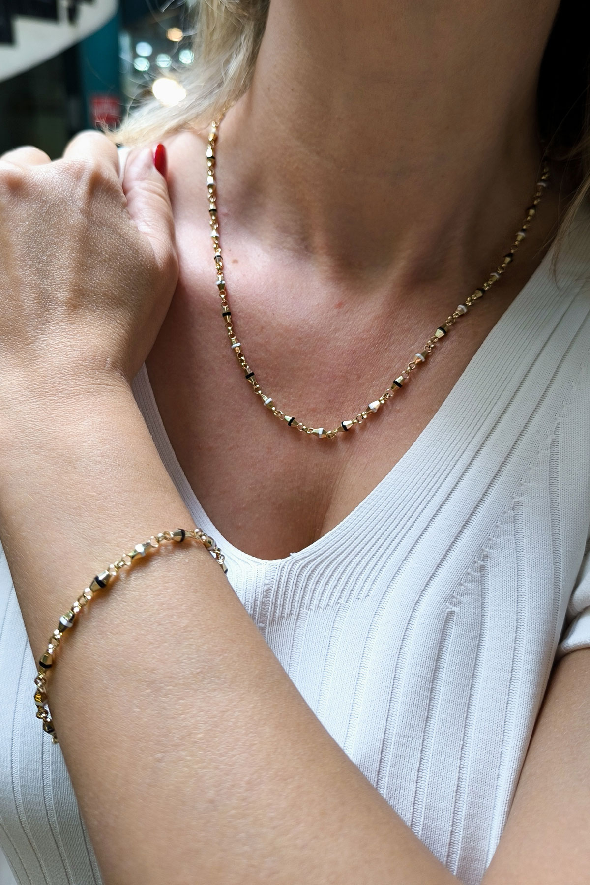 Spor tarz 19+2 Cm Boyunda Bileklik, 50+2 Cm Boyunda Kolyesi Olan Model 15.40 Gr. Ağırlığında 14 Ayar Altın Siyah Ve Beyaz Mineli Unisex Bileklik Kolye Set.