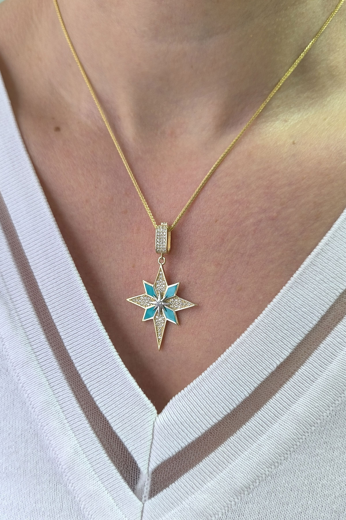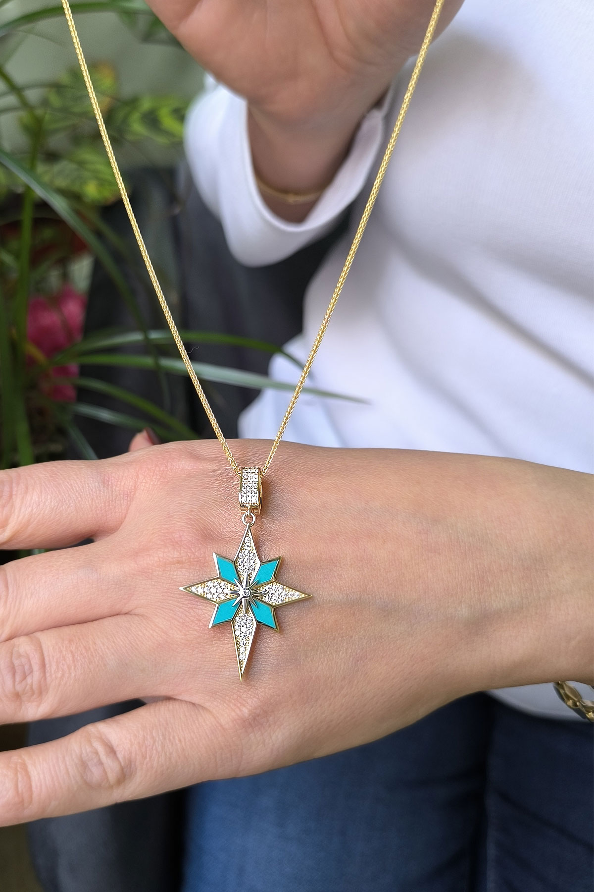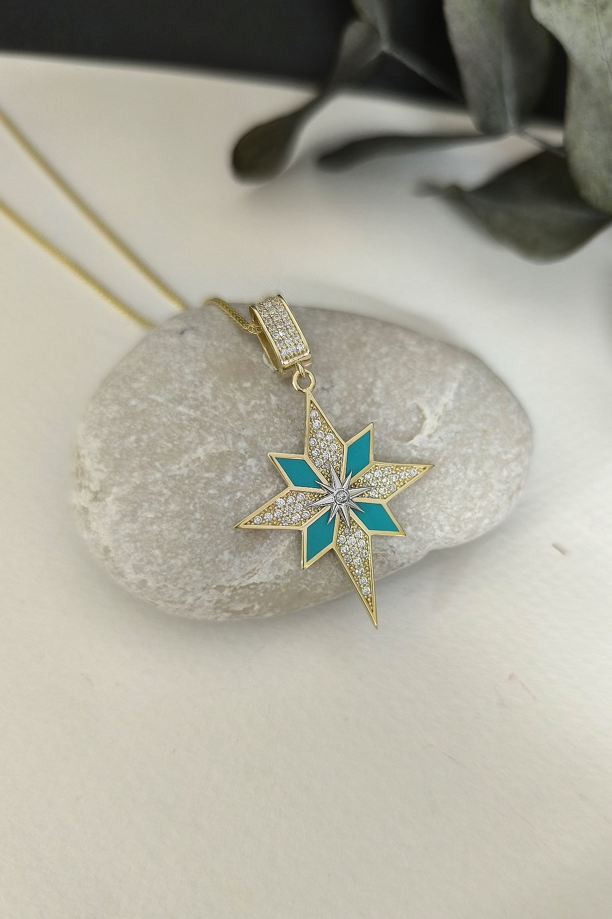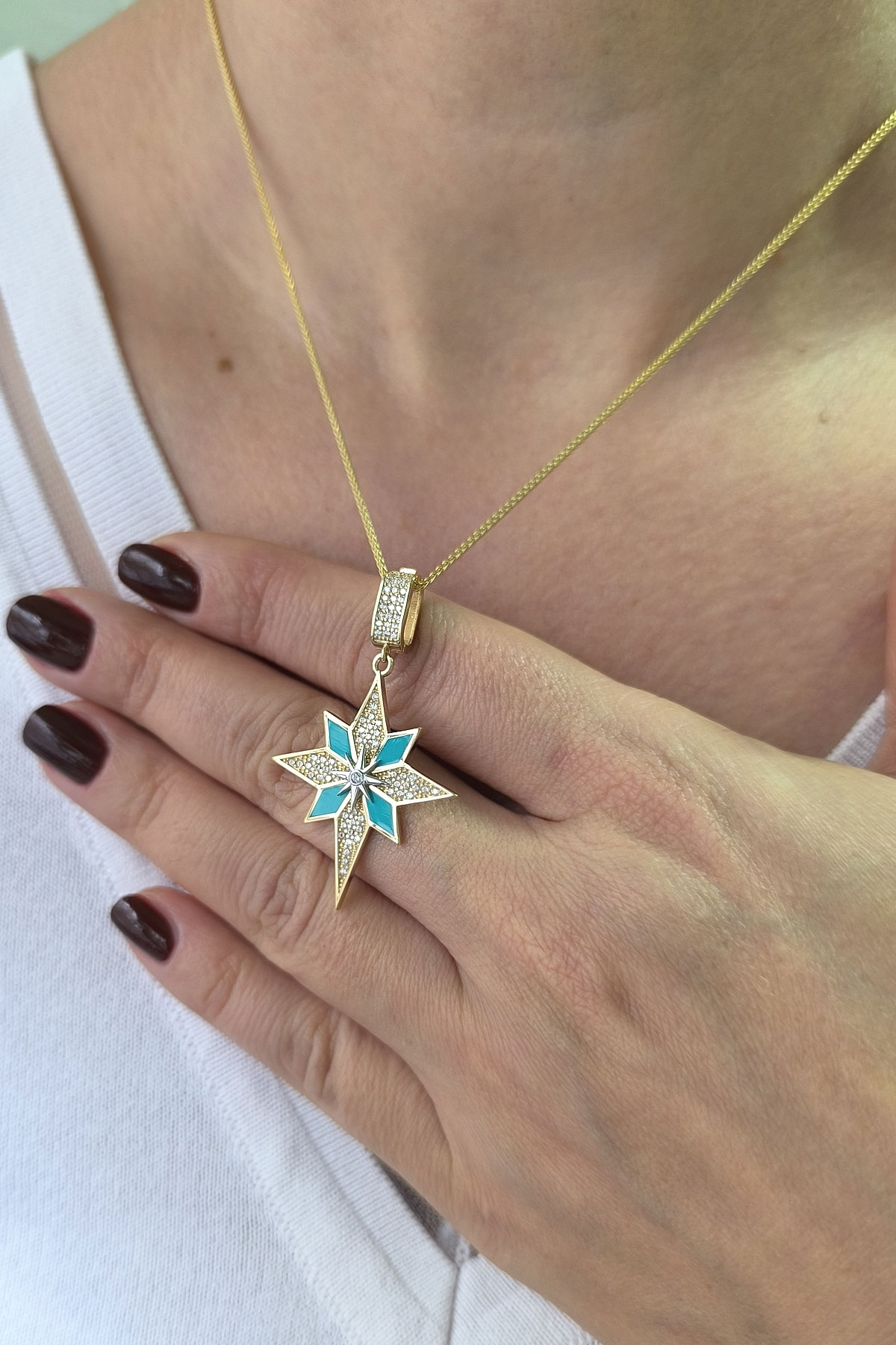 6.80 gr. 4.5 cm boyutunda zirkon taşlı turkuaz mineli model 14 ayar altın kuzey yıldızı charm kilit kolye. Farklı kolyelerinizle bir arada kombine olarak kullanabileceğiniz harika ve gösterişli bir model.