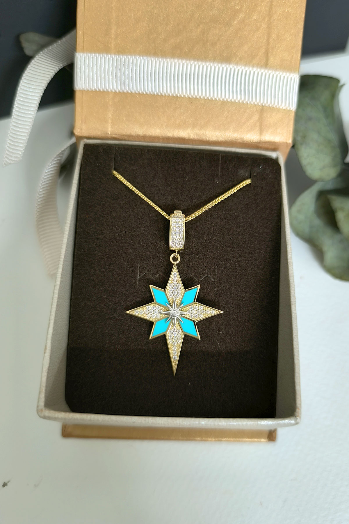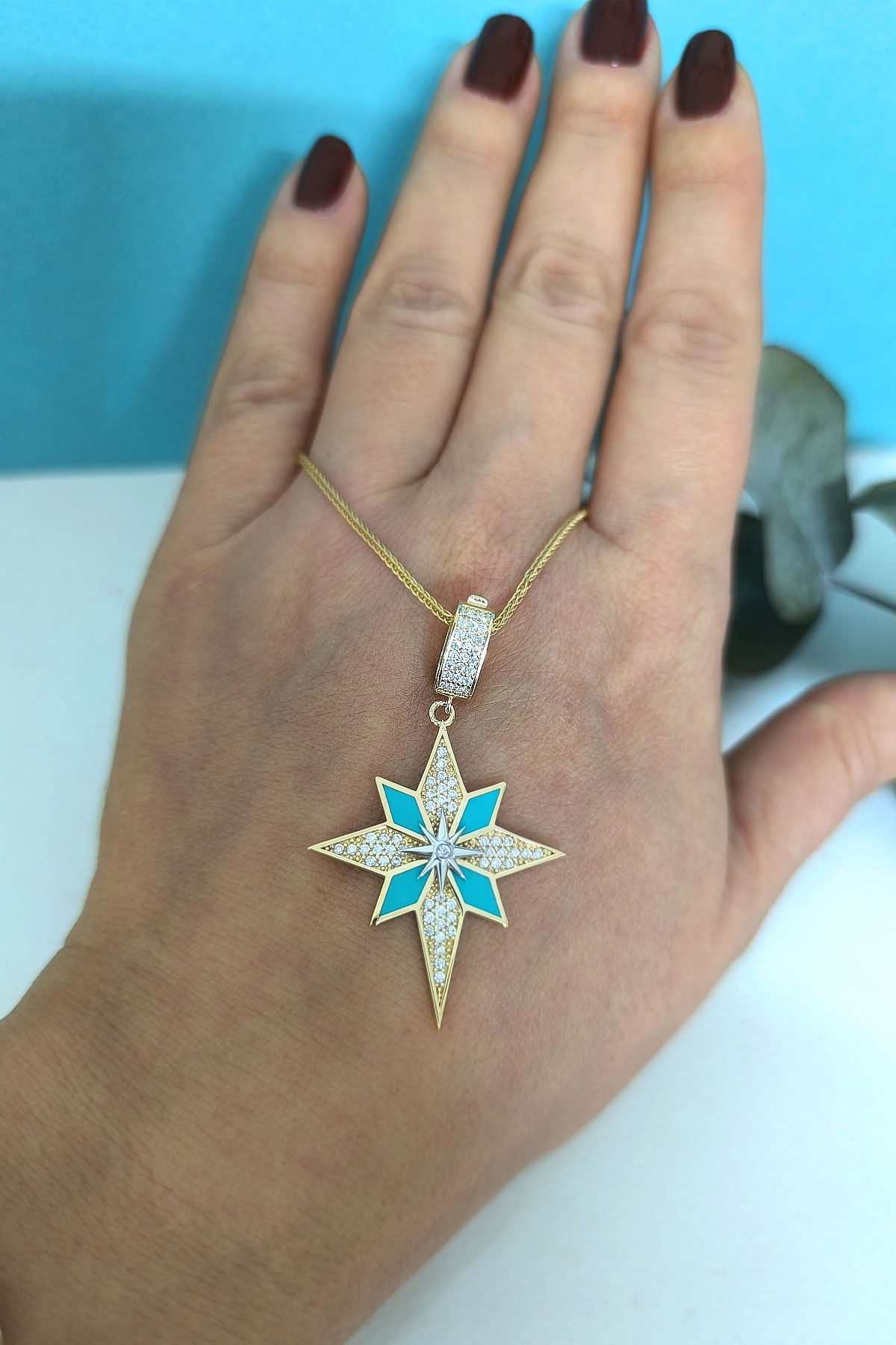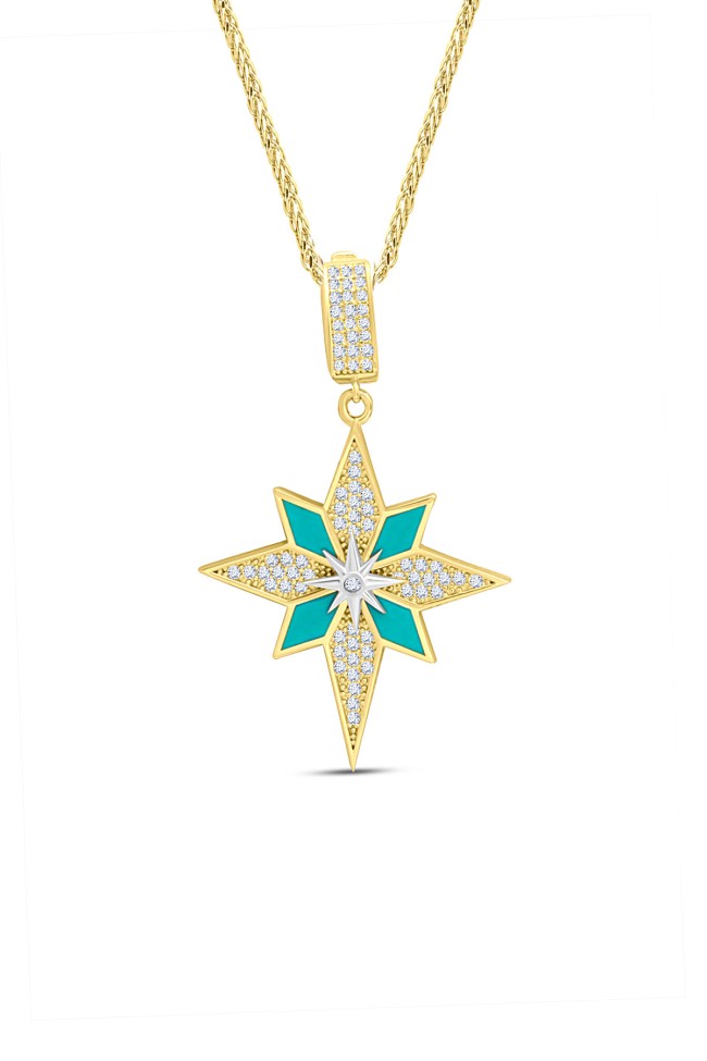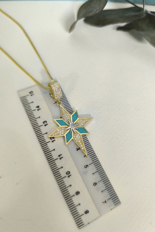 6.80 gr. 4.5 cm boyutunda zirkon taşlı turkuaz mineli model 14 ayar altın kuzey yıldızı charm kilit kolye. Farklı kolyelerinizle bir arada kombine olarak kullanabileceğiniz harika ve gösterişli bir model.