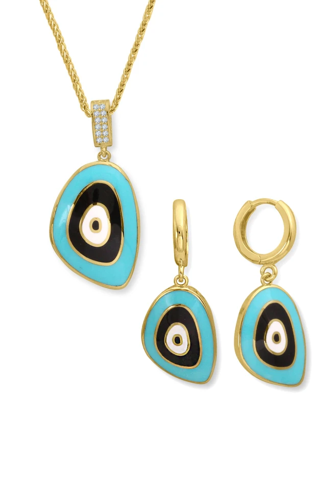 14 Ayar Altın Turkuaz Mineli 12.50 Gr Ağırlığında Charm Kilitli Göz Kolye Küpe Takım.