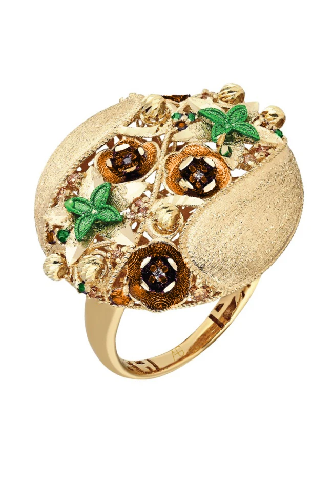 İtalyan tasarım turuncu gül modelle işlenmiş zarafetini parmağınıza taşıyan bu 14 ayar altın yüzük, her detayıyla bir hikâye anlatır. El işçiliğinin inceliğiyle hayat bulan gül motifleri, doğanın en saf ve renkli anlarını altınla buluşturur. Renkli sıcak tonların uyumu; güçlü, özgün ve stil sahibi kadınların ruhunu yansıtır.