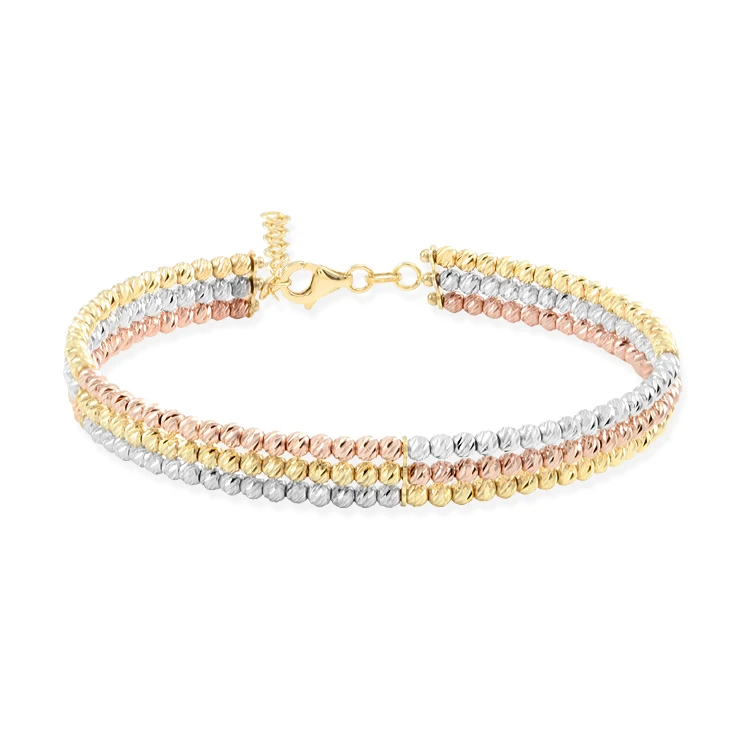 14 ayar beyaz kırmızı ve sarı altın topların düzenli kombinasyonu ile tasarlanmış şık dorika bilezik.