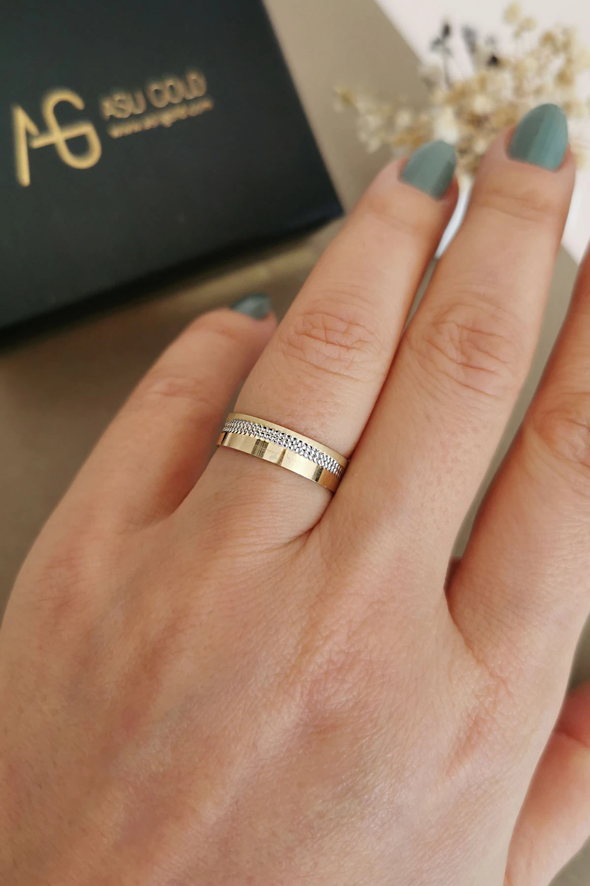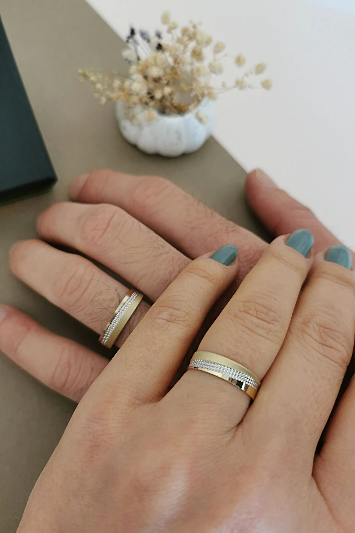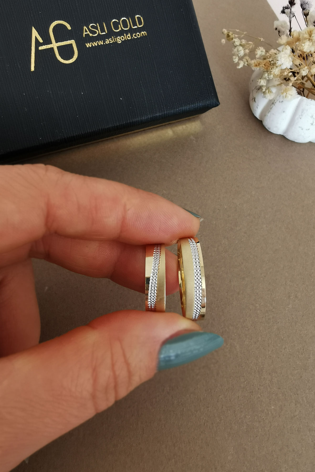 14 Ayar 5.60 gram ağırlığında çift renk modern günlük kullanımda sizi oldukça rahat ettirecek unisex kullanıma uygun, modern bir tasarıma sahip evlilik, nişan alyansı olarak da  tercih edebileceğiniz altın çift alyans.