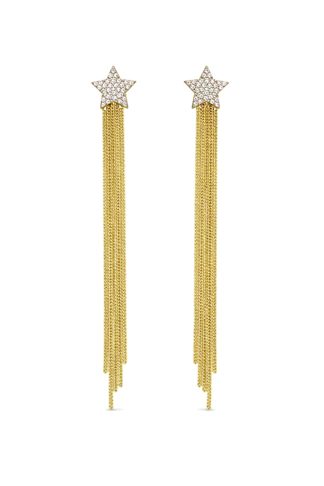 14 Ayar Altın 8 Cm Boyunda Zincirli Yıldız Küpe.