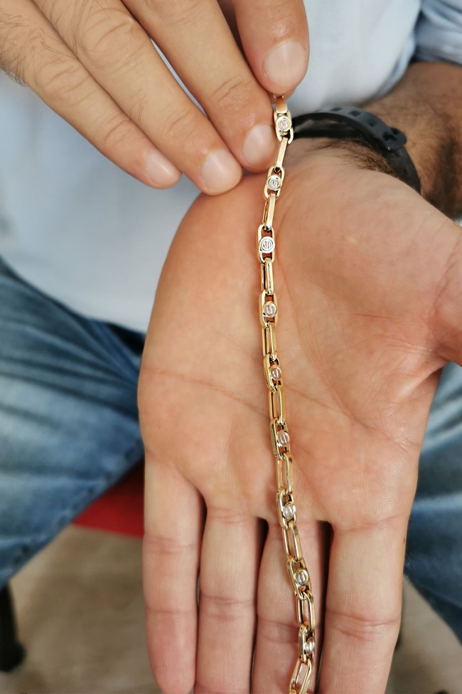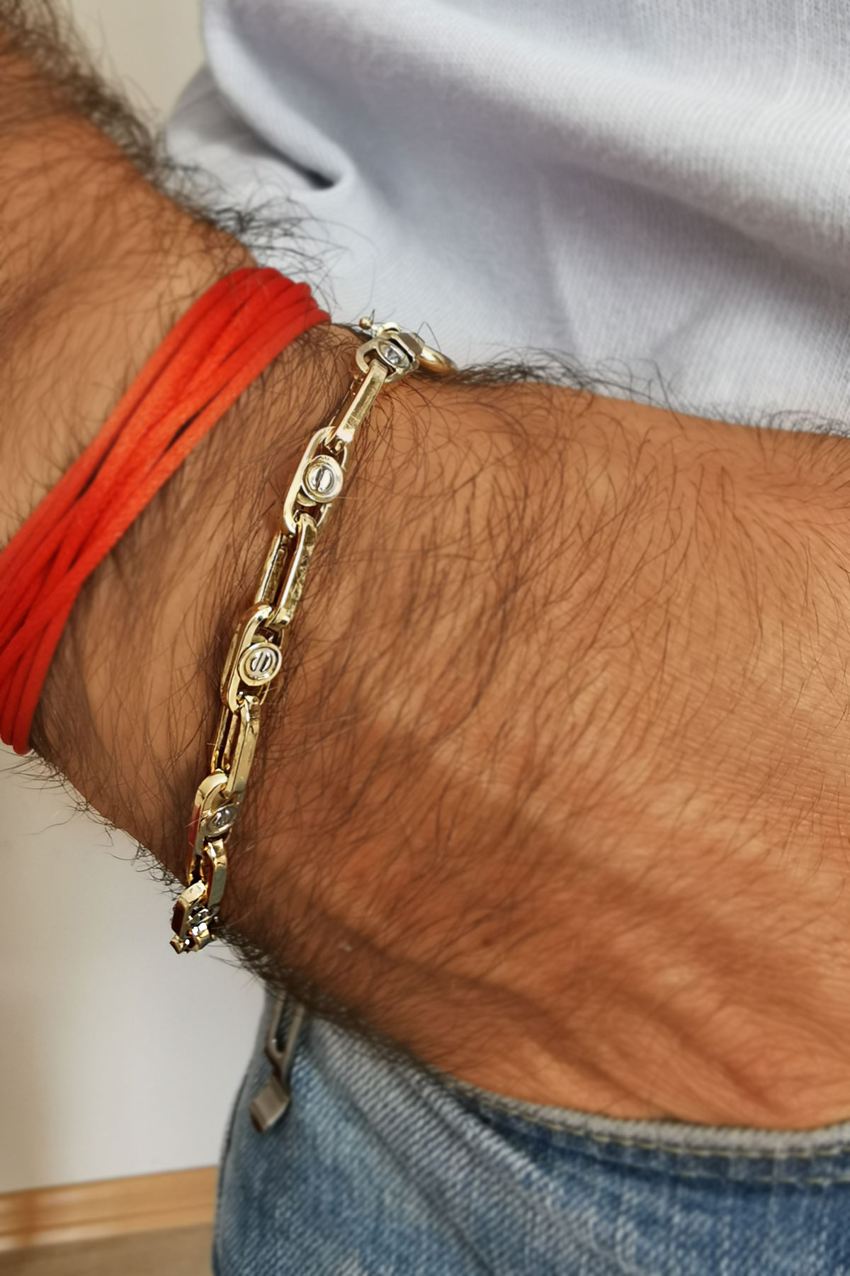 Modern bir tasarıma sahip oldukça spor duran geçme zincir model detaylı taşsız tasarım, günlük kullanıma uygun, özel günlerinde sevdiklerinize şık bir hediye seçeneği olacak 6.80 gr ağırlığında 14 ayar altın erkek bileklik.