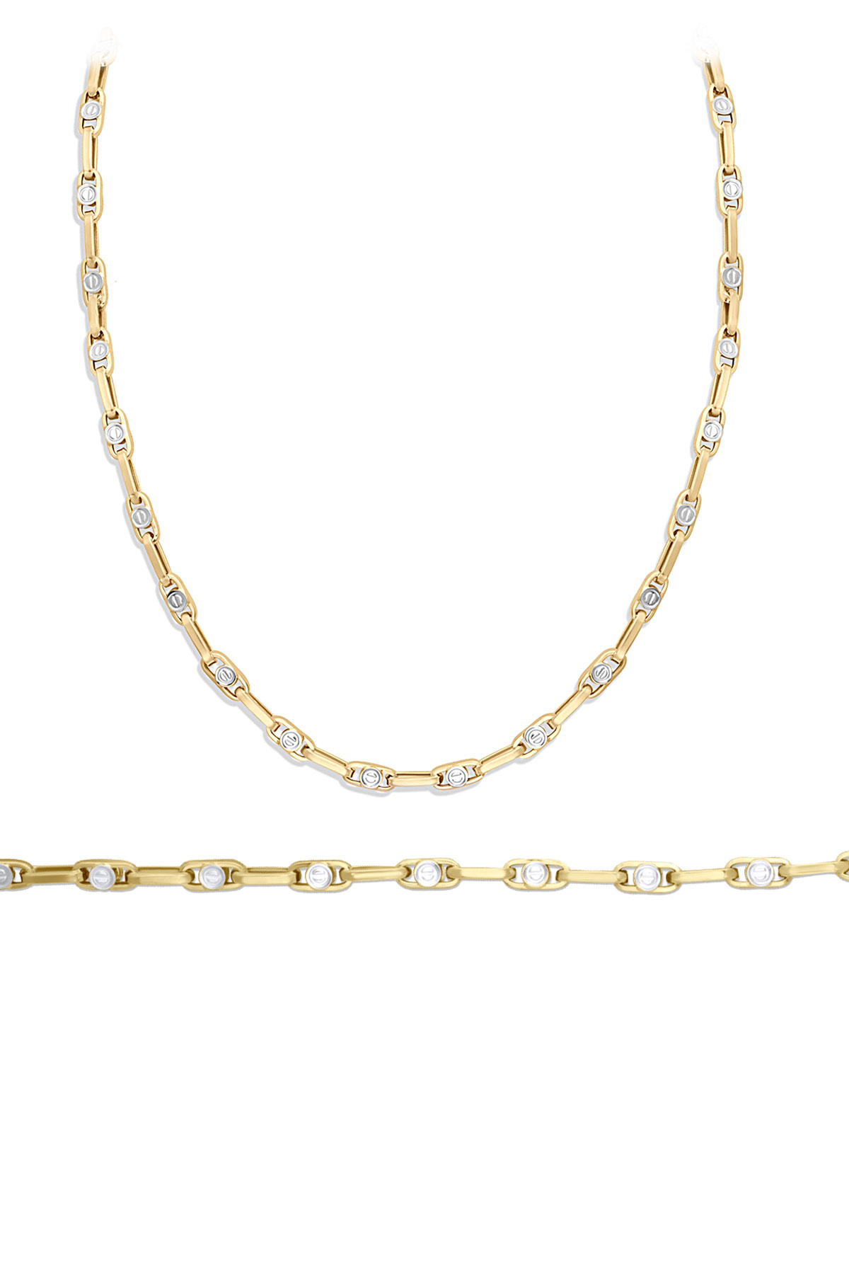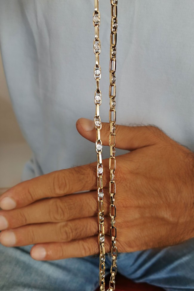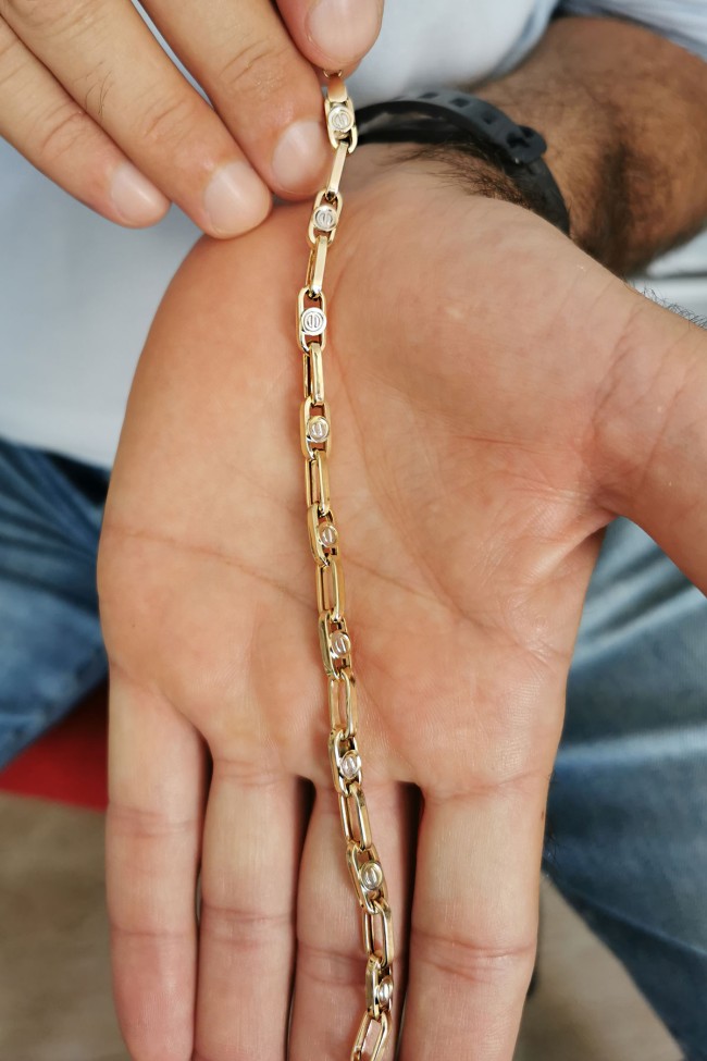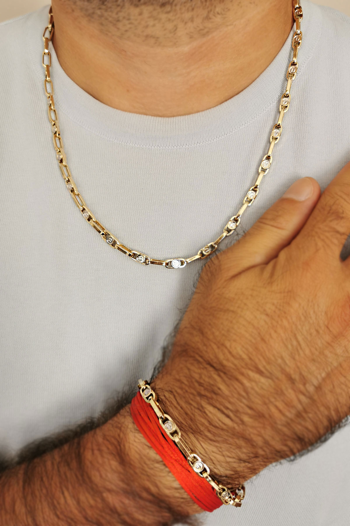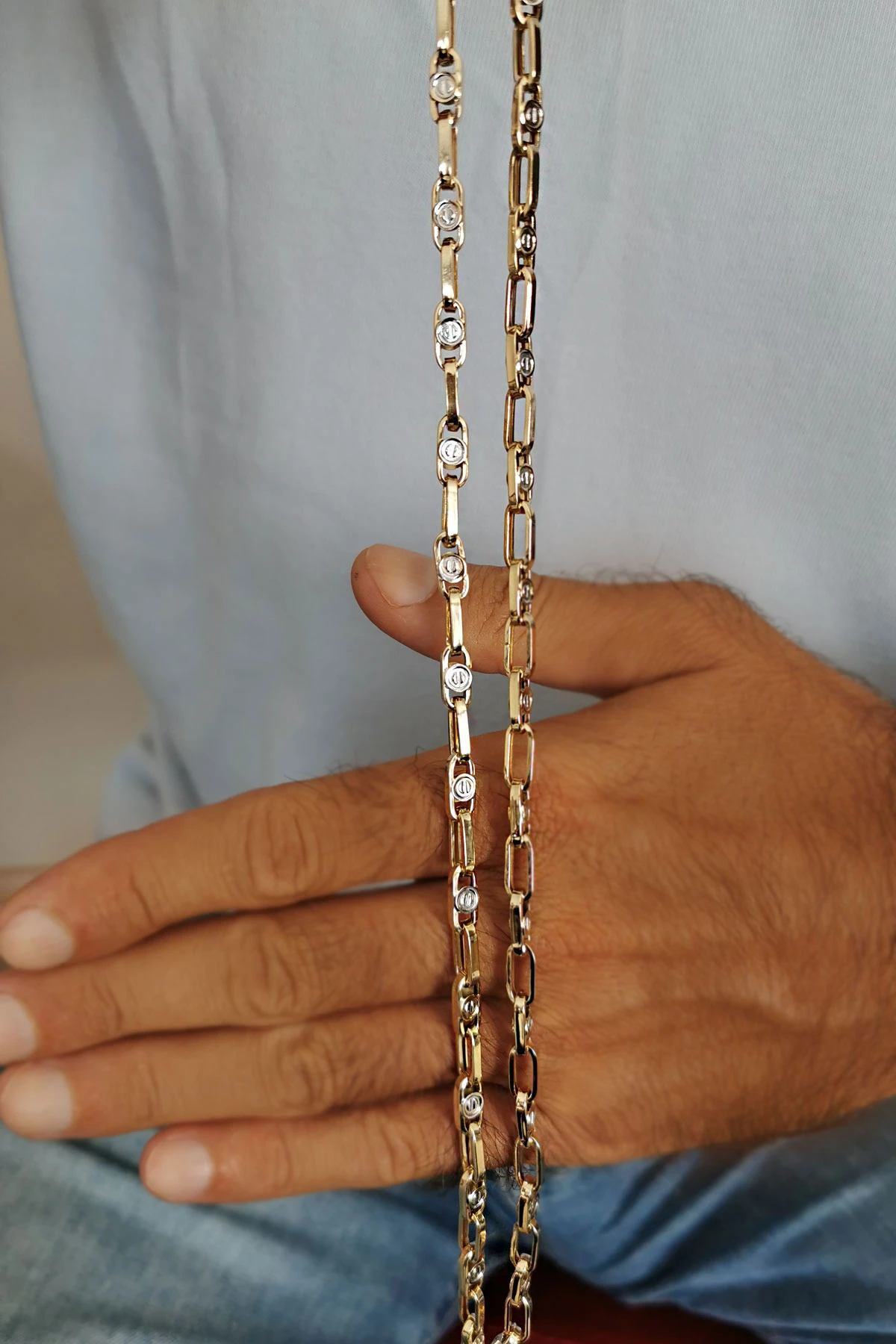 Modern bir tasarıma sahip oldukça spor duran geçme zincir model detaylı taşsız tasarım, günlük kullanıma uygun, özel günlerinde sevdiklerinize şık bir hediye seçeneği olacak 25.85 gr ağırlığında 14 ayar altın erkek kolye bileklik takım.