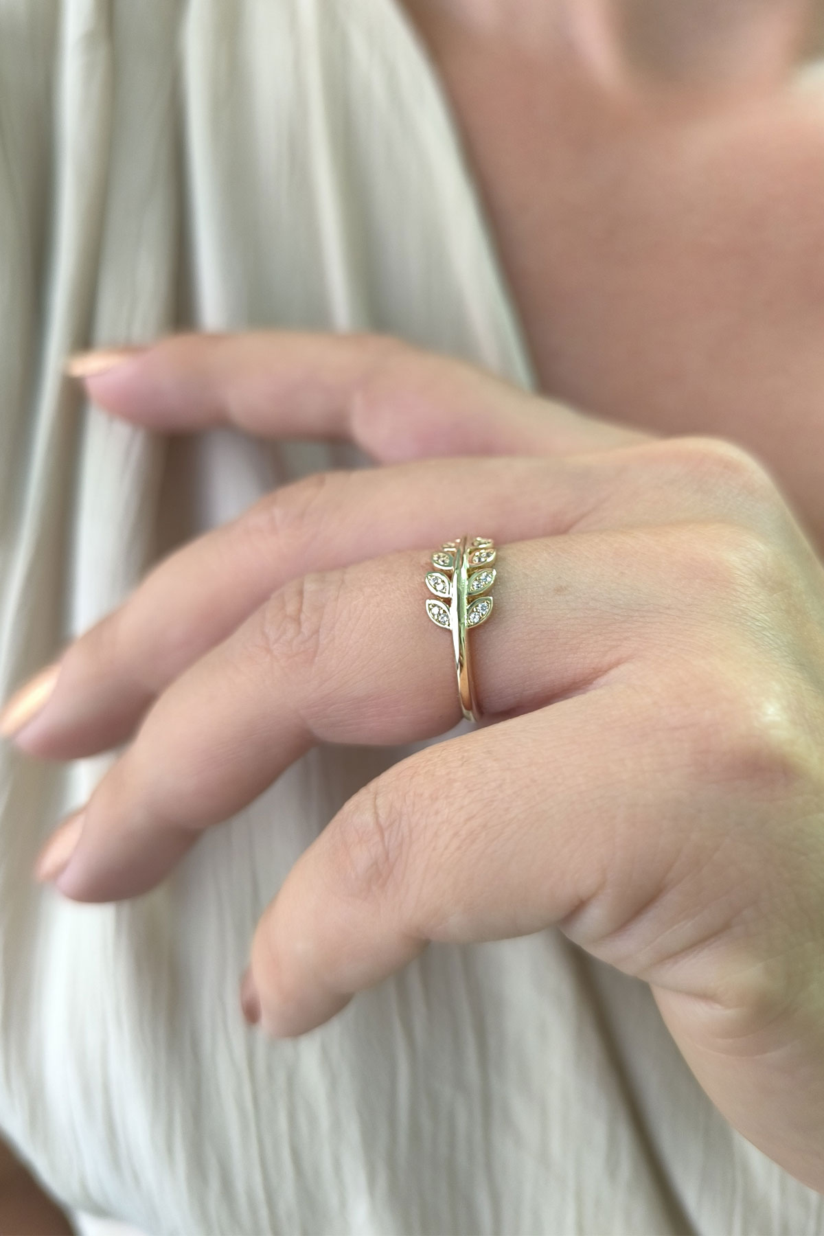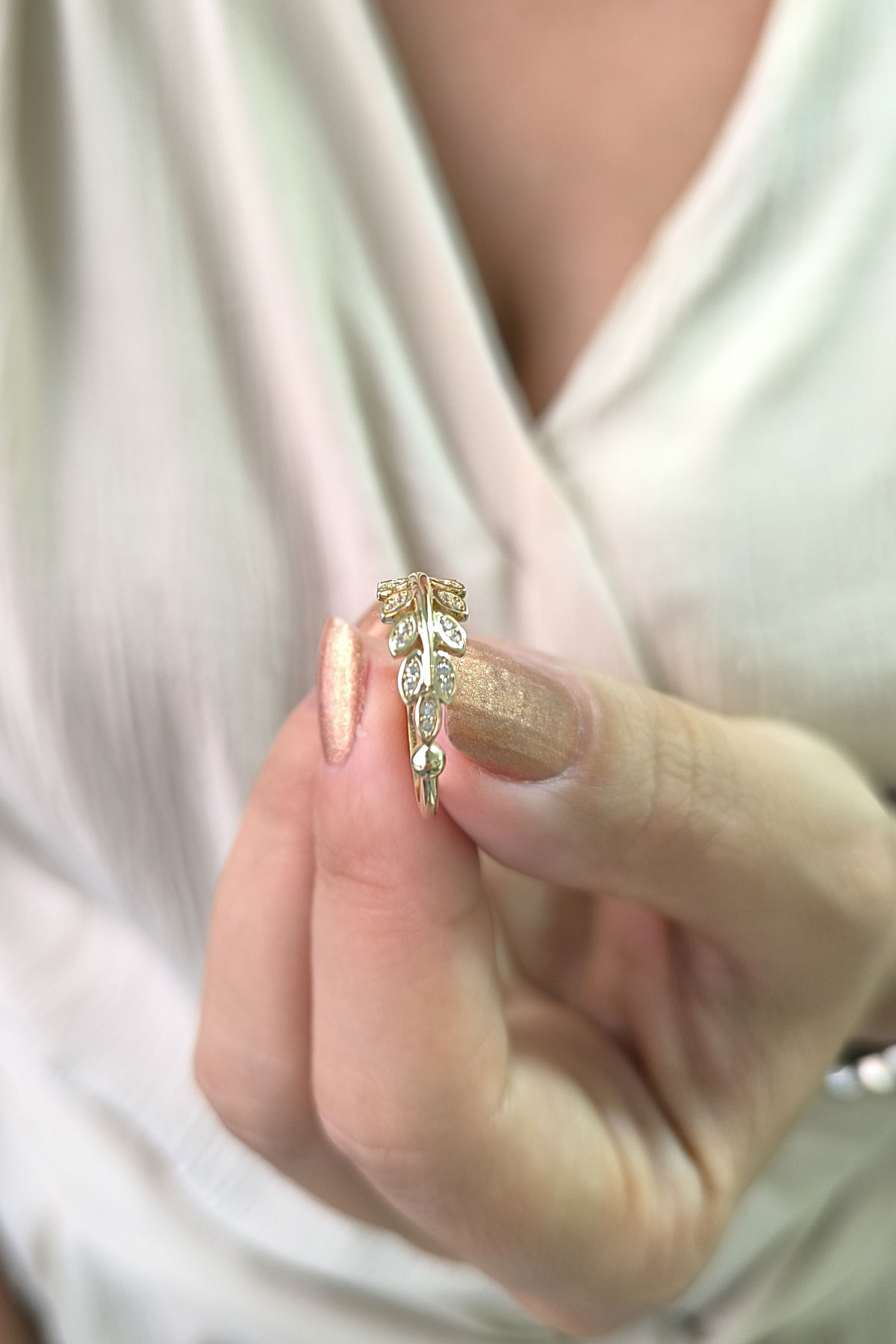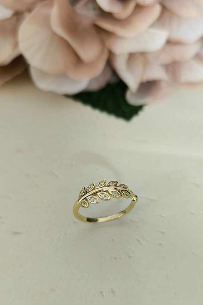 14 ayar sarı altın tasarımıyla günlük kullanıma uygun parmağınızda stilinize hava katacak 2.40 gram ağırlığında zirkon taşlı yaprak kadın yüzük.