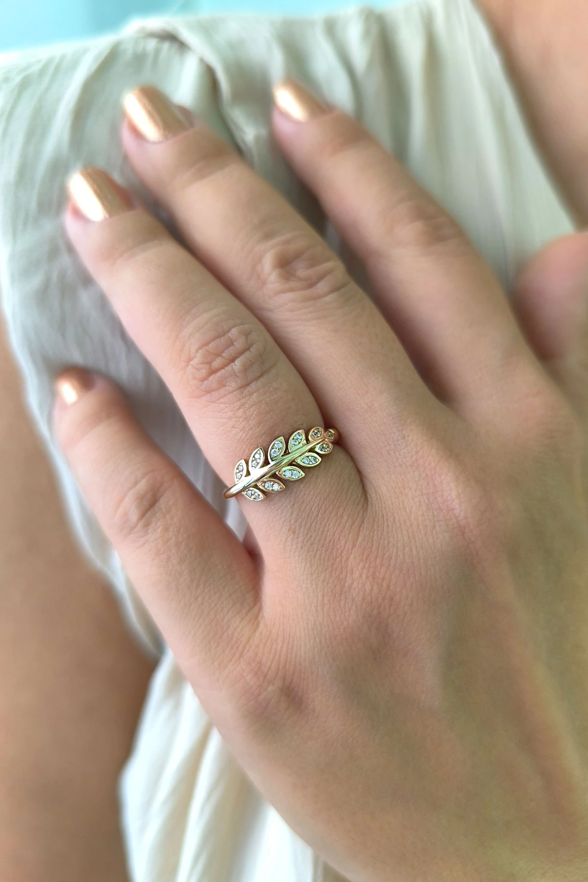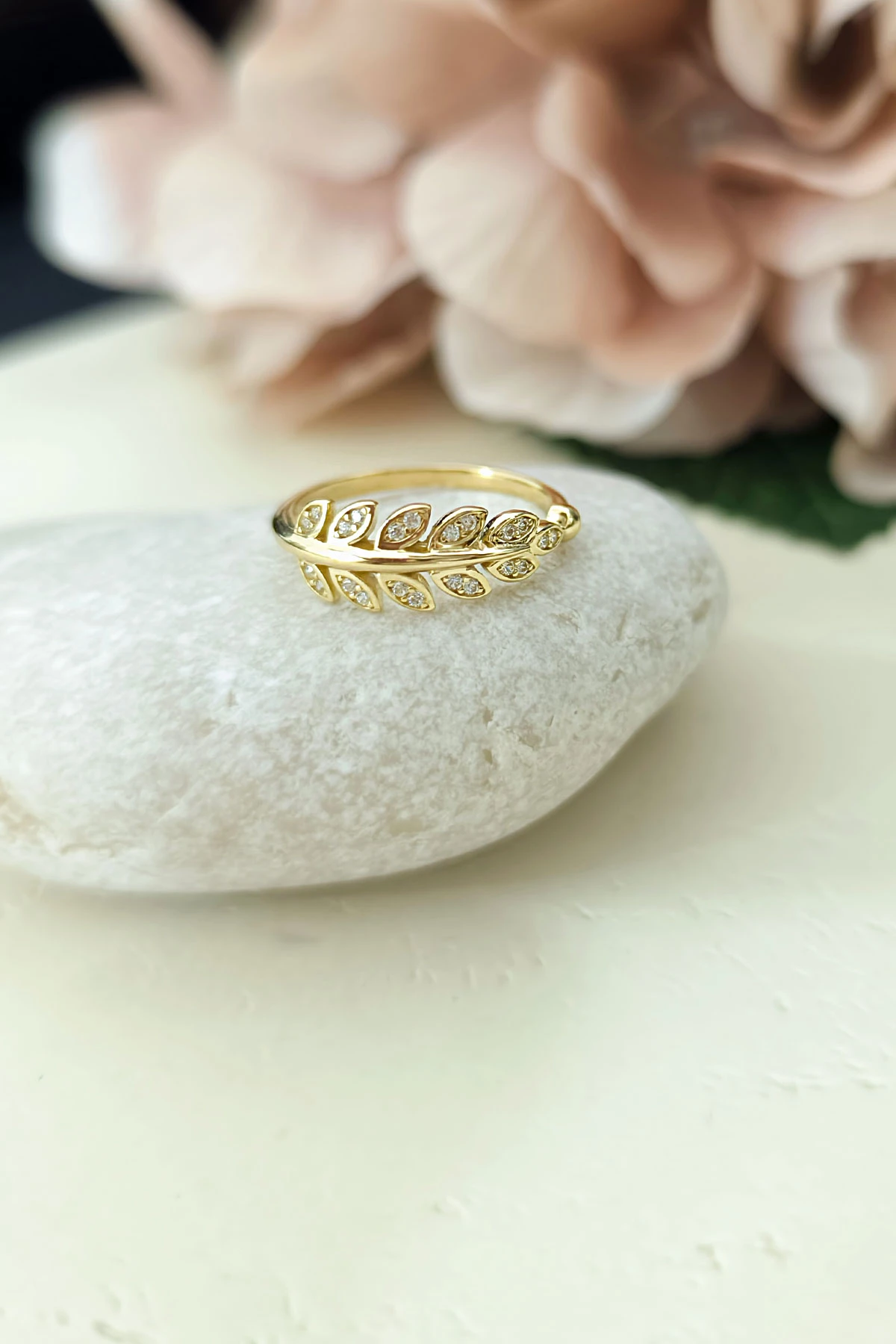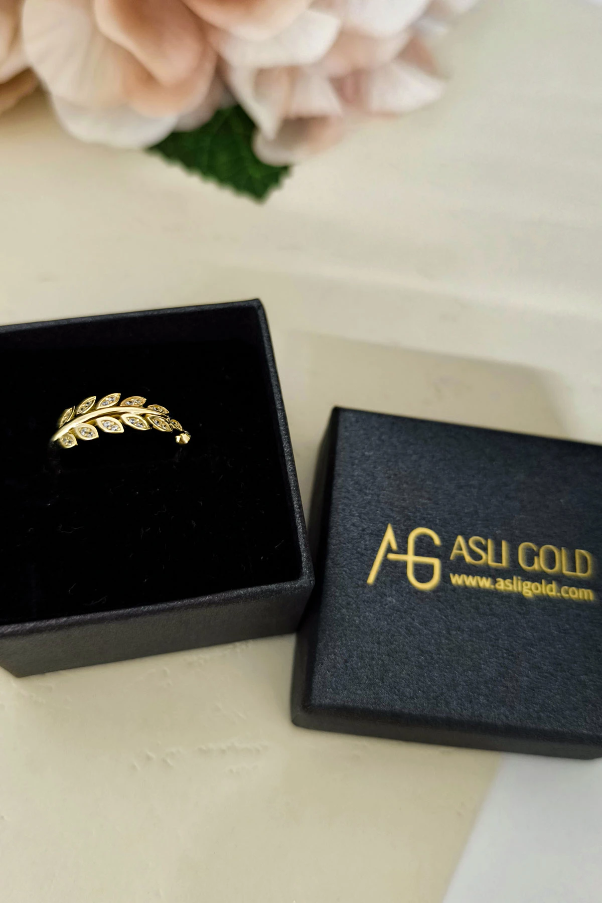 14 ayar sarı altın tasarımıyla günlük kullanıma uygun parmağınızda stilinize hava katacak 2.40 gram ağırlığında zirkon taşlı yaprak kadın yüzük.