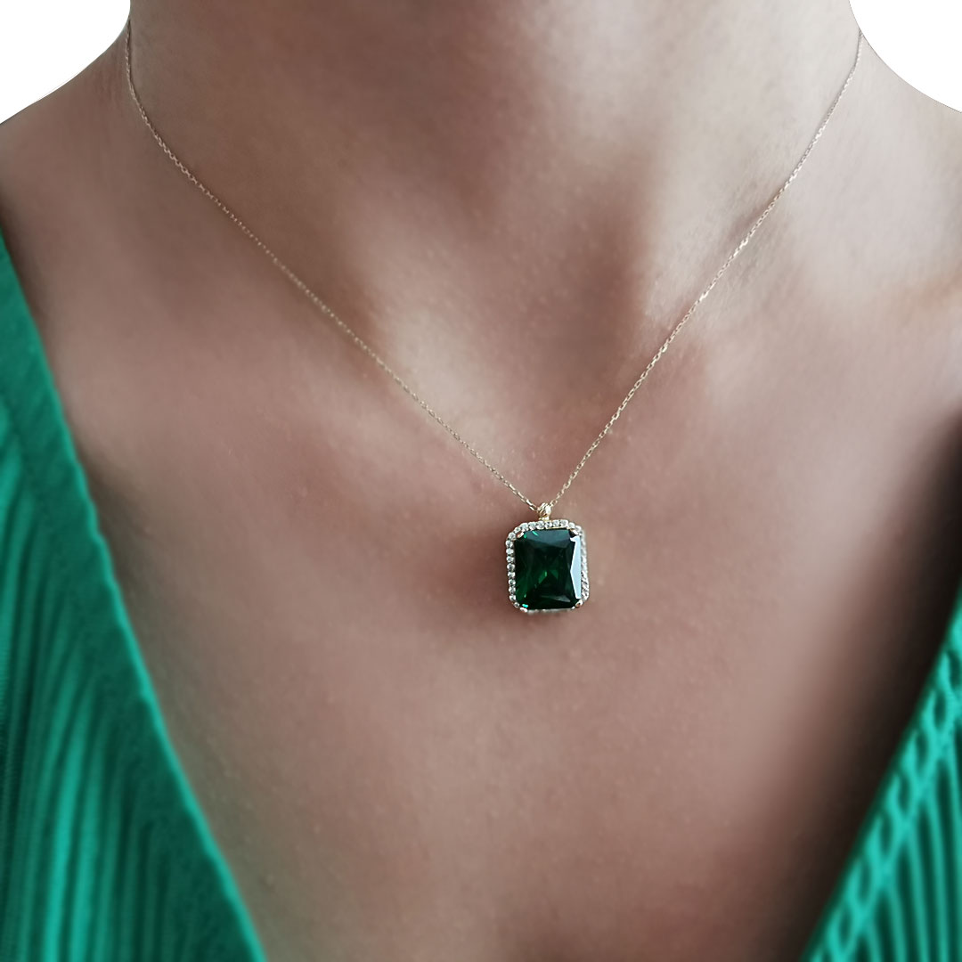 45 Cm zincirli 3.95 gr. 1.1 cm boyutunda yeşil baget taşlı model minimal 14 ayar altın kolye.
