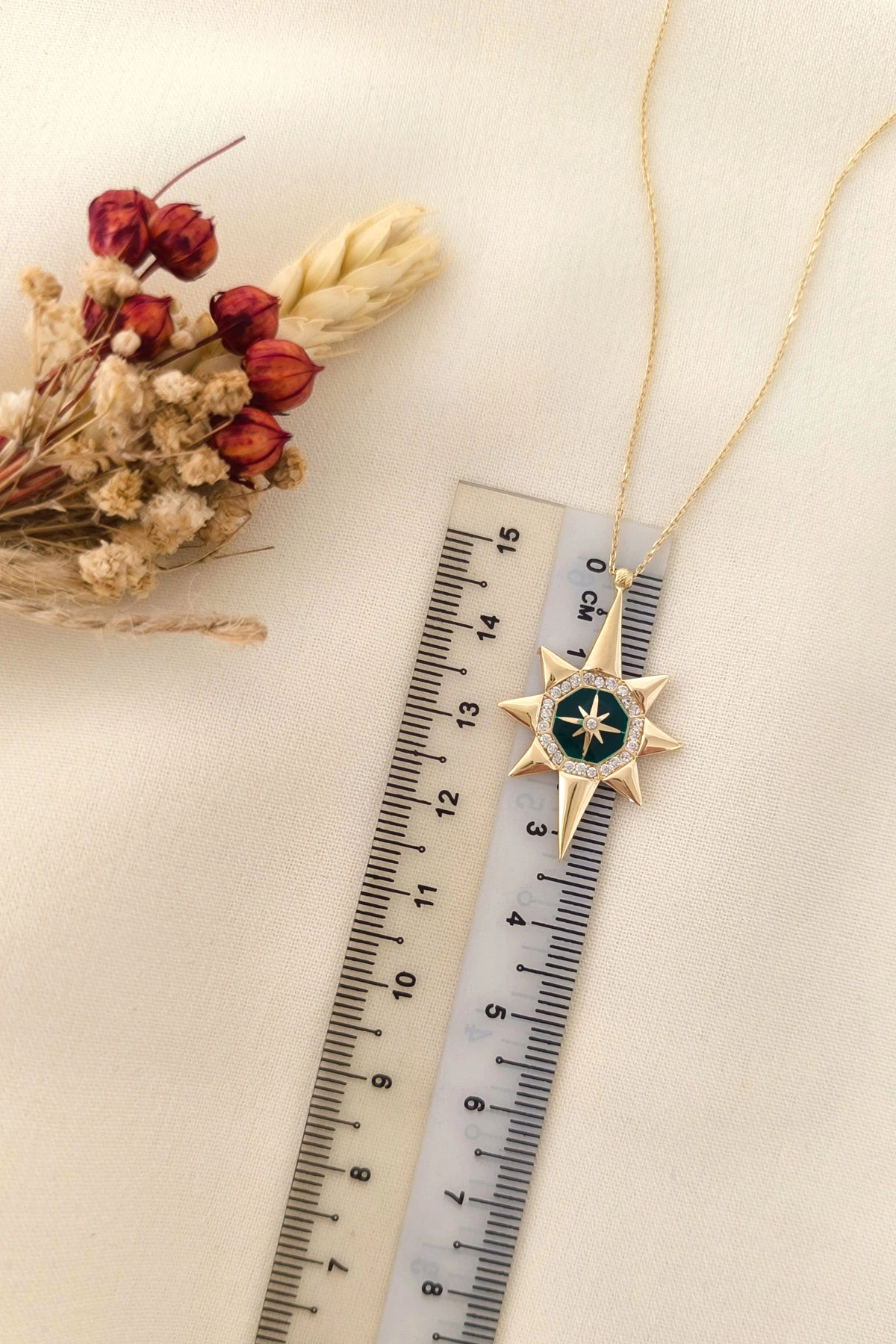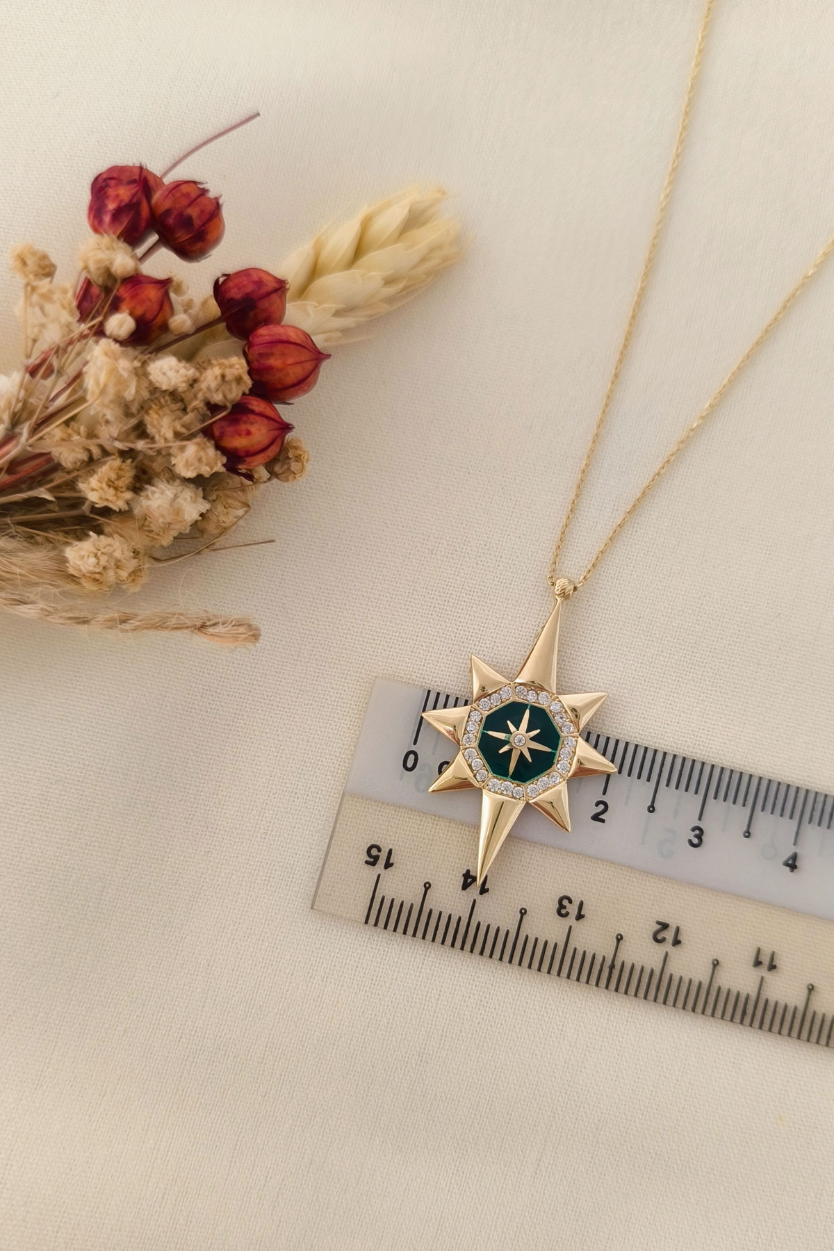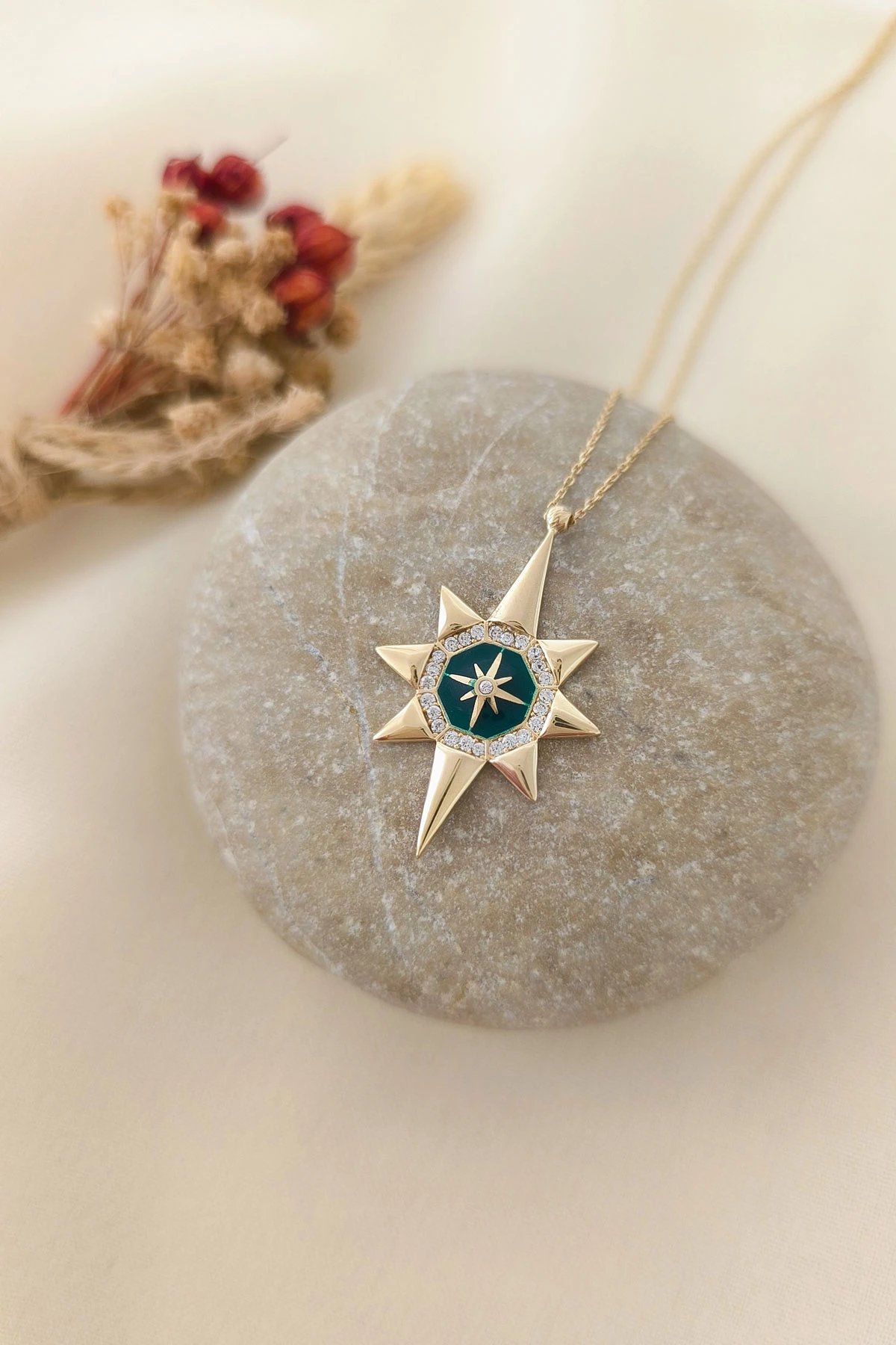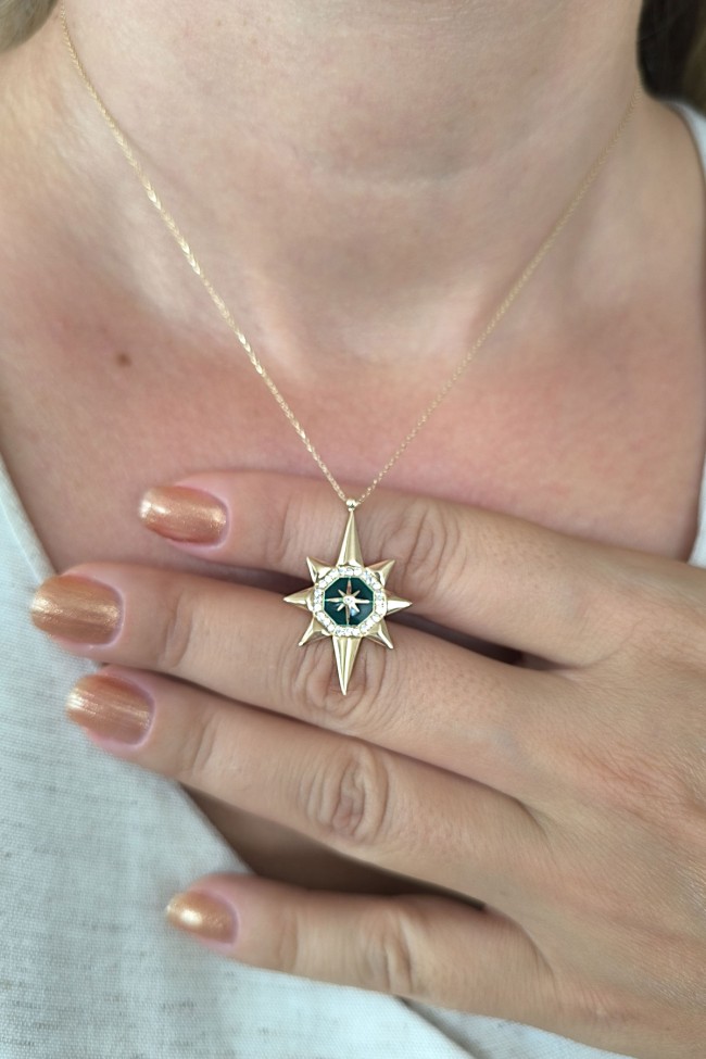 45 Cm zincirli 3.10 gr. 3,3 cm boyutunda zirkon taş detaylı yeşil mineli model 14 ayar altın kuzey yıldızı kolye.