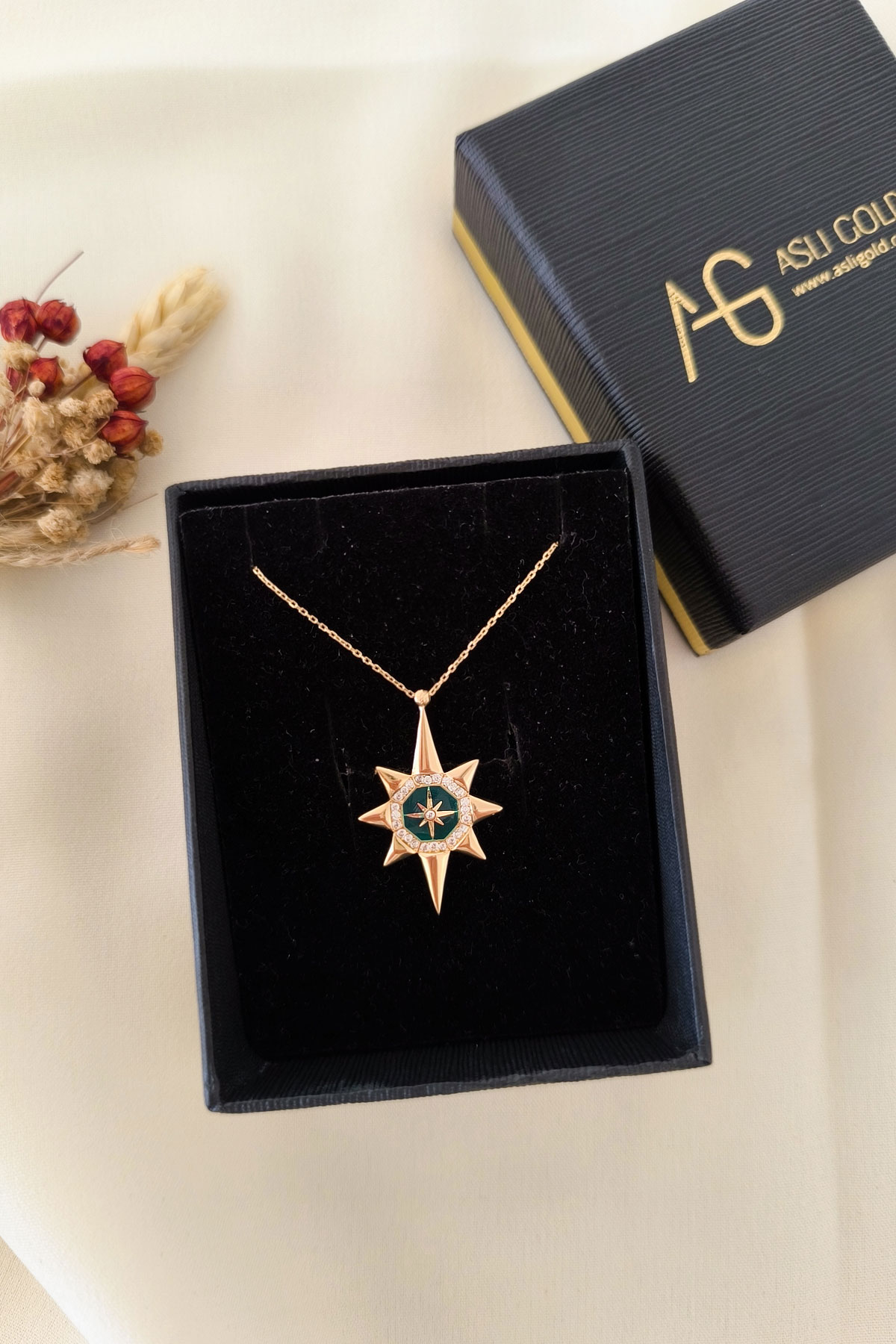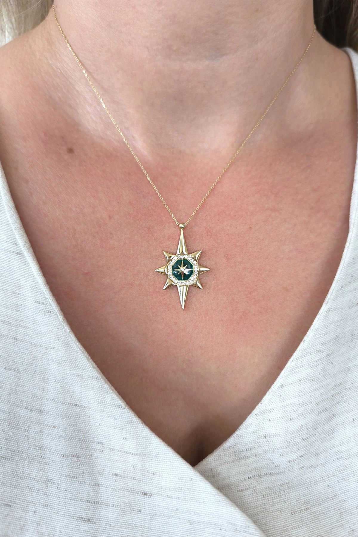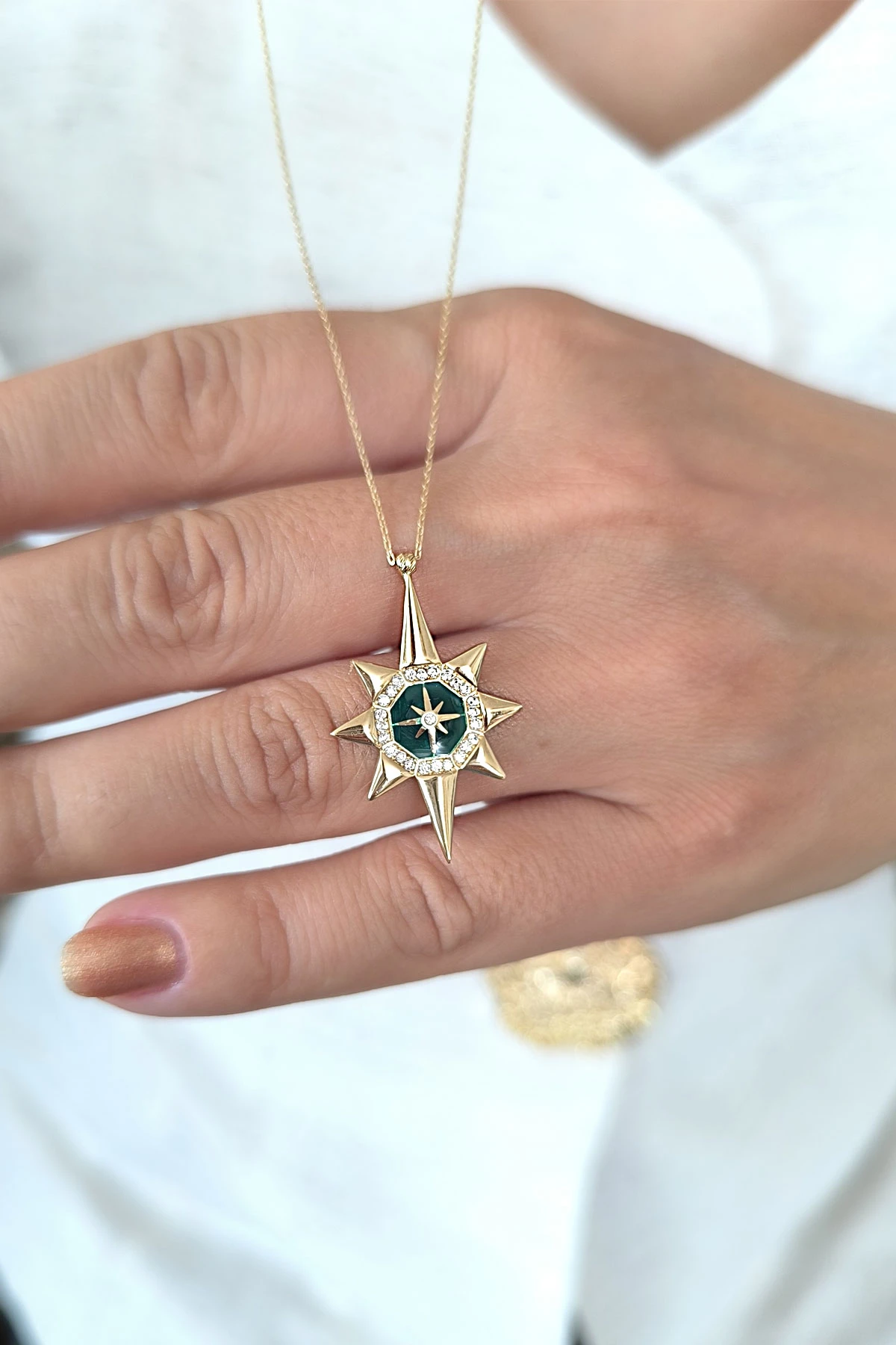 45 Cm zincirli 3.10 gr. 3,3 cm boyutunda zirkon taş detaylı yeşil mineli model 14 ayar altın kuzey yıldızı kolye.