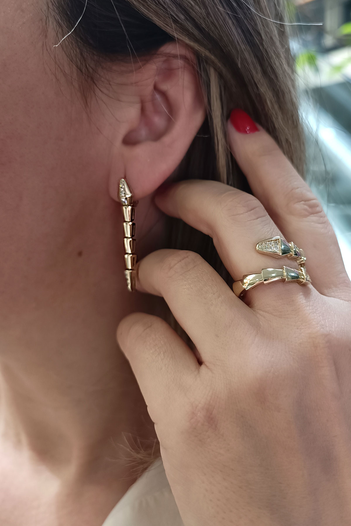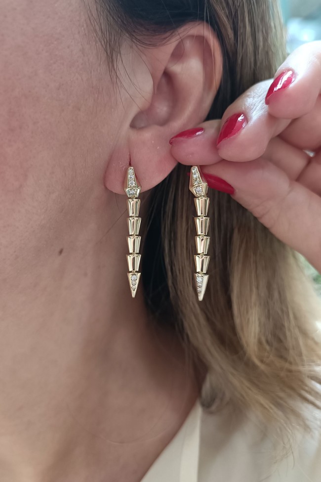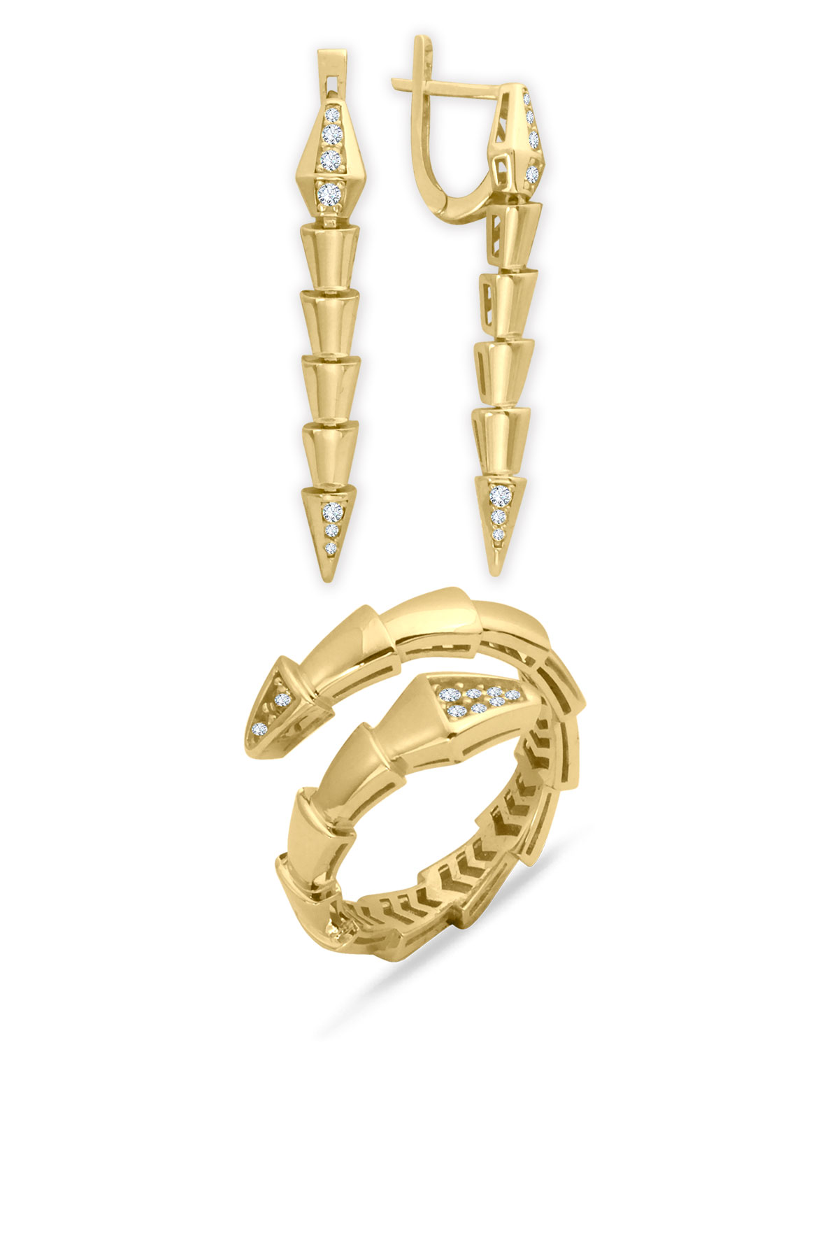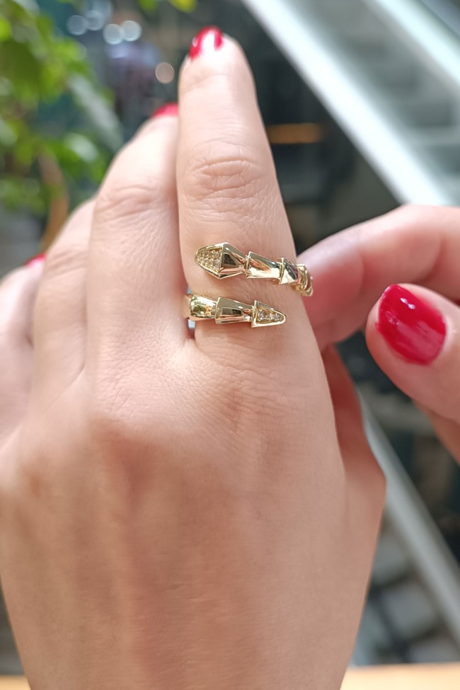 14 Ayar şık ve modern tasarım günlük kullanıma uygun taşlı ışıl ışıl özel yılan tasarımıyla iddialı bir model 9.60 gram ağırlığında altın yüzük ve küpeden oluşan iki parçalı takı seti.