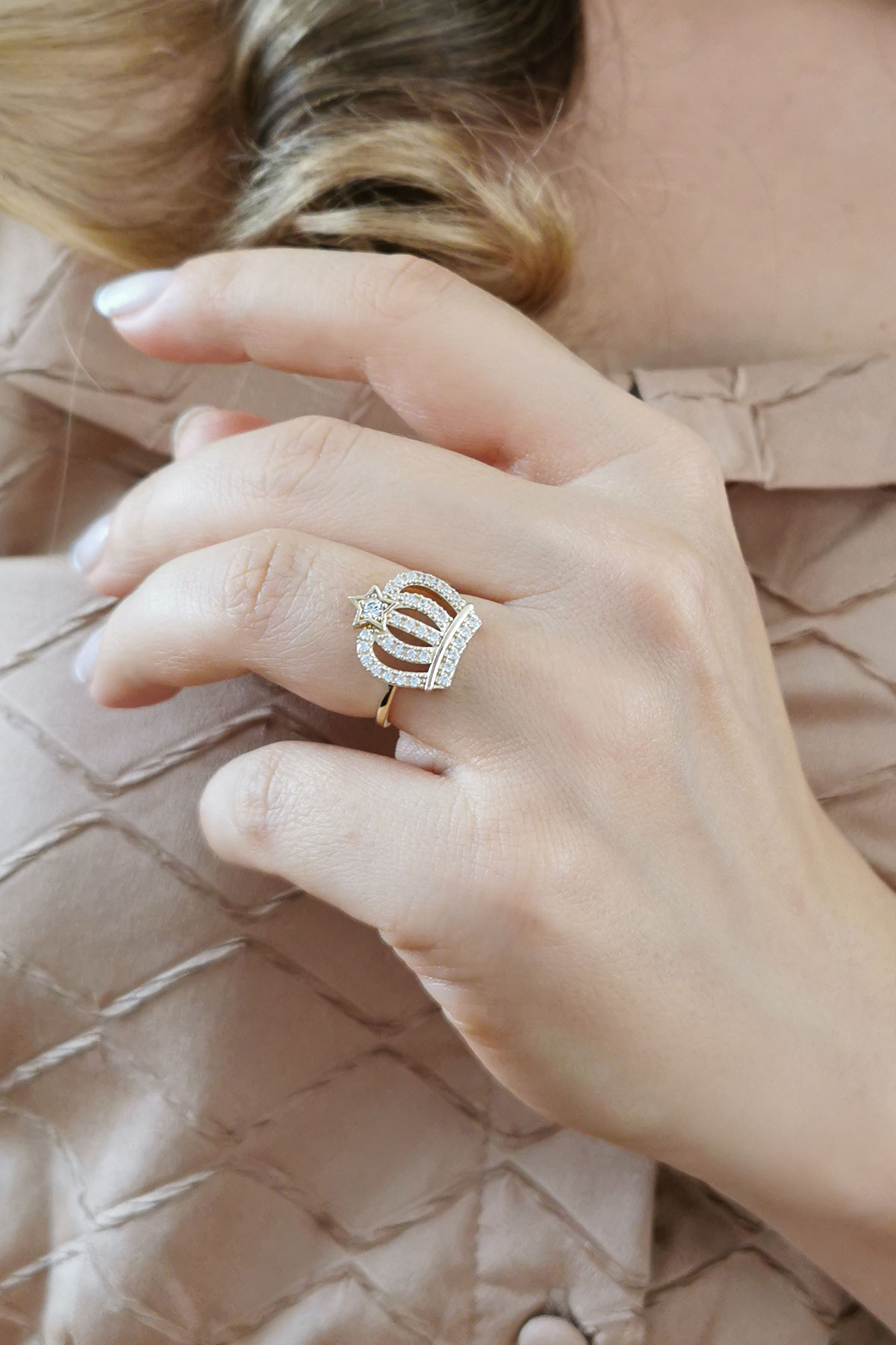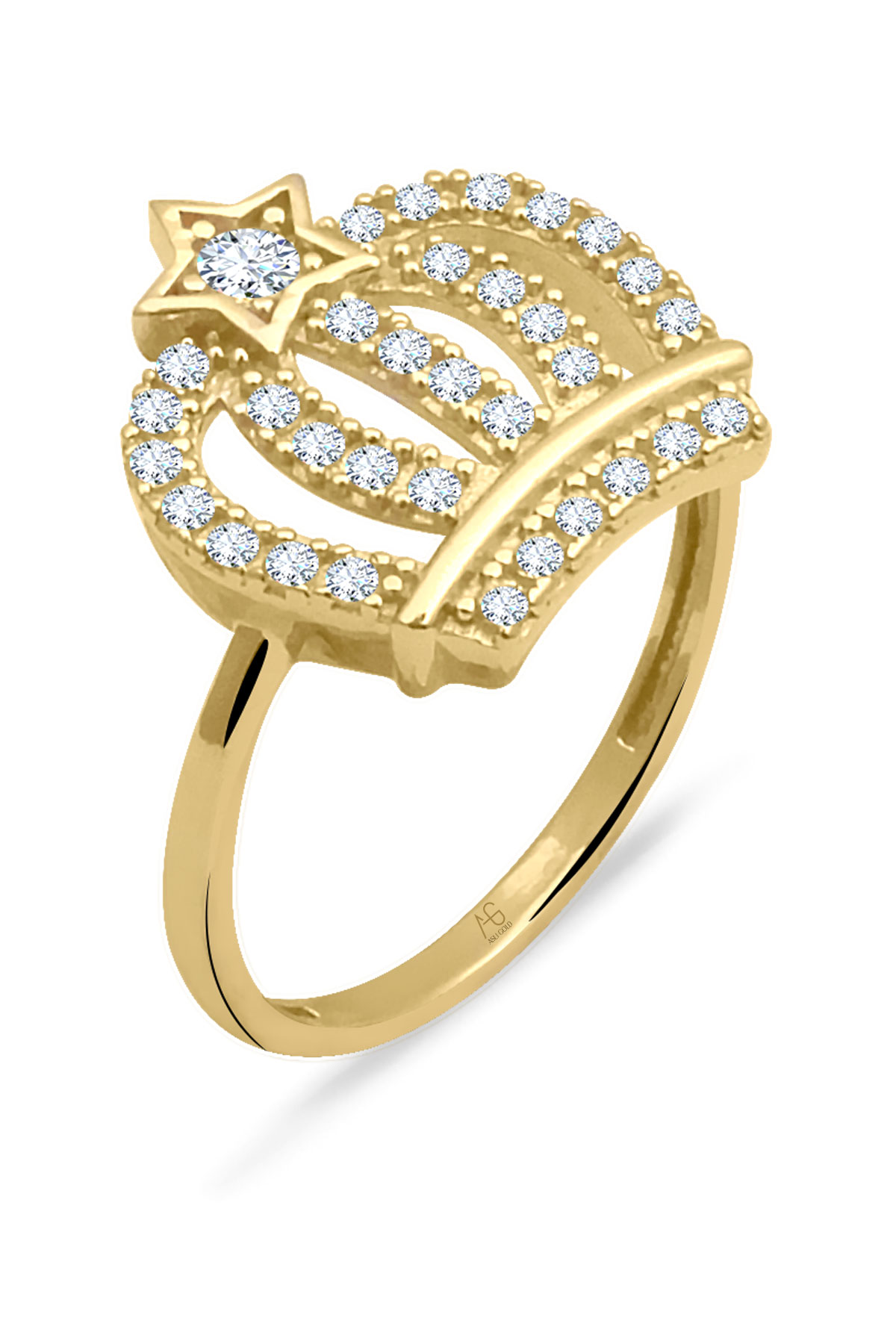 14 Ayar sarı altın kombinasyonlu taç tasarım yıldız detaylı günlük kullanıma uygun 2.55 gram ağırlığında zirkon taşlı modern kadın yüzük.