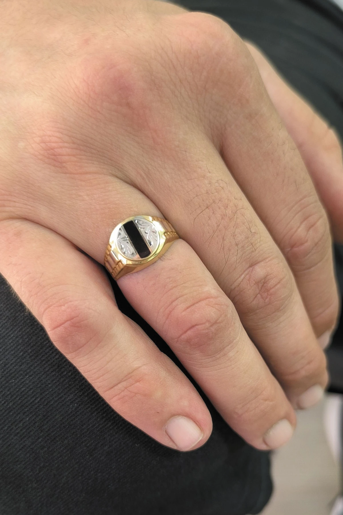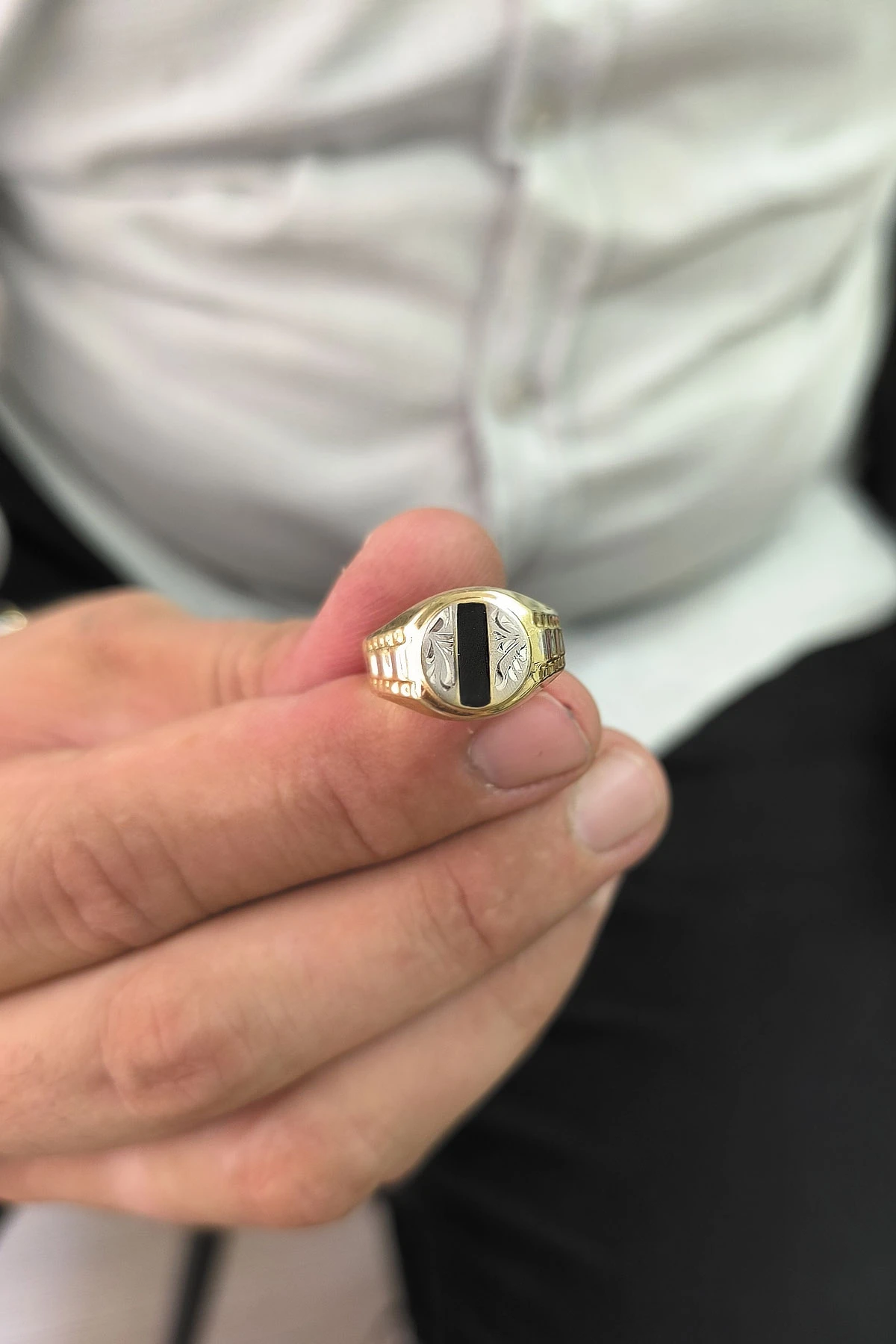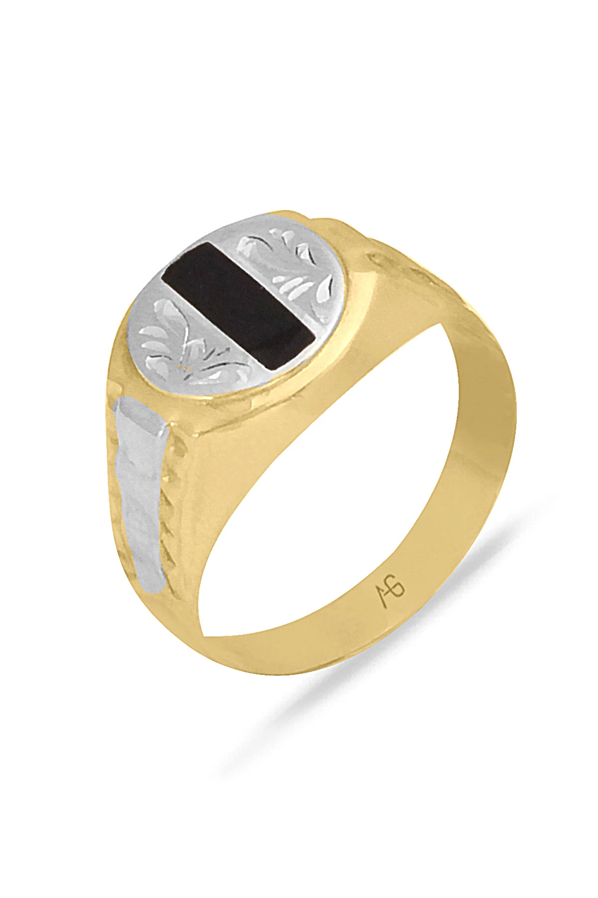 2.70 Gr. ağırlığında sarı altın özel kalem işleme ve siyah şerit detaylı yuvarlak dolgun şık bir modele sahip 14 ayar altın erkek yüzük.