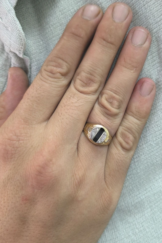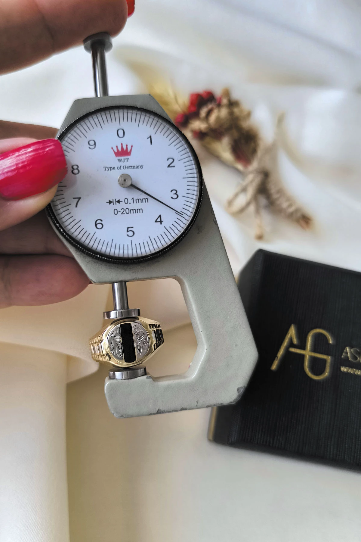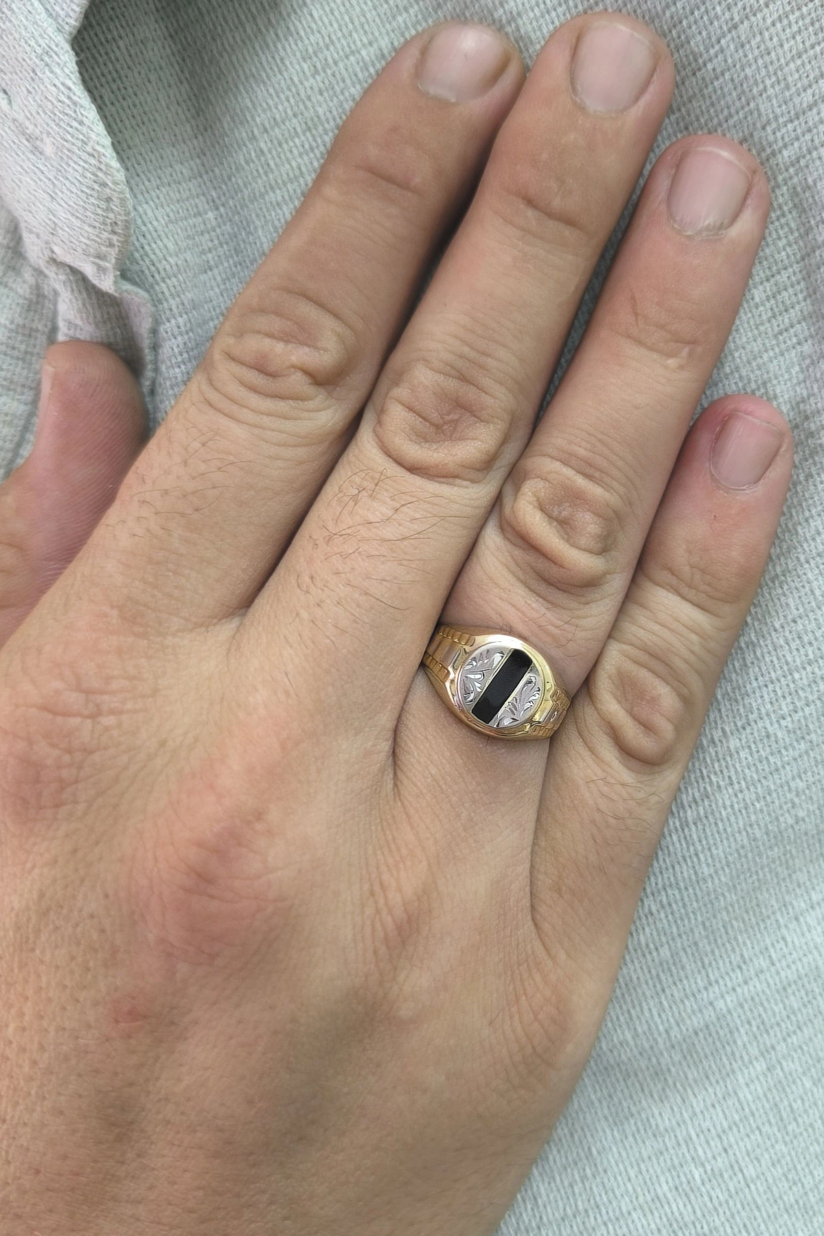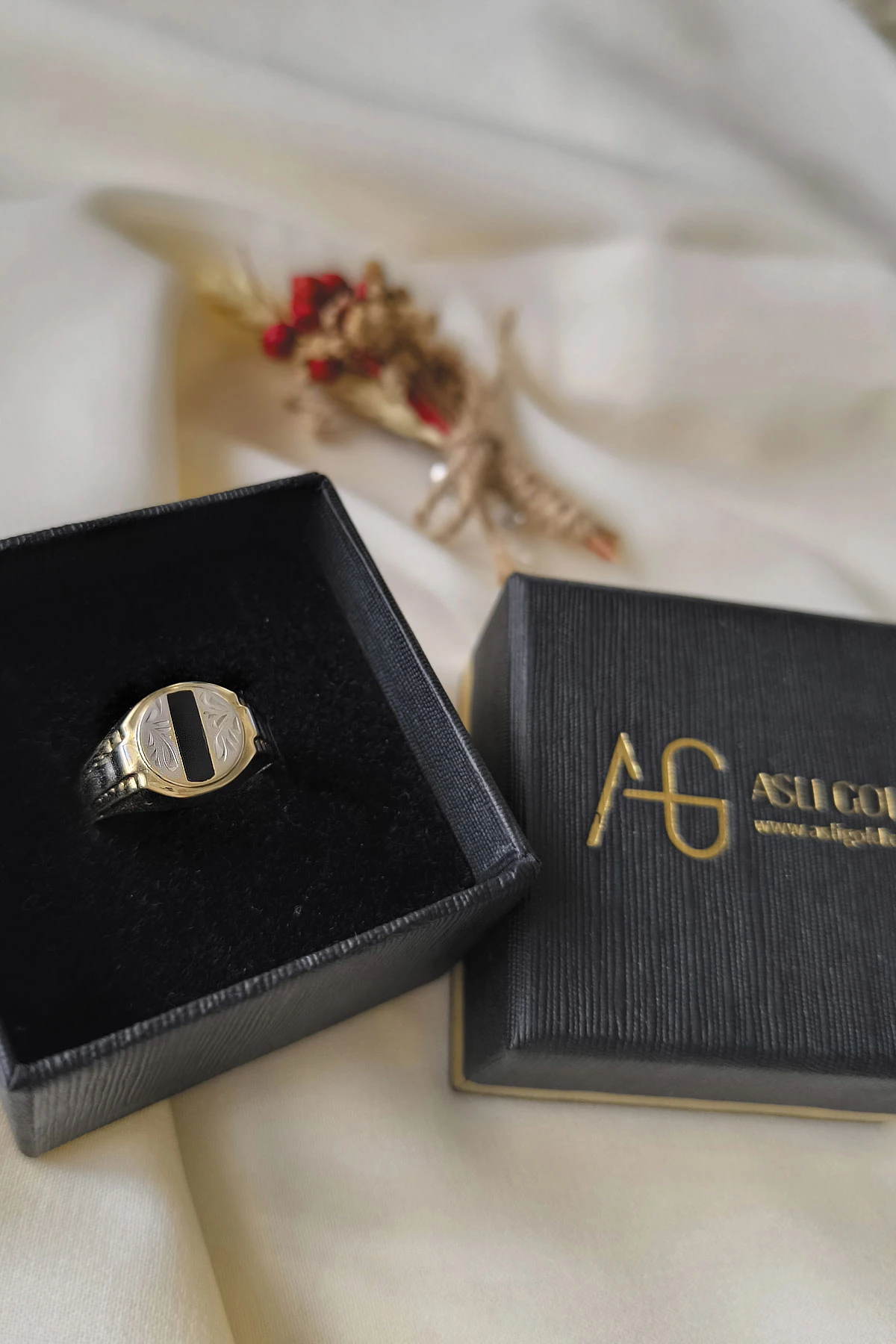 2.70 Gr. ağırlığında sarı altın özel kalem işleme ve siyah şerit detaylı yuvarlak dolgun şık bir modele sahip 14 ayar altın erkek yüzük.