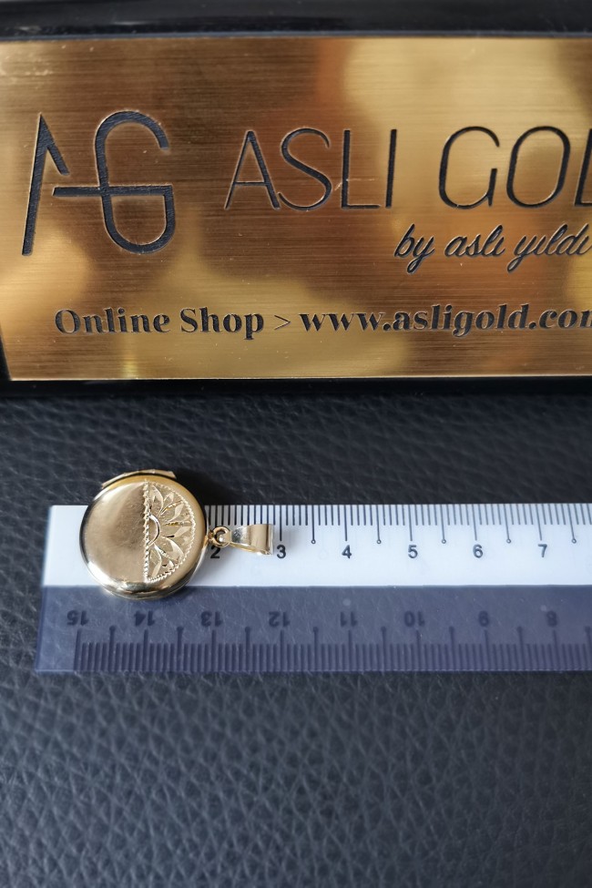 14 Ayar altın 6.10 gram ağırlığında şık ve gündelik kullanıma uygun 3 cm iadeal boy güneş işlemeli yuvarlak madalyon kolye.