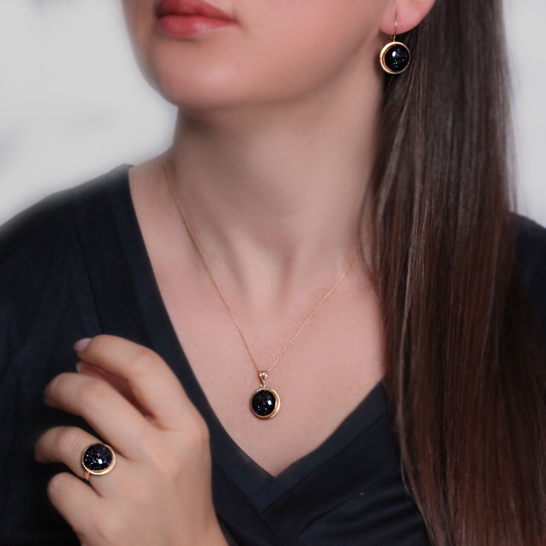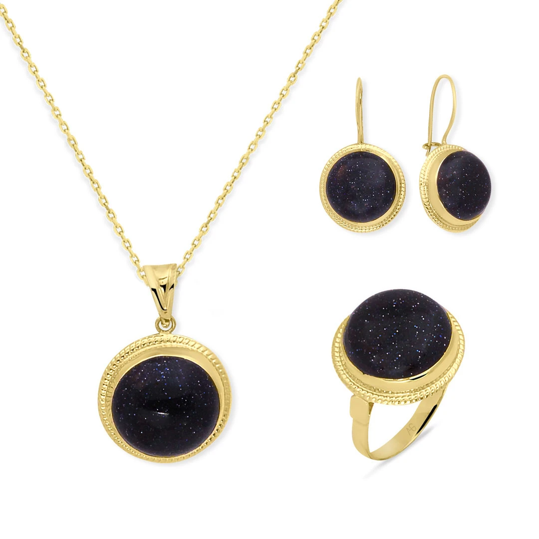 14 Ayar nostalji tasarımına eşlik eden yuvarlak simli siyah taş detaylı şık ve ışıltılı tasarımlara düşkün kadınların severek kullanacakları elegan duruşa sahip günlük kullanıma uygun 11.45 gram ağırlığında altın yüzük, küpe, kolye takım.