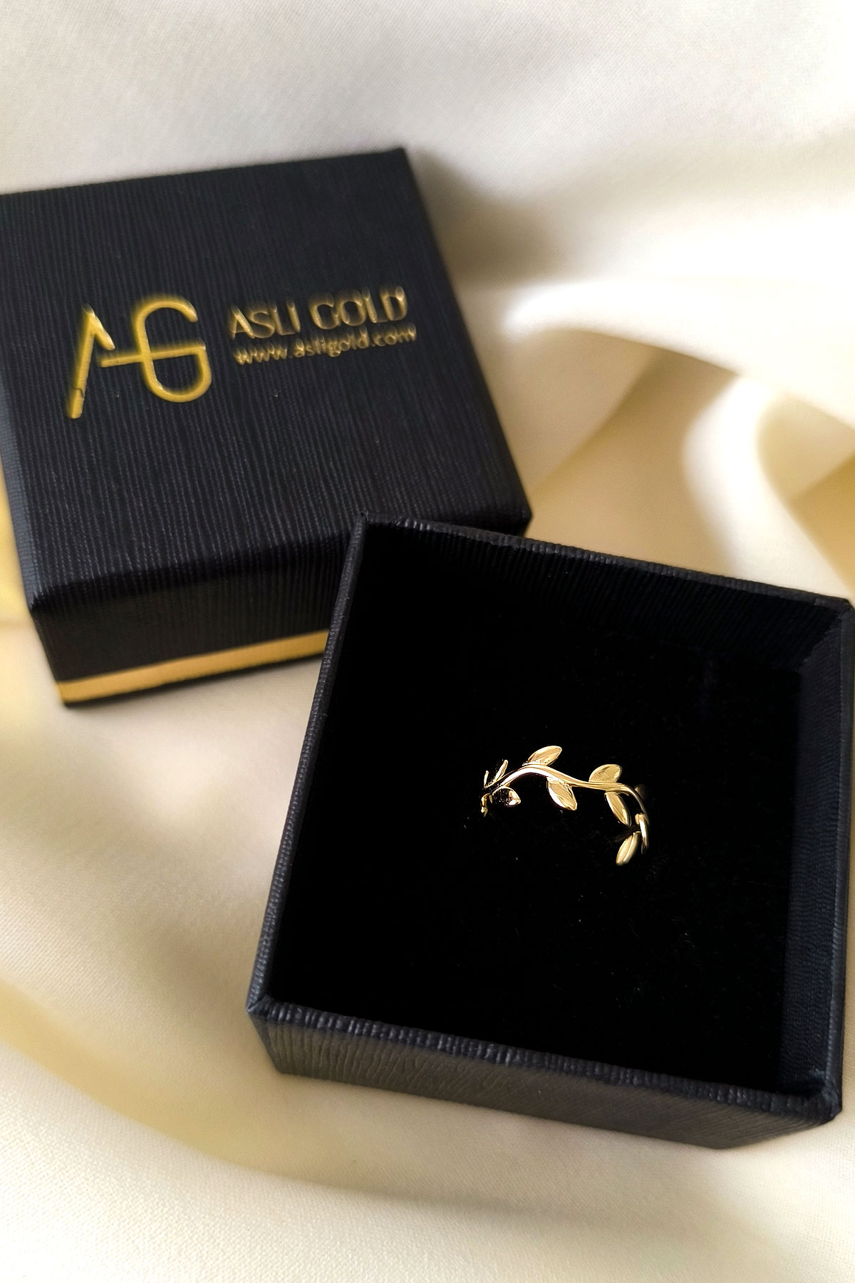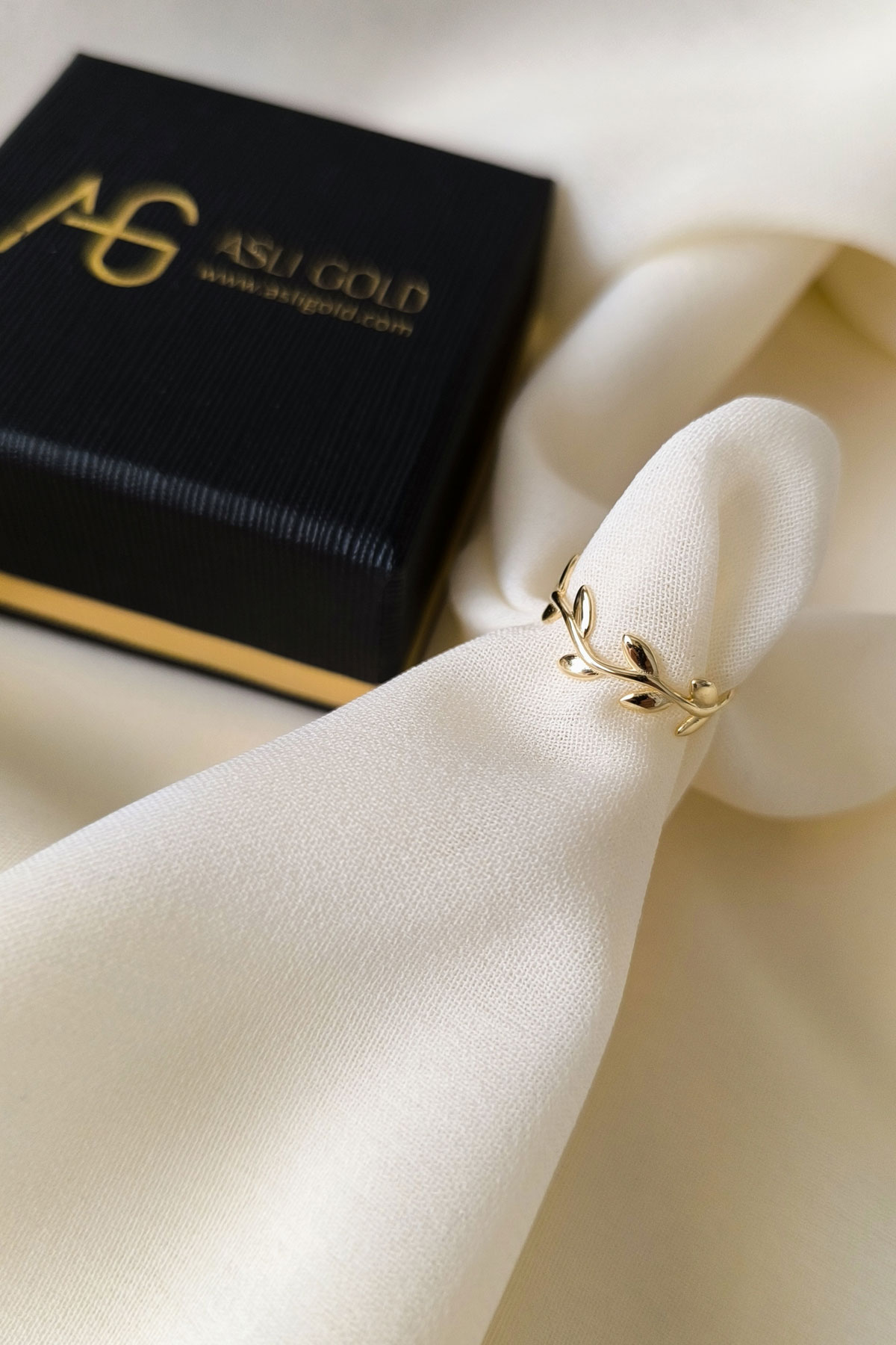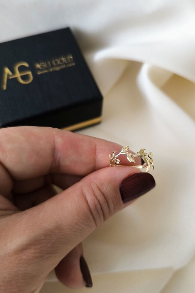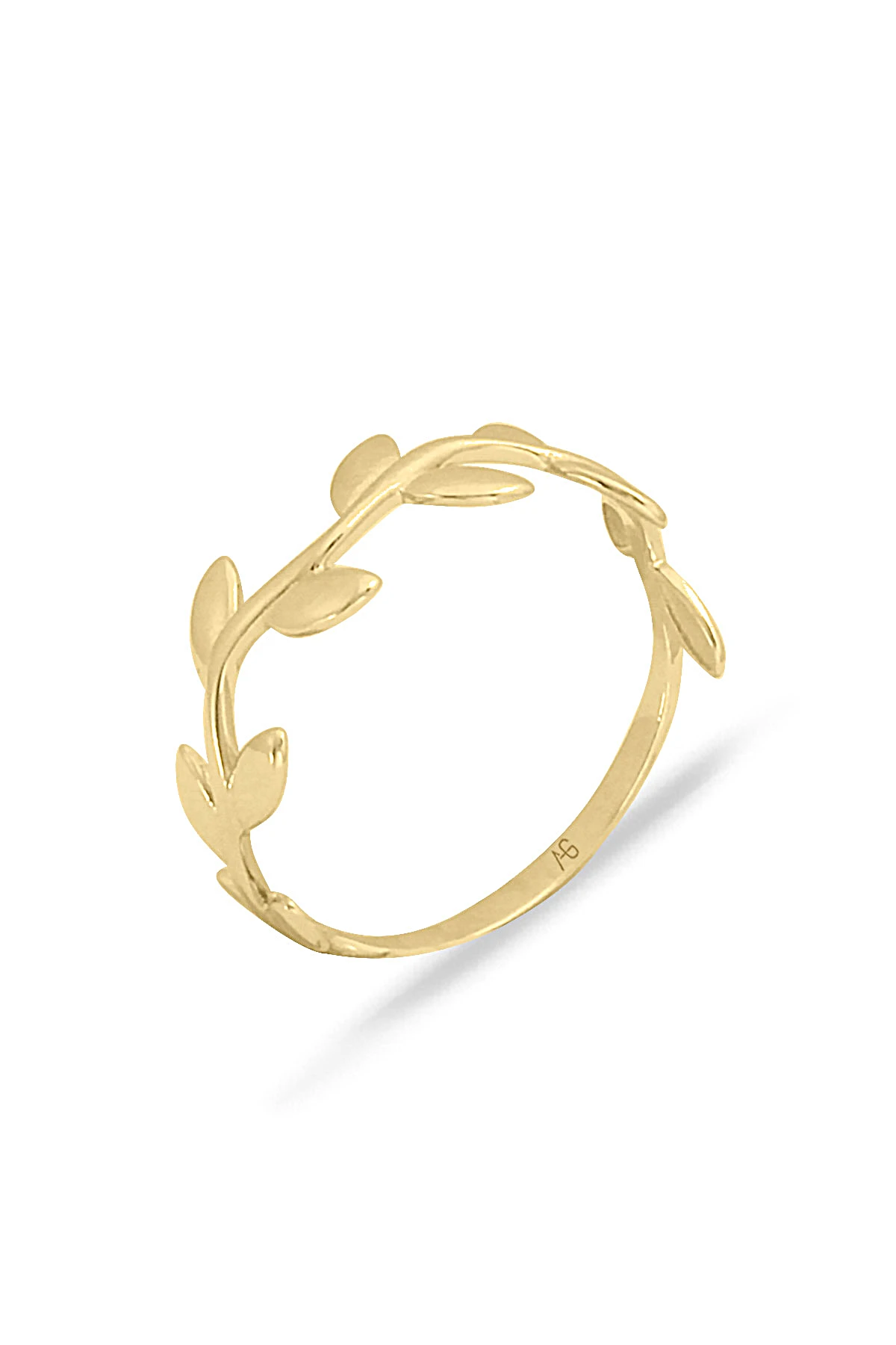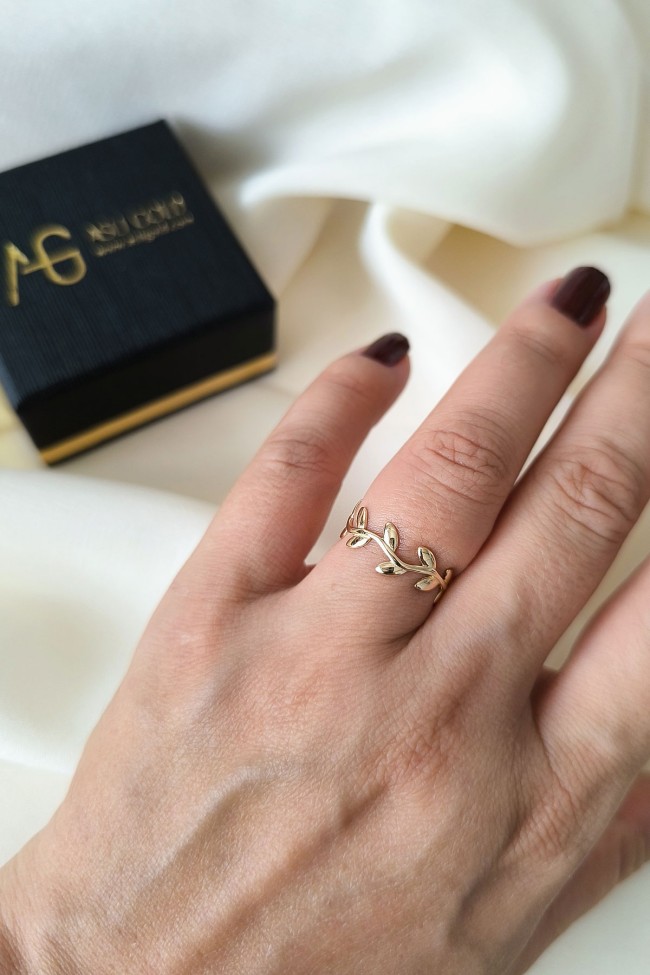 14 ayar sarı altın taşsız zeytin yaprağı tasarımıyla günlük kullanıma uygun 1.25 gram ağırlığında minimal tasarım altın kadın yüzük.