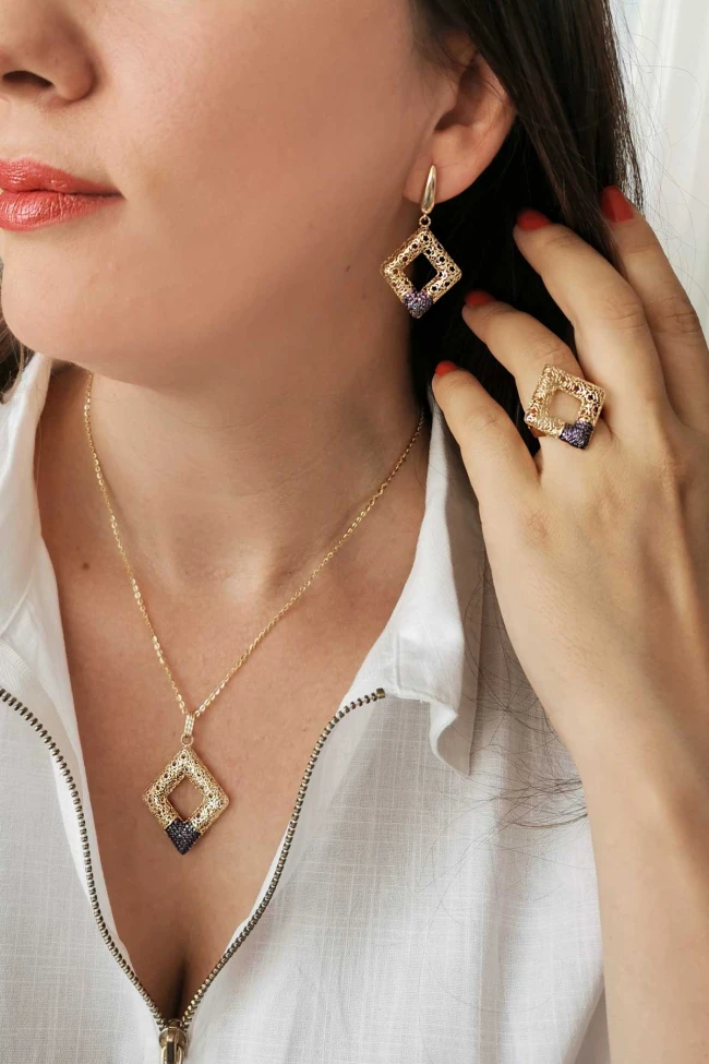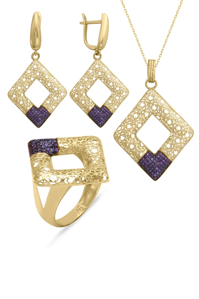 14 Ayar günlük kullanıma da uygun farklı tasarımlar ile güne imzasını atmayı seven kadınlara özel bir modele sahip tüm kombinlerinize eşlik edecek ametist taşlı 15.35 gram ağırlığında altın füzyon ışıl ışıl italyan tasarım yüzük küpe kolye üçlü takım.
