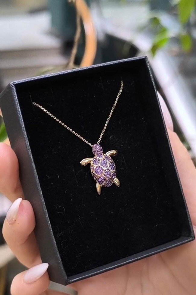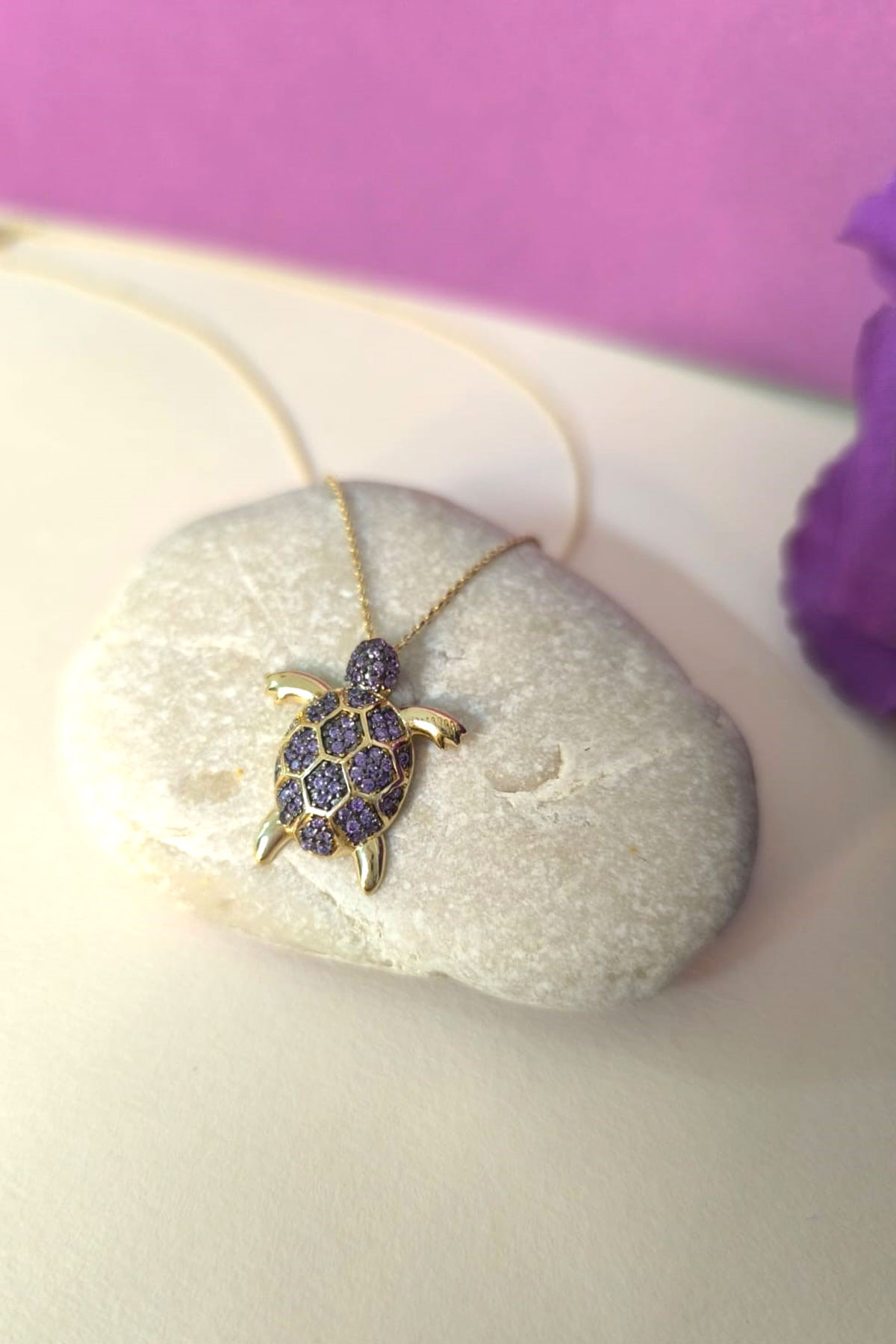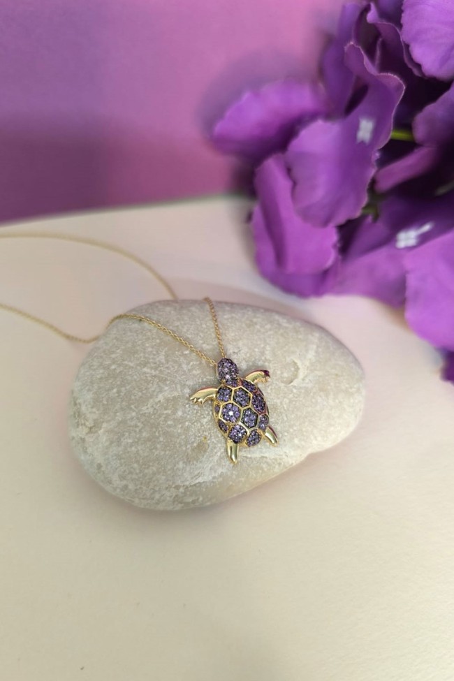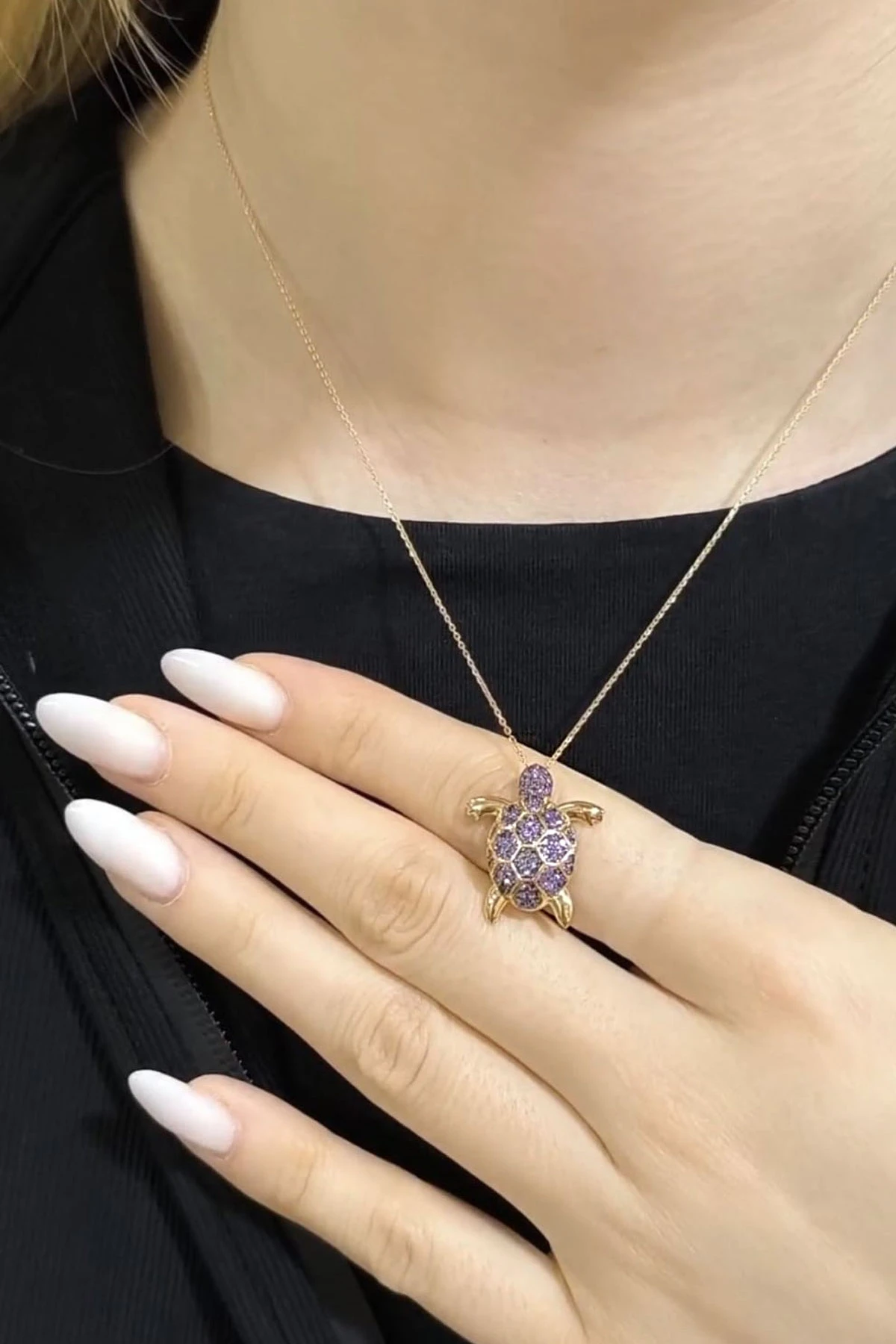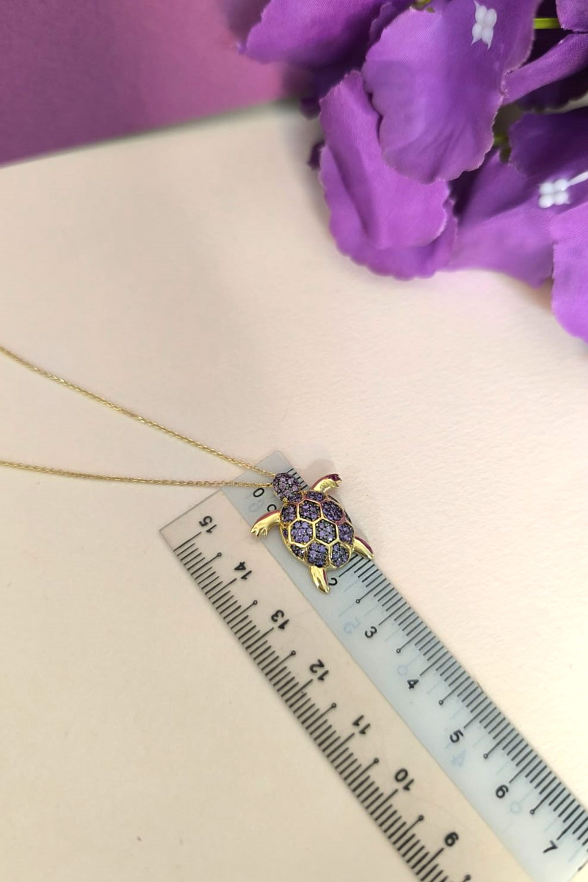14 Ayar 3.00 gram ağırlığında 45 cm kendinden zincirli dikkat çekici şık ışıl ışıl ametist taşlı kaplumbağa kolye.