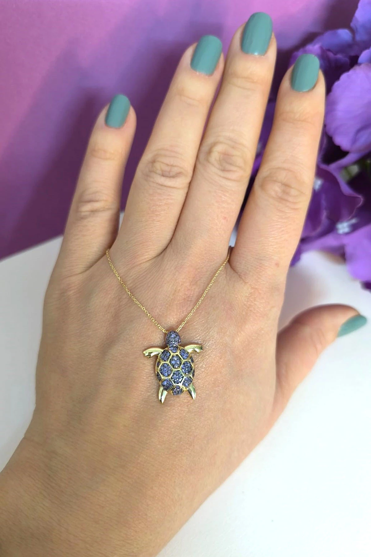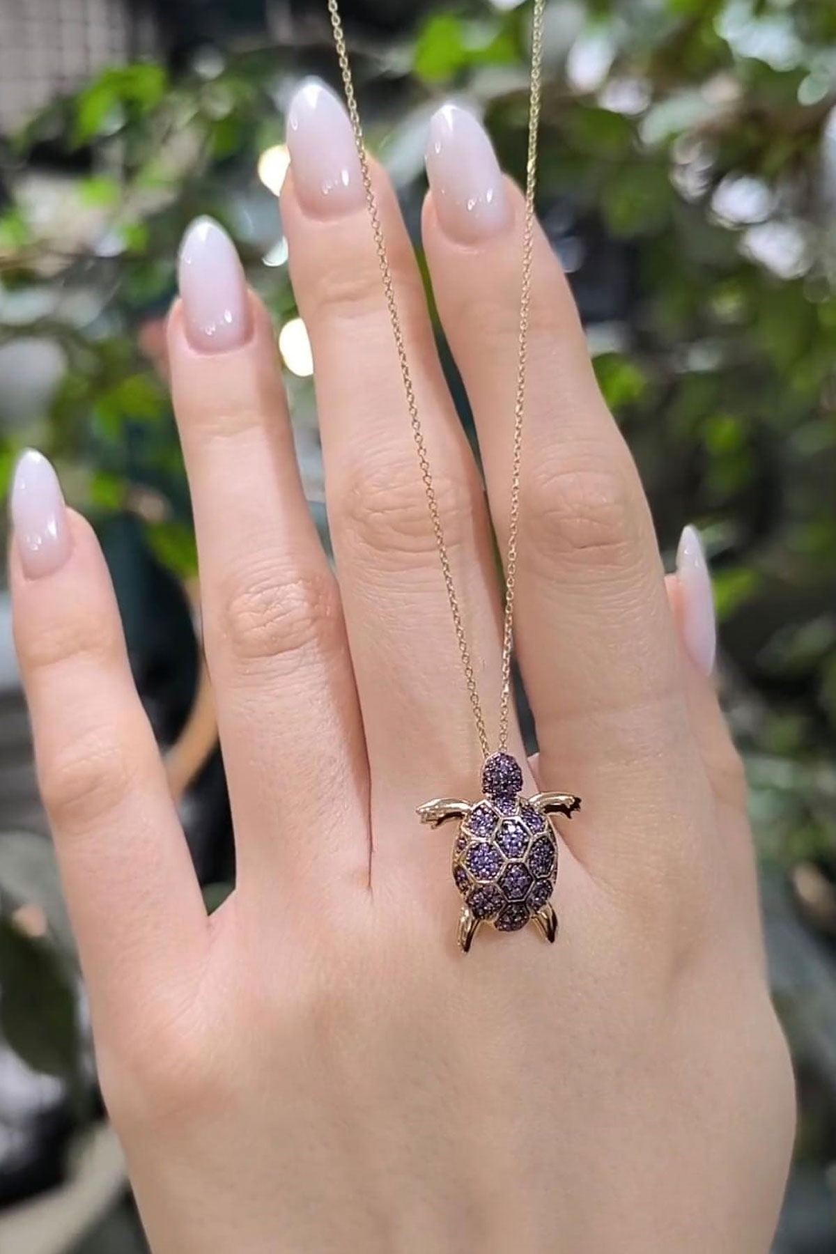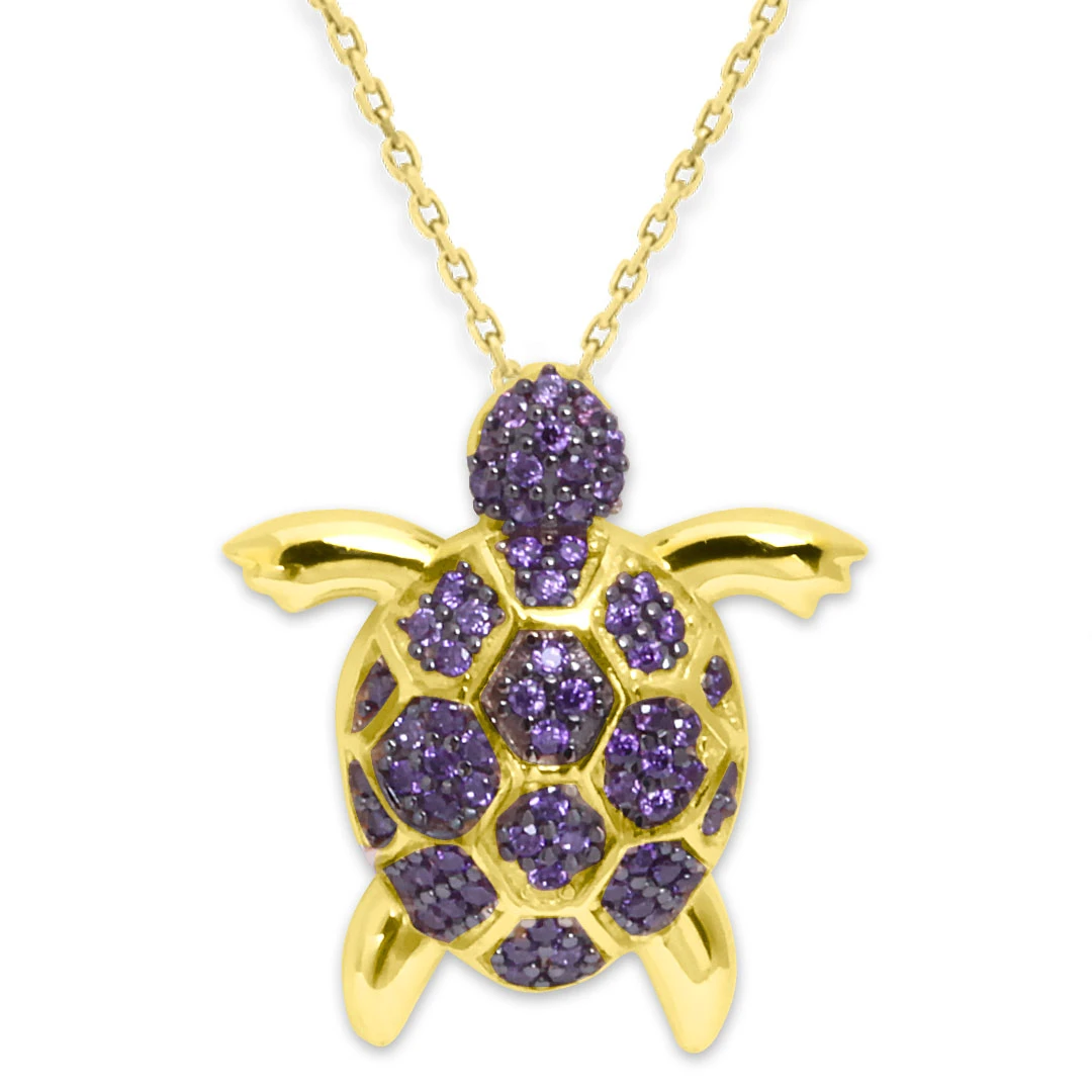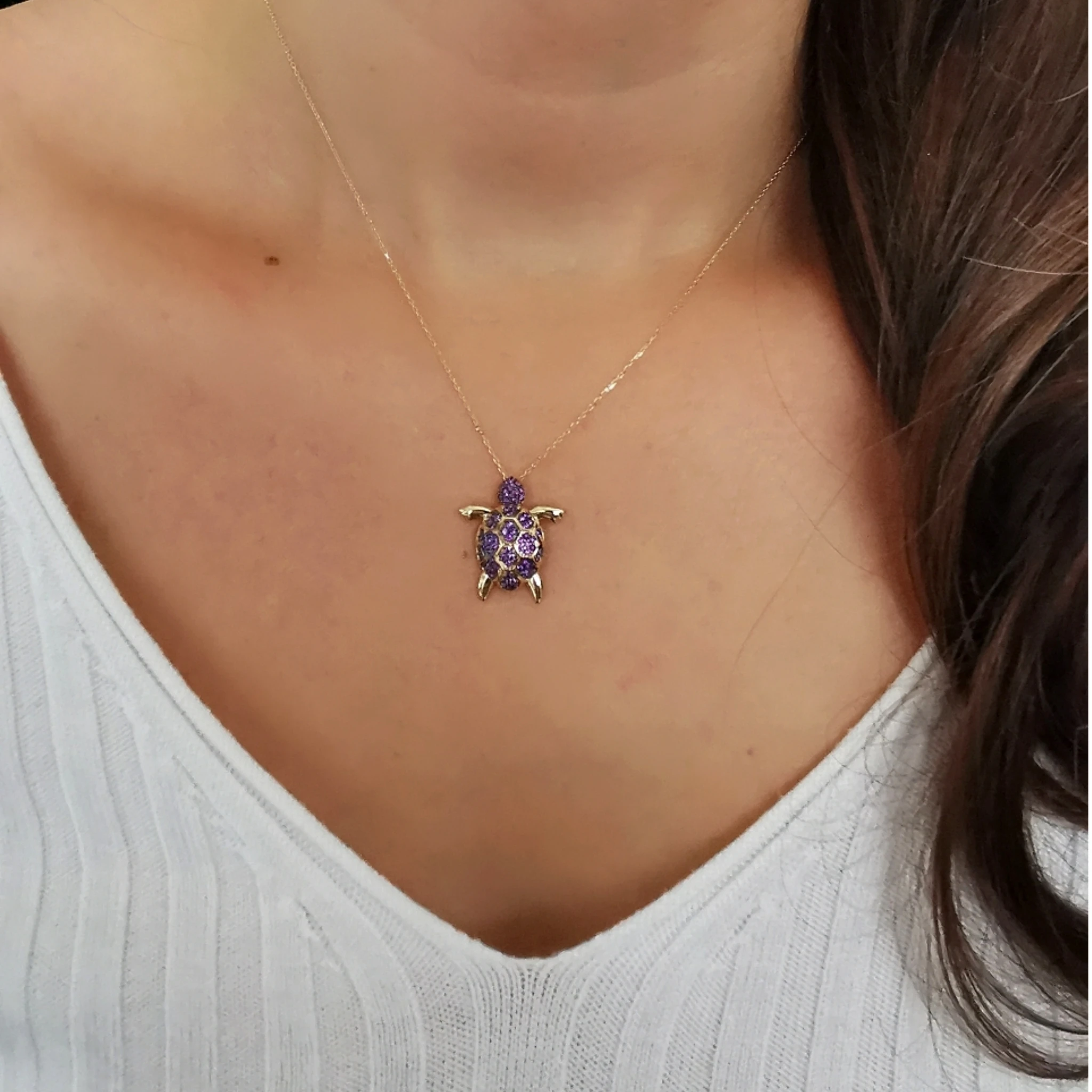 14 Ayar 3.00 gram ağırlığında 45 cm kendinden zincirli dikkat çekici şık ışıl ışıl ametist taşlı kaplumbağa kolye.