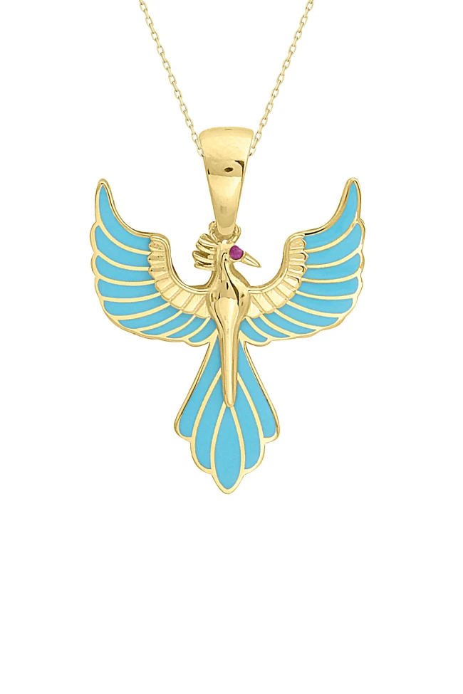 14 Ayar altın 5.30 gram ağırlığında şık ve gündelik kullanıma uygun turkuaz mine detaylı 3 cm boyunda anka kuşu tasarım charm kilit altın kolye.