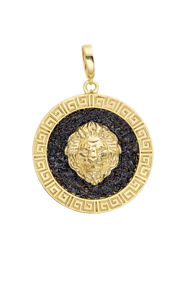 Kadim zamanlardan beri, aslan gücün, liderliğin ve cesaretin simgesi olmuştur. Bu zarif kolye ucu, işte o kadim gücü ve aslanın asaletini modern tasarımla birleştiriyor. Merkezinde ustalıkla işlenmiş, detaylarıyla büyüleyen altın sarısı bir aslan başı yer alıyor. Onun çevresini ise, tıpkı aslanın heybetini andıran, pırıltılı siyah taşlarla bezenmiş dairesel bir alan sarmalıyor. Bu siyah taşlar, aslanın içindeki gizemi ve derinliği simgelerken, altın sarısı aslan başı, onun parlayan gücünü ve kararlılığını temsil ediyor. Kolye ucunu tamamlayan Yunan anahtarı deseni ise, bu gücün ve asaletin ebedi olduğunu fısıldıyor.