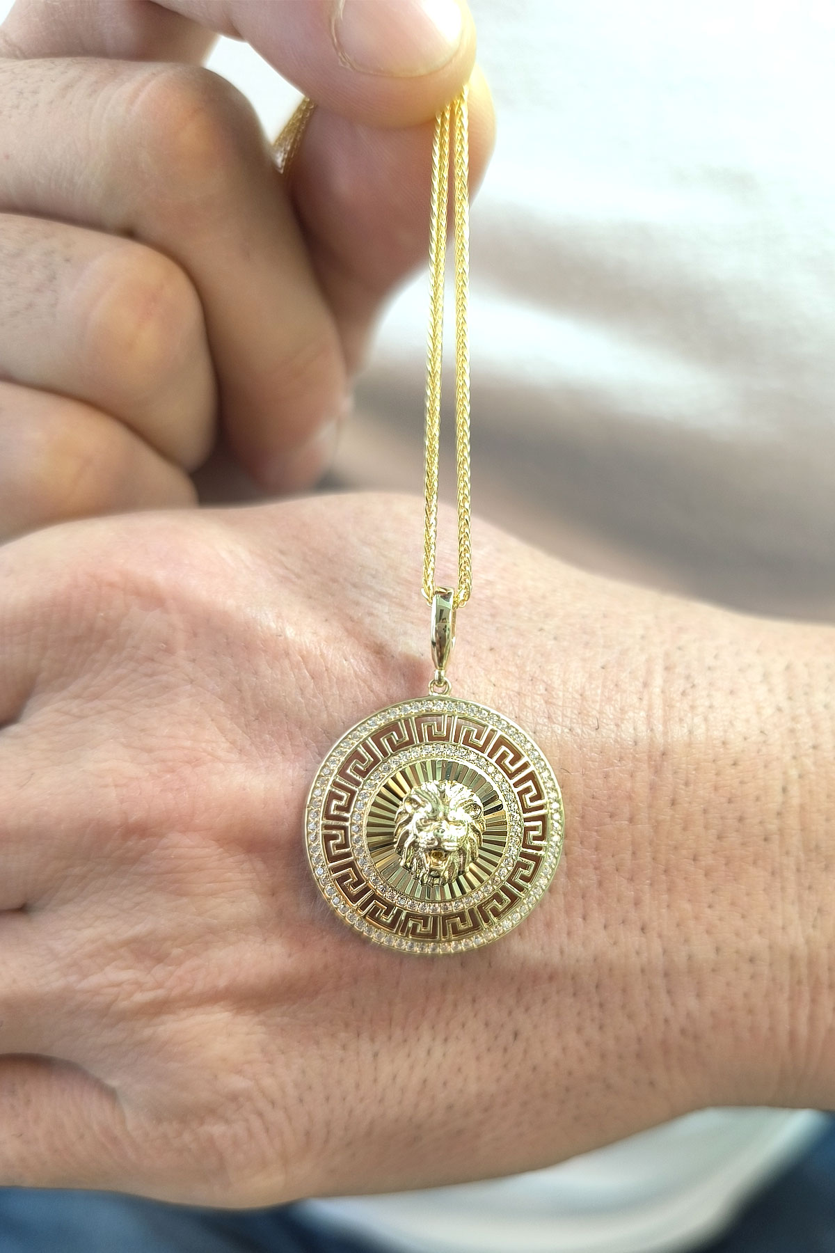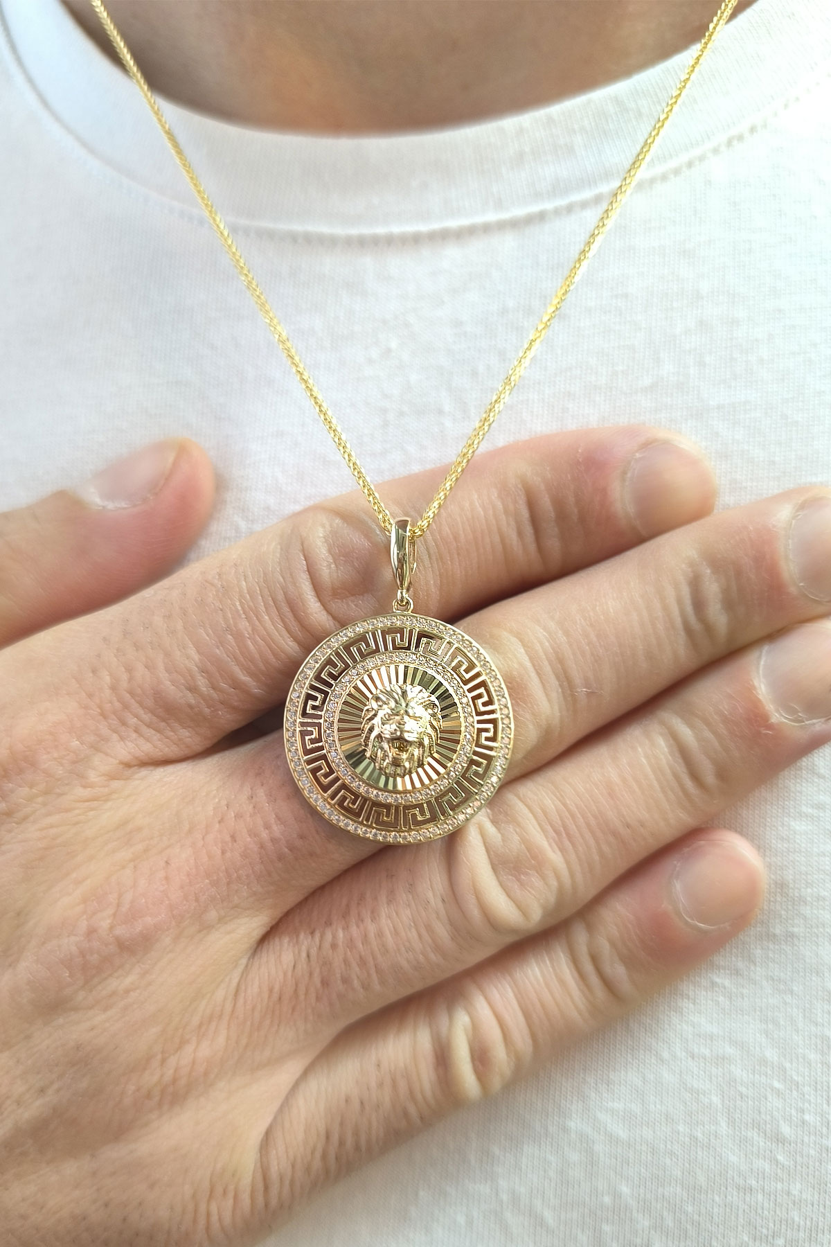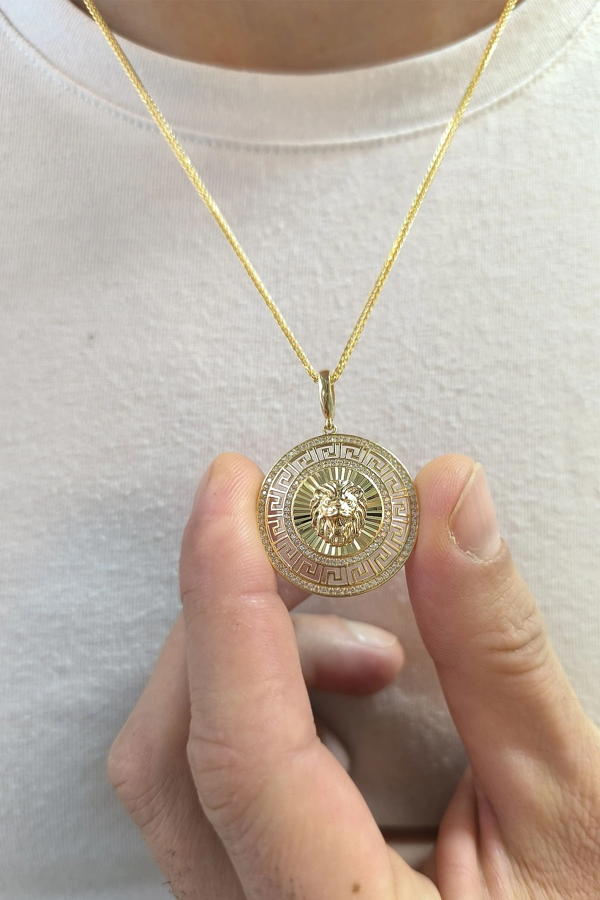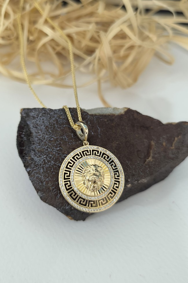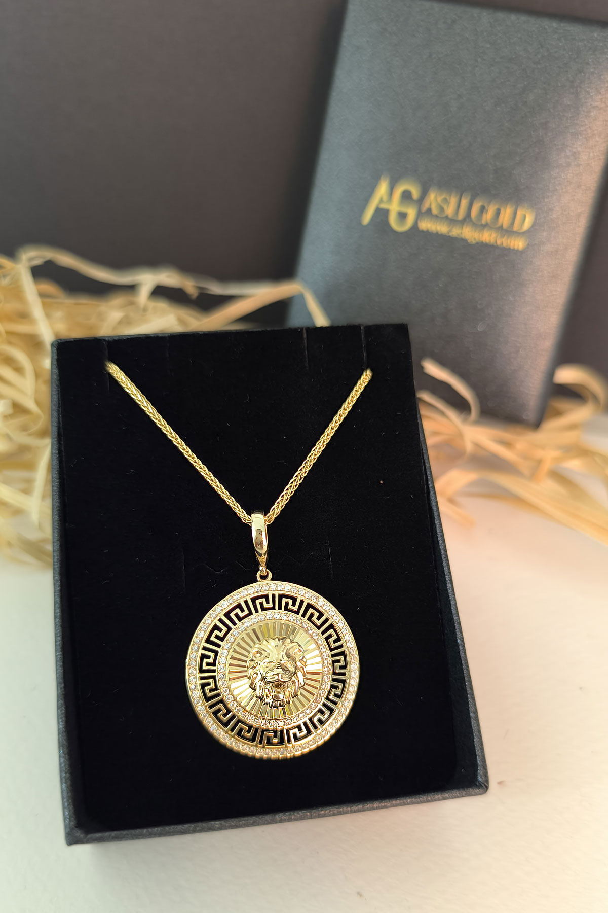 Modern Şehirli Tarz 60 Cm Boyunda Spiga Zinciri İle Oldukça Şık Bir Modele Sahip 8.70 Gr. Ağırlığında 14 Ayar Altın Beyaz Zirkon Taşlı Aslan Başı Erkek Kolye.