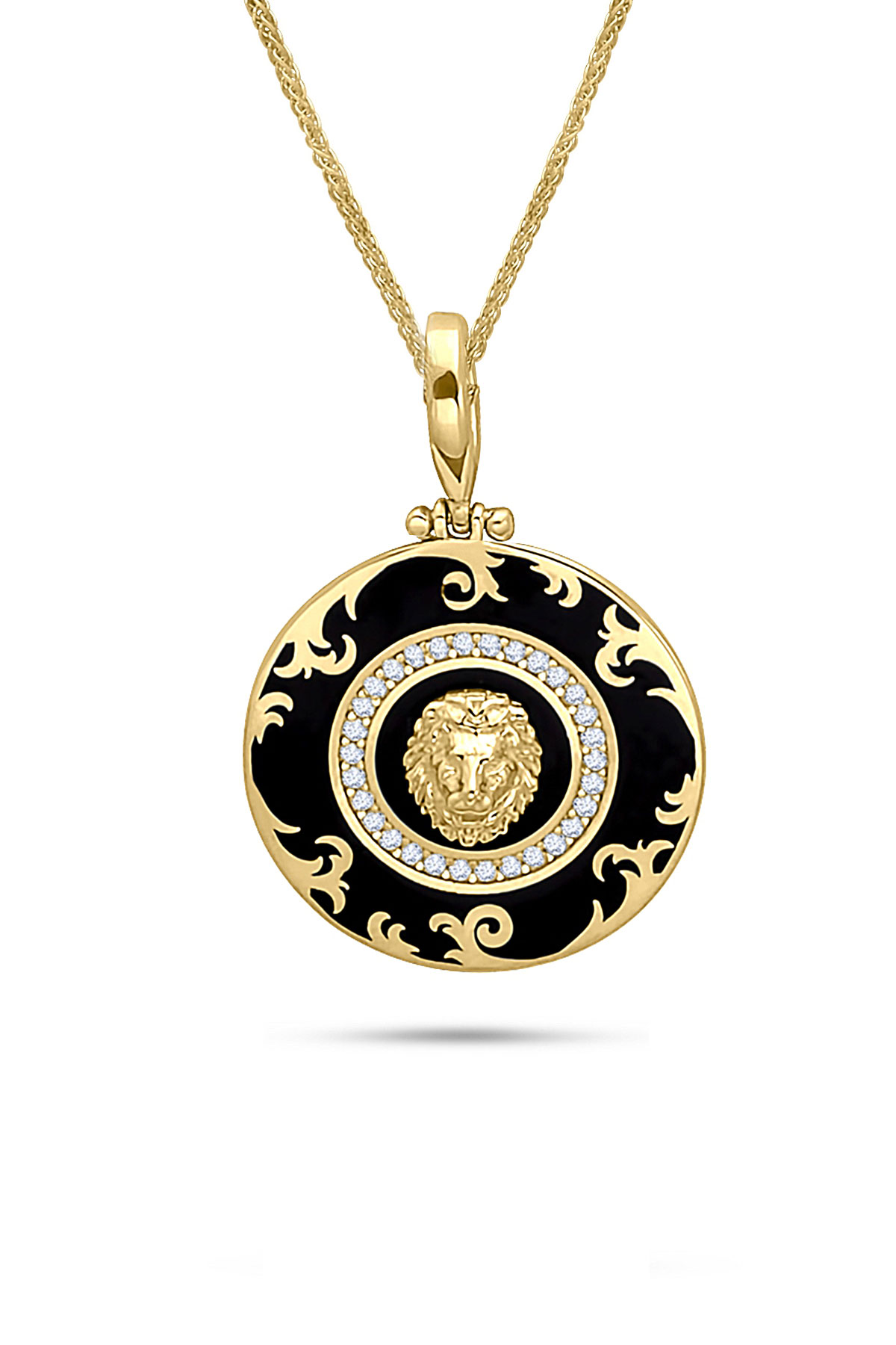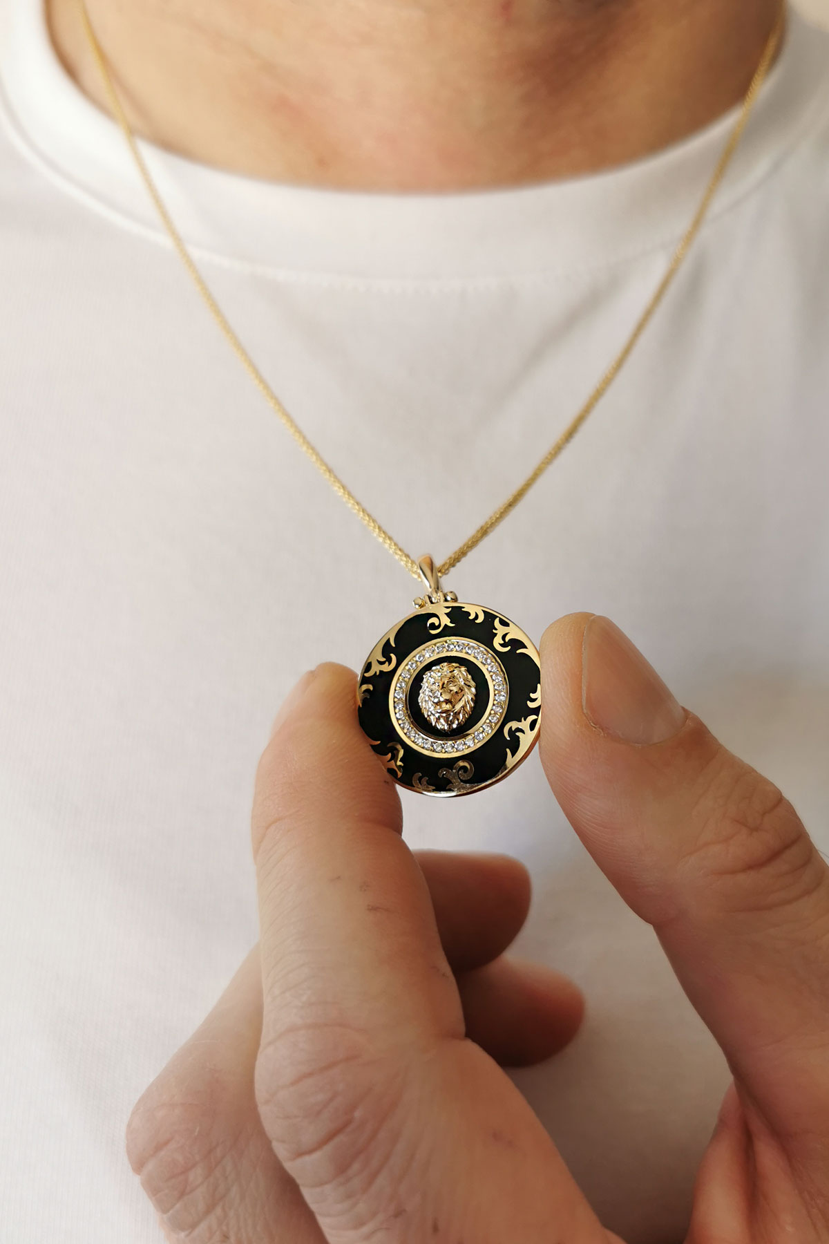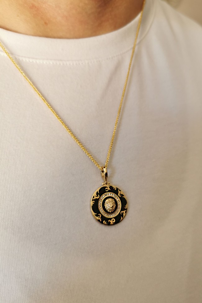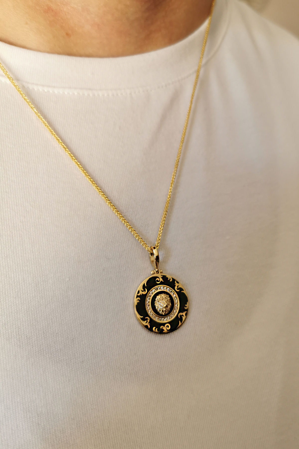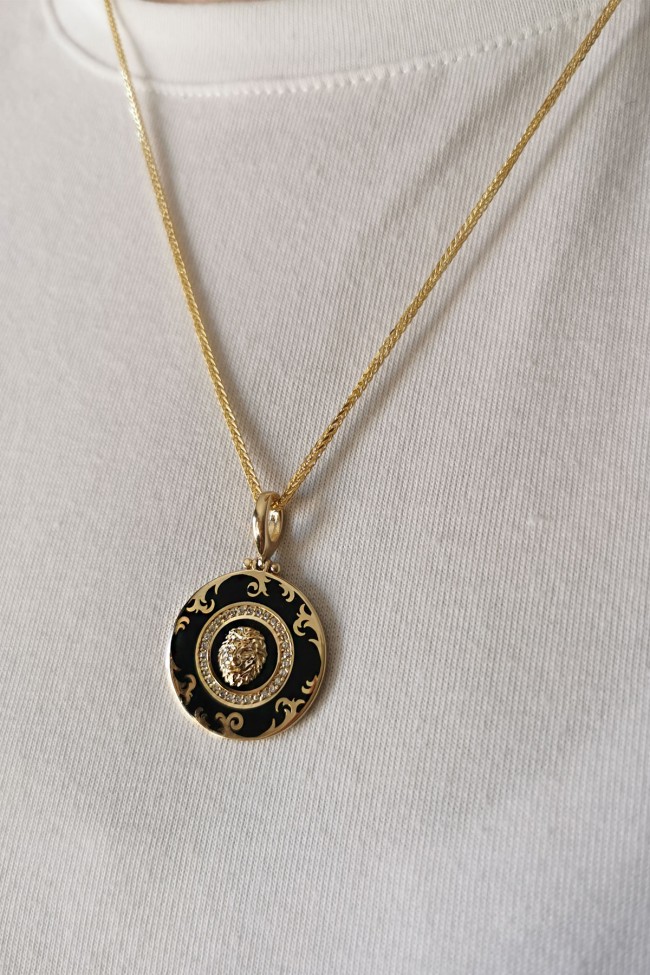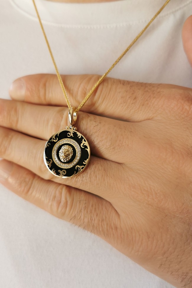 8.10 gr. 3 cm boyutunda 14 ayar altın siyah mineli aslan detaylı erkek kolye . Farklı kolyelerinizle bir arada kombine olarak kullanabileceğiniz harika ve gösterişli bir model.