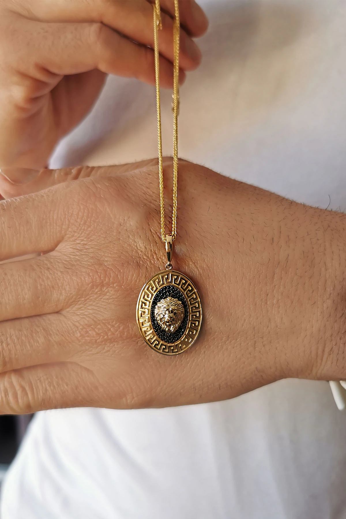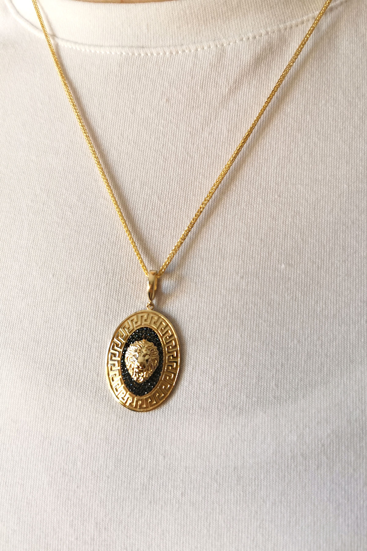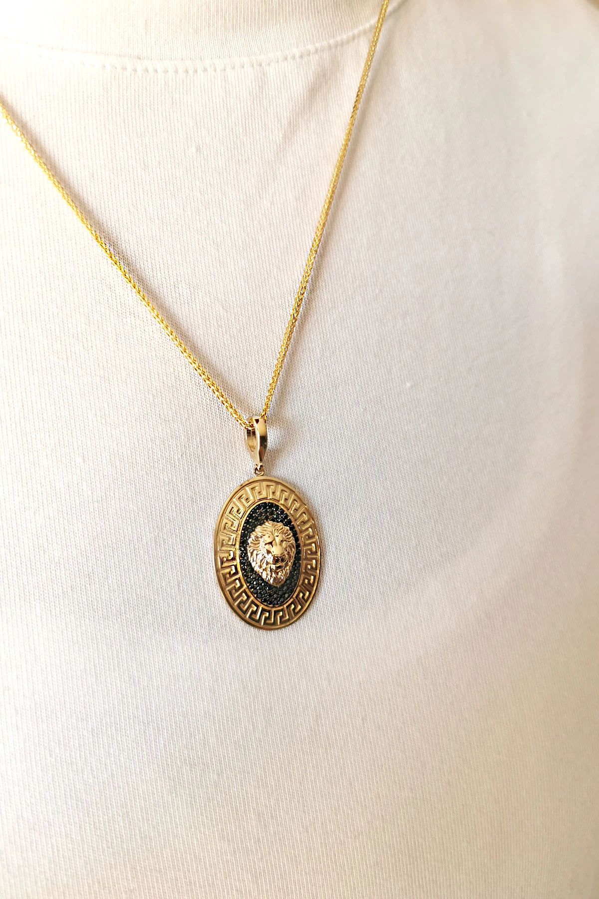 Şık ve farklı havaya sahip oval form 7.50 gr. 4 cm boyutunda aslan model siyah taşlı 14 ayar altın mine detaylı erkek kolye.