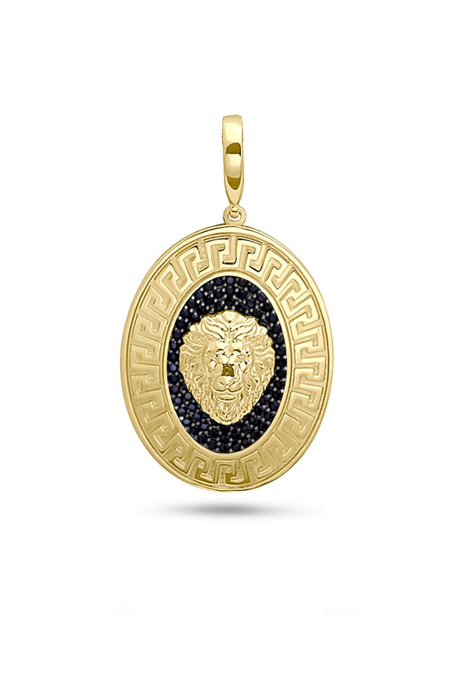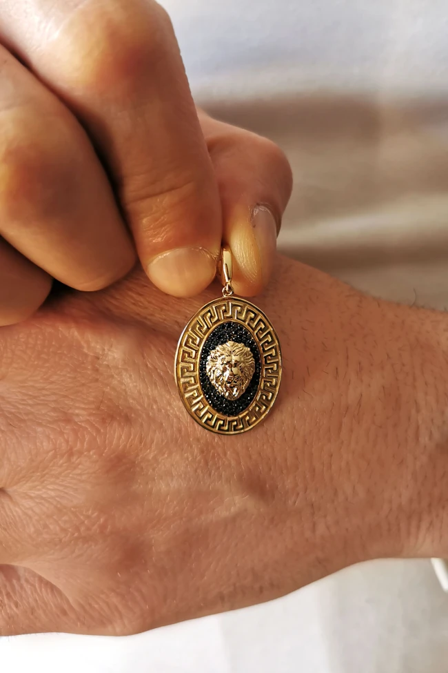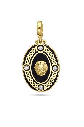 Şık ve farklı havaya sahip oval form 5.70 gr. 4 cm boyutunda aslan model siyah taşlı 14 ayar altın mine detaylı erkek kolye ucu.