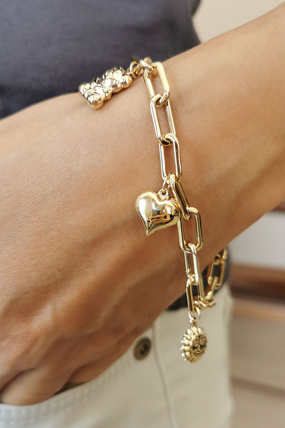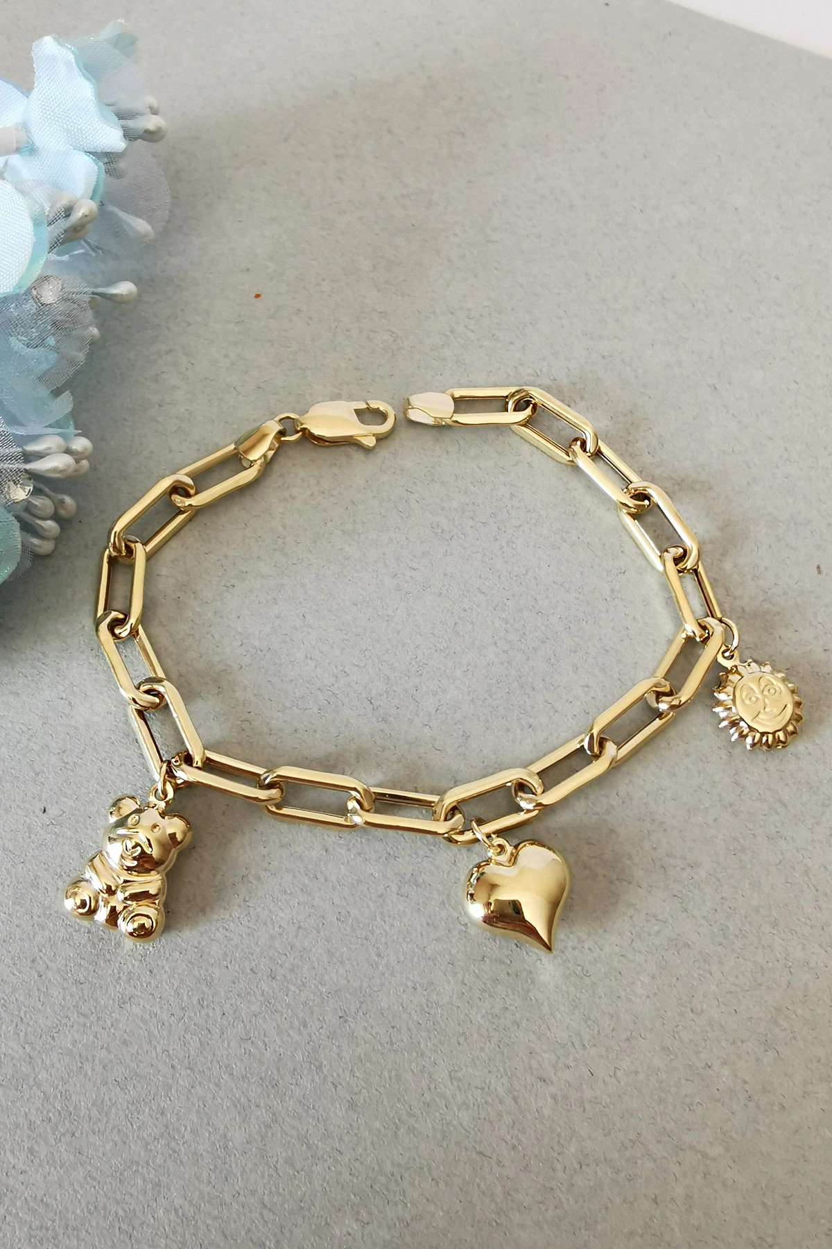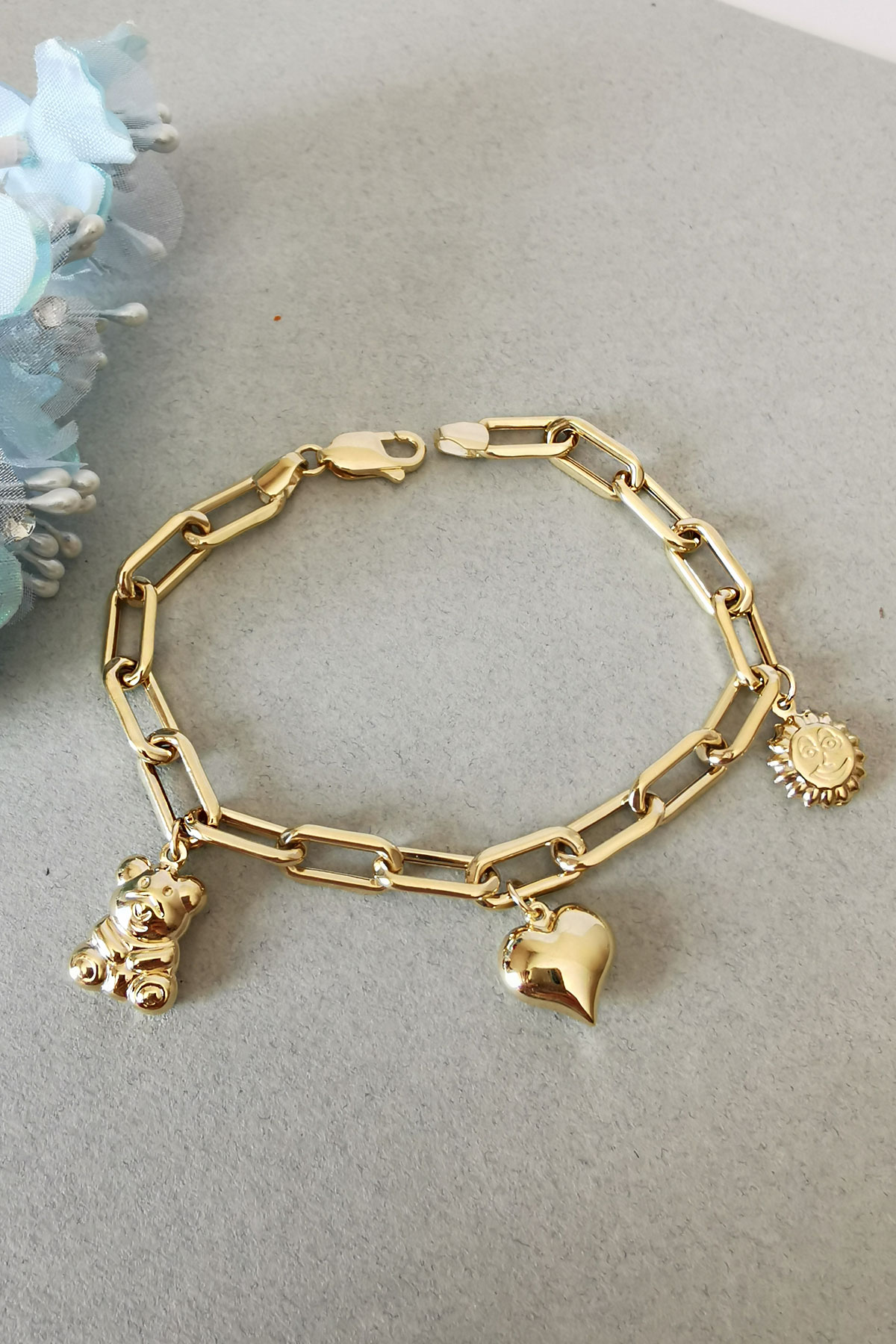 14 Ayar Spor Tüm Giyim Tarzlarınıza Hava Katacak 8.40 Gr Kalp, Ayıcık Ve Güneş Detaylı Günlük Kullanıma Uygun Ataç Model Charm Bileklik.