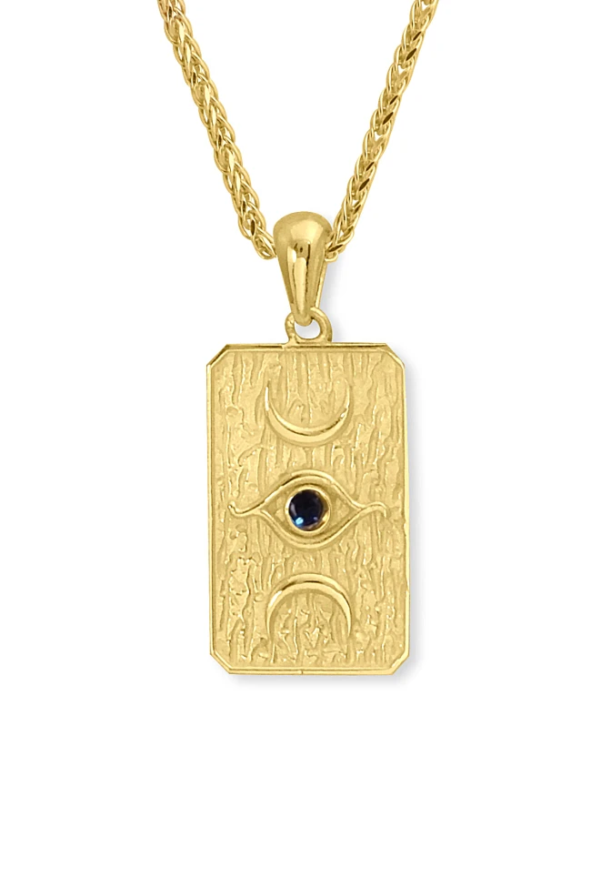 14 Ayar 4.20 gram ağırlığında 45 cm boyunda spiga ışıl ışıl zinciriyle tüm gün gömlek ve basic tişörlerinizle severek kullanacağınız, spor giyim tarzınıza da muhteşem uyum sağlayacak 2.5 cm otantik tasarım ay ve göz detaylı otantik dikdörtgen siyah taş detaylı kolye.