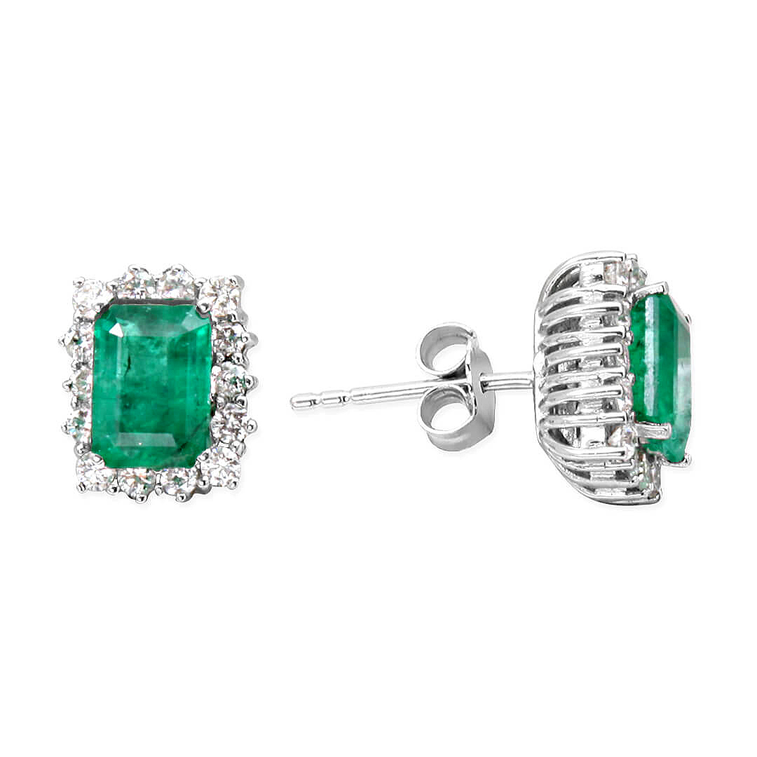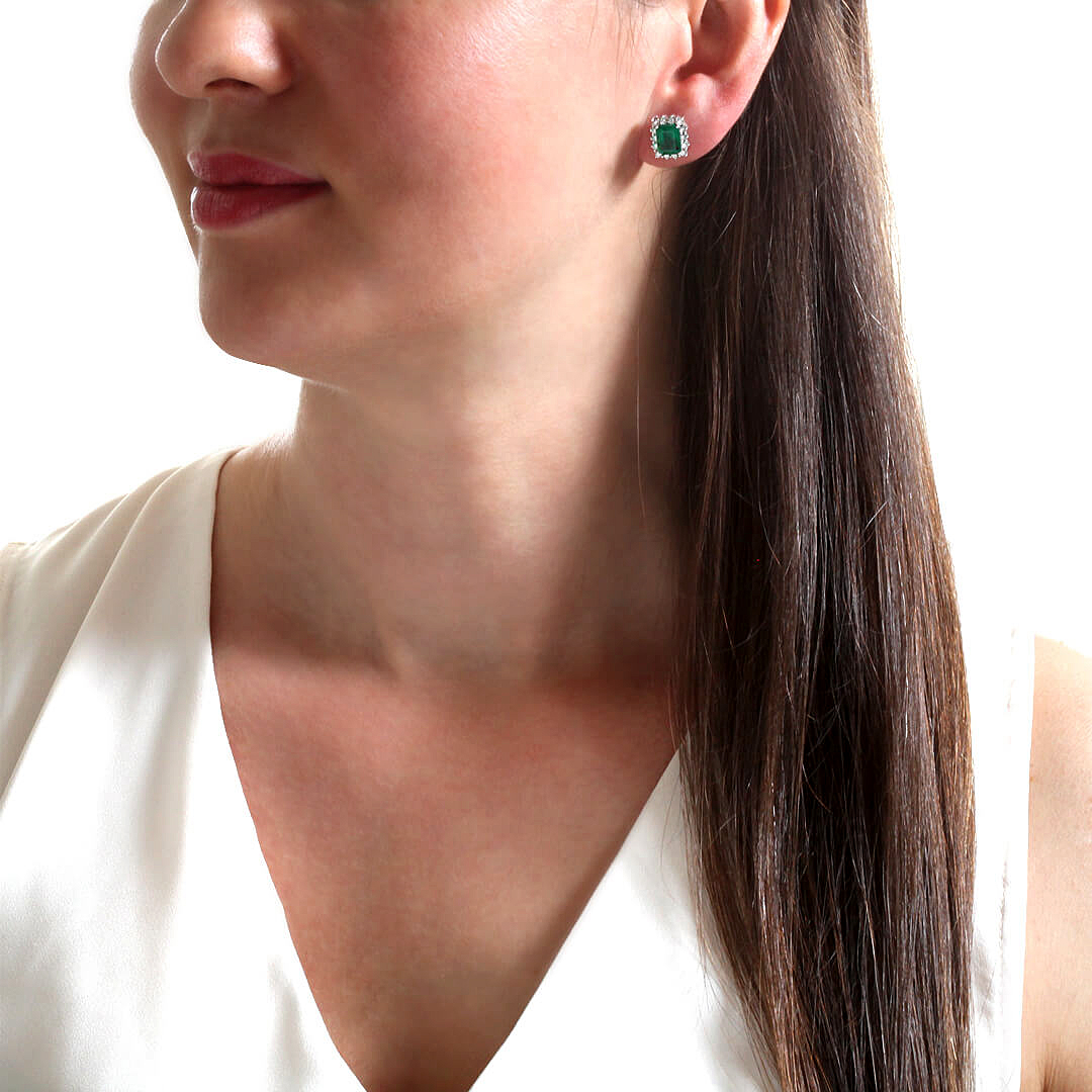 0.83 karat yuvarlak H-VS kesim pırlantalarla ve 2.96 Ct. baget kesim zümrütlü özel işçilik kalitesiyle taşlanmış el emeği, oldukça şık ve hoş bir modele sahip pırlanta 18 ayar beyaz altın zümrüt küpe.
