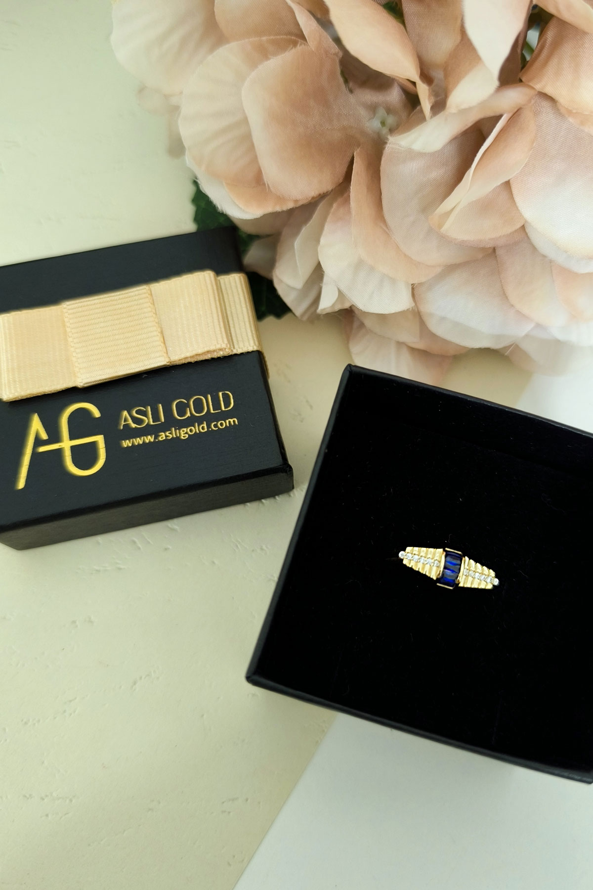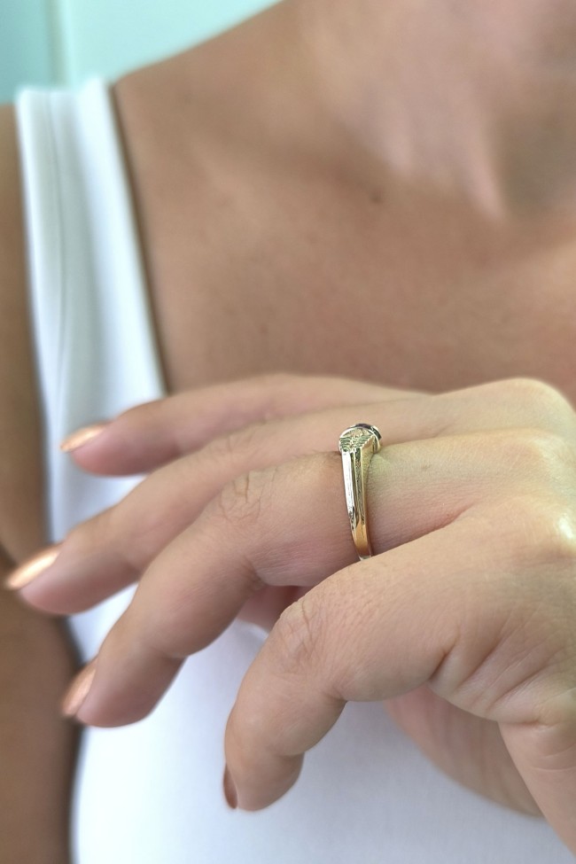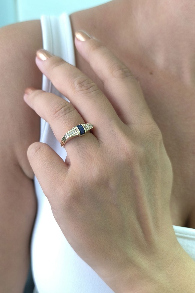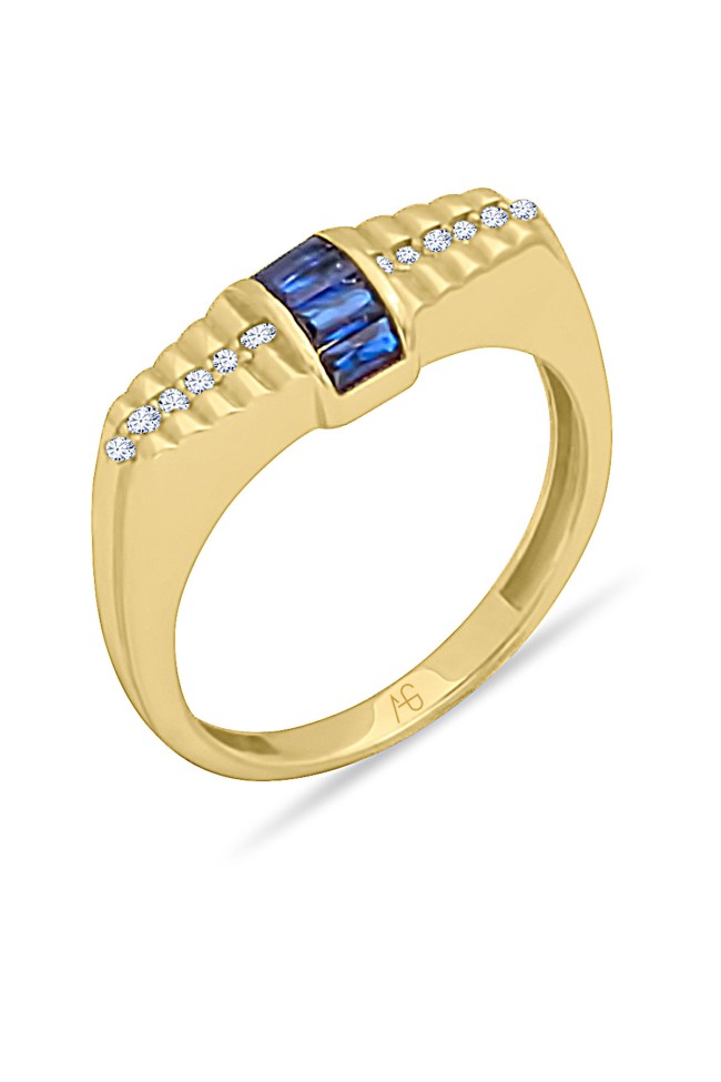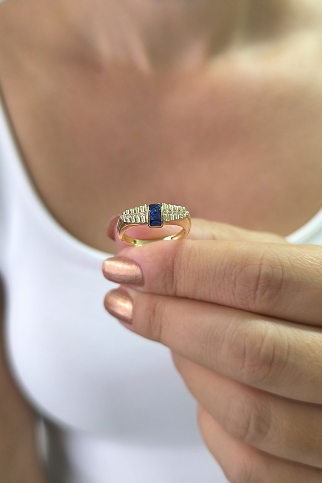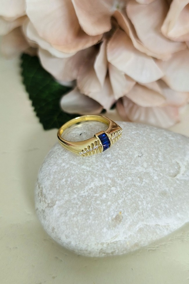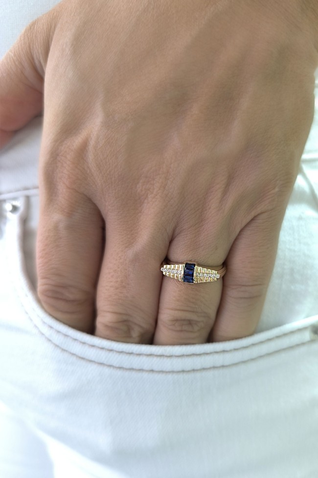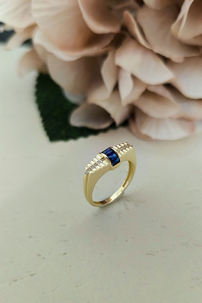 14 Ayar sarı altın lacivert mini baget taşlı tasarım günlük kullanıma uygun 2.85 gram ağırlığında kadın yüzük.